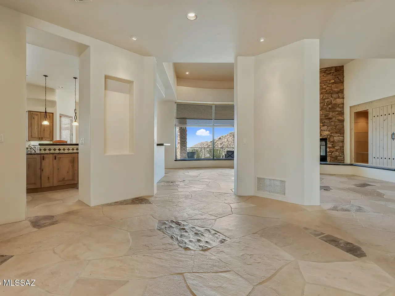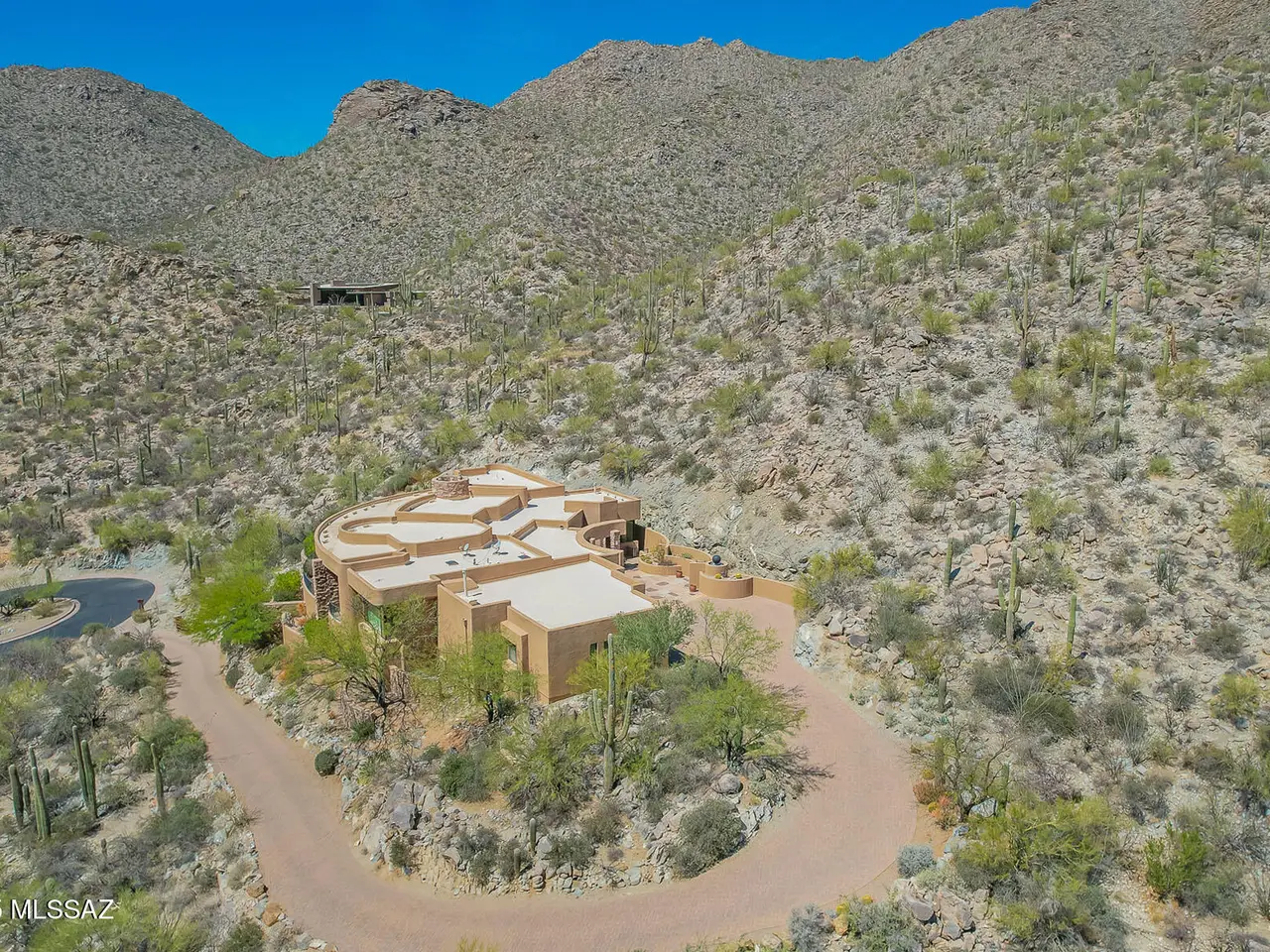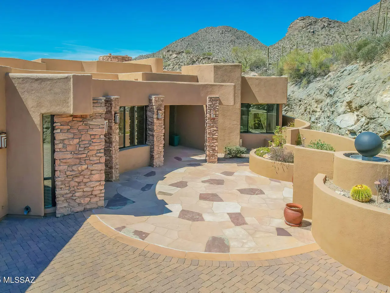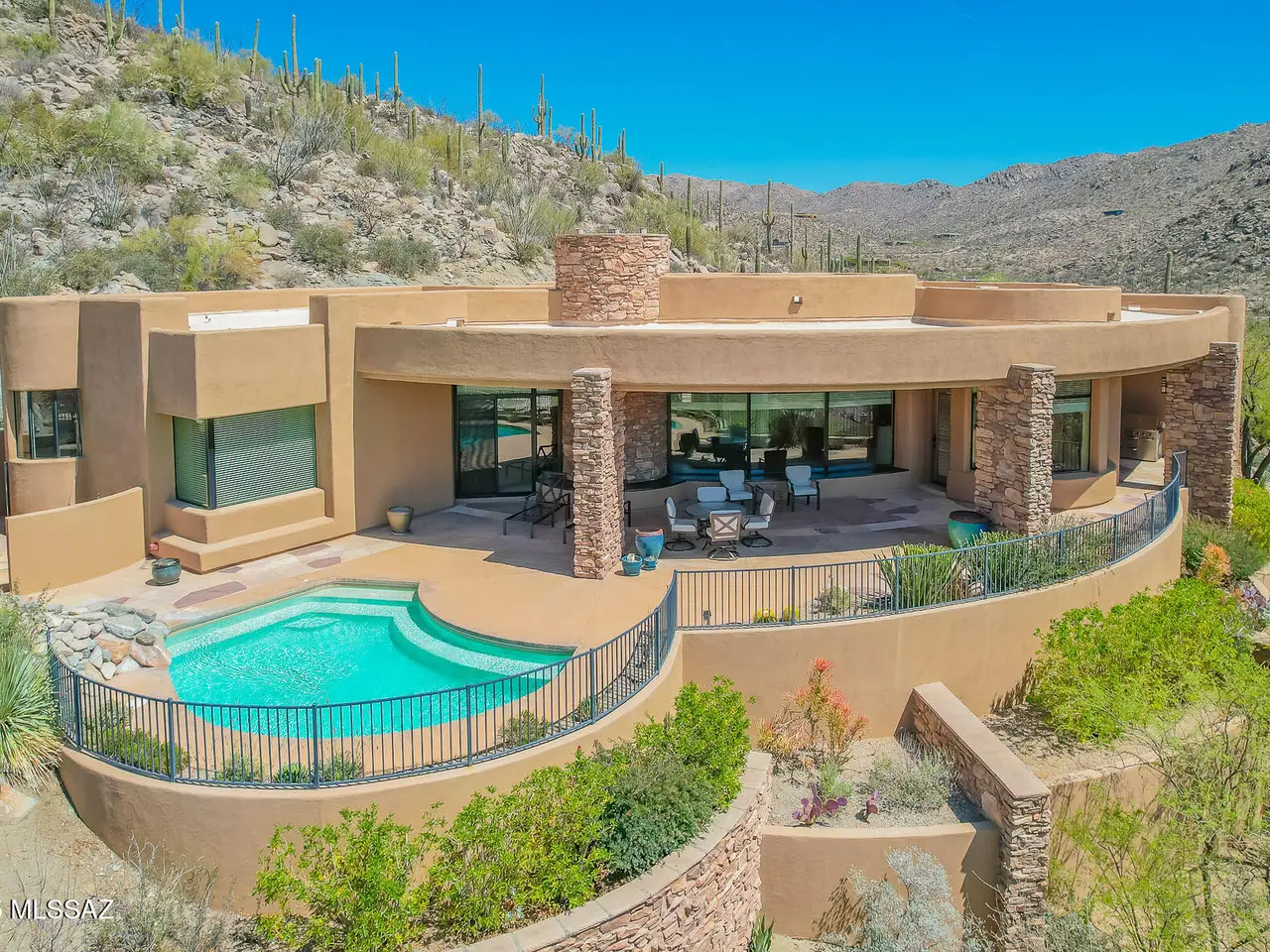 LUXURIOUS CUSTOM ESTATE sits high nestled against the Tortolita Mountains in the premier, guard gated community of Canyon Pass at Dove Mountain. Enjoy breathtaking panoramic views of the canyon, valley and mountains beyond... plus a sparkling, heated pool. Gated drive winds to a flagstone patio entrance with orbital water fountain. This 3, 665 sq ft residence affords 4 bedrooms and 4 full baths plus den/office. Large gathering room greets you with soaring ceilings, wall-to-wall view windows, corner stacked stone fireplace and custom art/media center. Formal dining area with views lies off a gourmet kitchen offering large island with prep sink, granite slab countertops, stainless/black appliances, built-in workstation and pantry, plus wood paneled Sub-Zero refrigerator/freezer, Dacor microwave and Asko dishwasher. Elegant Owner's suite accesses rear patio and hosts a stacked stone fireplace and luxury bath with granite covered vanity, jetted tub, circular tiled walk-in shower plus dual walk-in closets. Bedrooms 2 & 3 offer luxury en suite baths. Bedroom 4 lies off hall bath. Other luxury amenities include flagstone flooring, alderwood cabinets, curved walls & windows, stacked stone outdoor columns & interior accents, custom closets, skylights, art niches, recessed ceilings & clerestory windows. Extended laundry with sink, zoned heating/cooling and water heaters, plus 3-car extended garage with customized storage room. Security features include gated driveway, alarm and fire suppression. Retreat to a spectacular rear oasis with flagstone patio accents, wrought iron view fence, heated pool with rock waterfall plus breathtaking panoramic views. Dove Mountain is home to the Ritz-Carlton Resort & Spa, Gallery Golf & Sports Club, Golf Club at Dove Mountain, plus sport parks and hiking/biking trails.