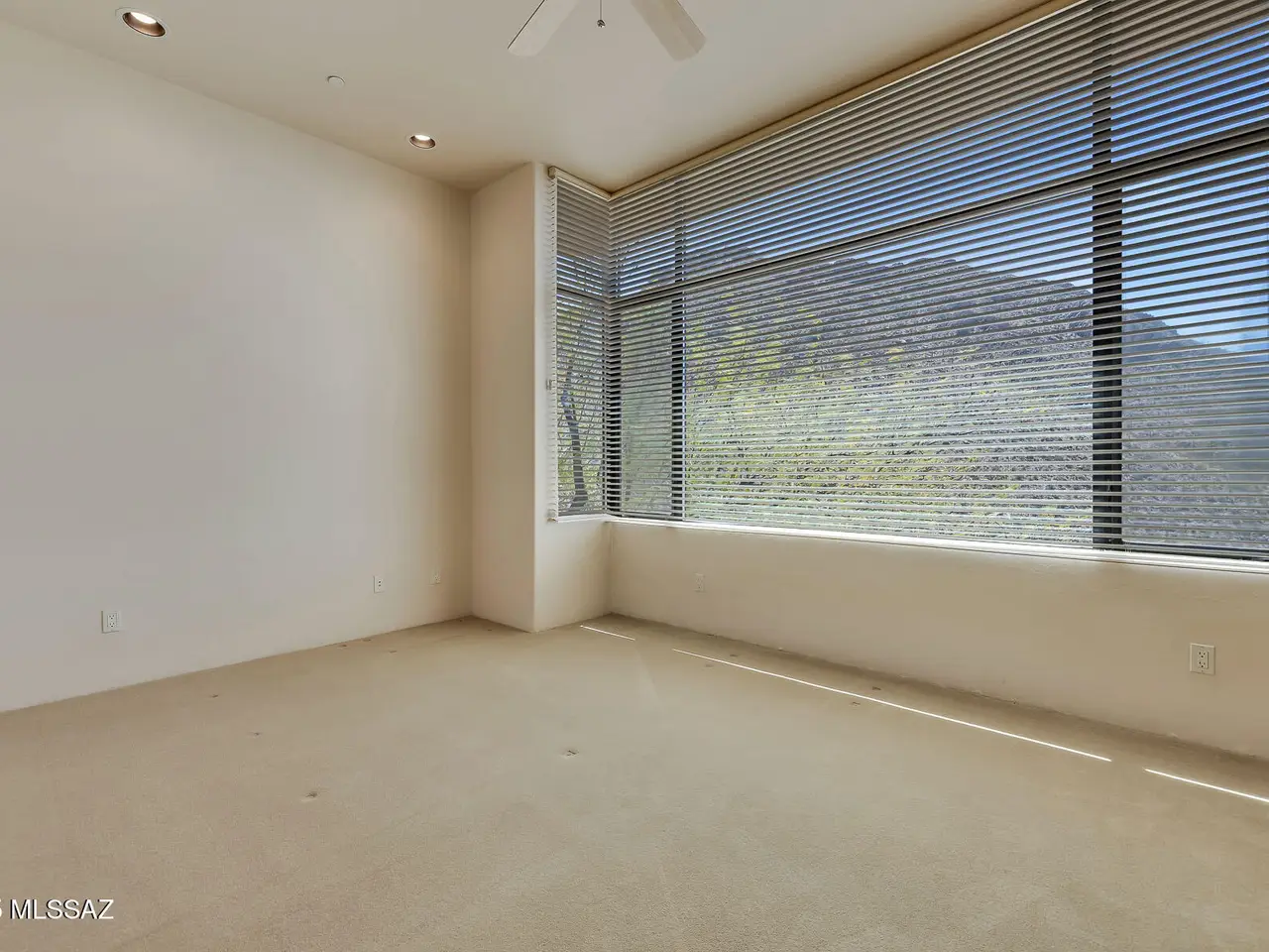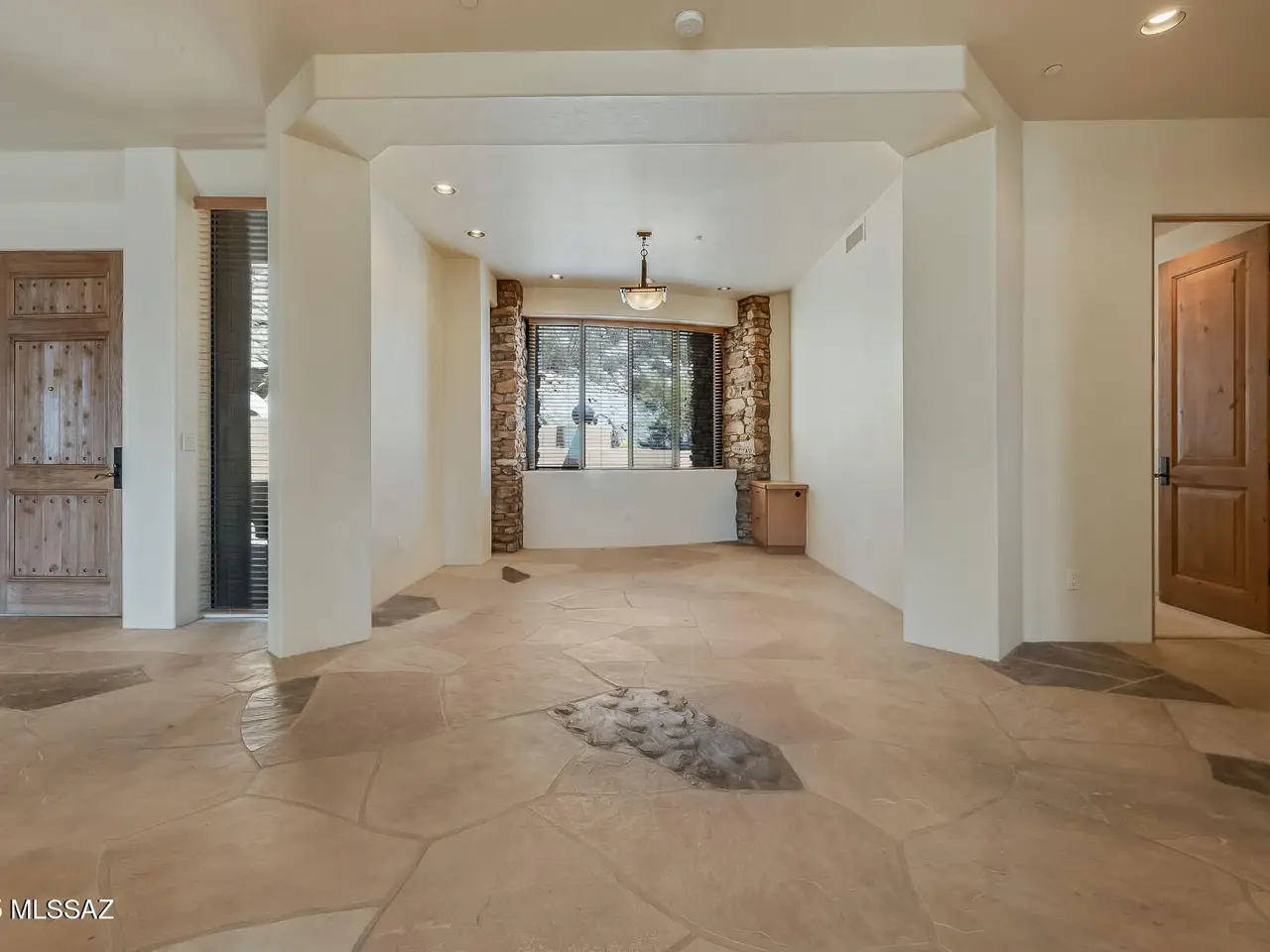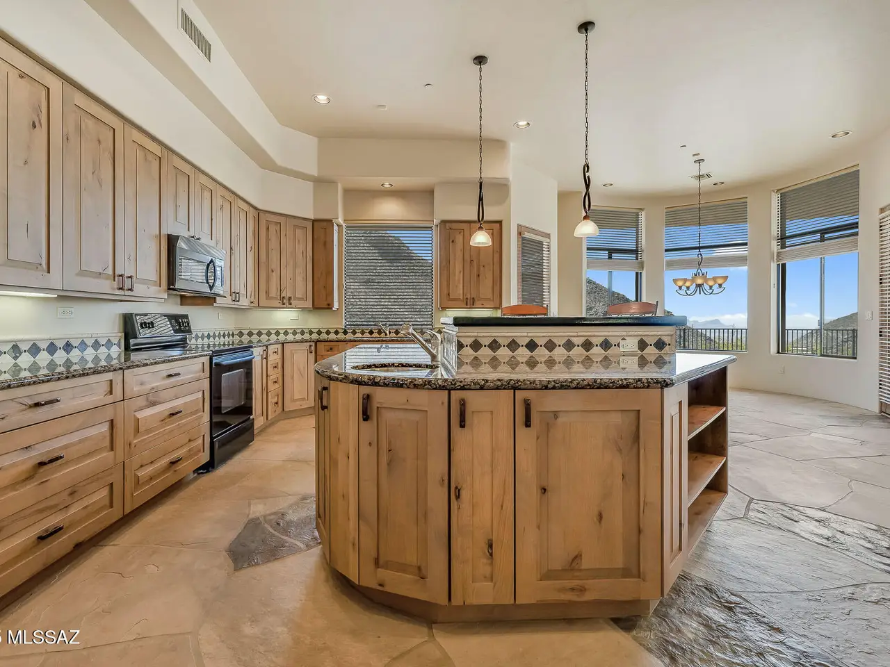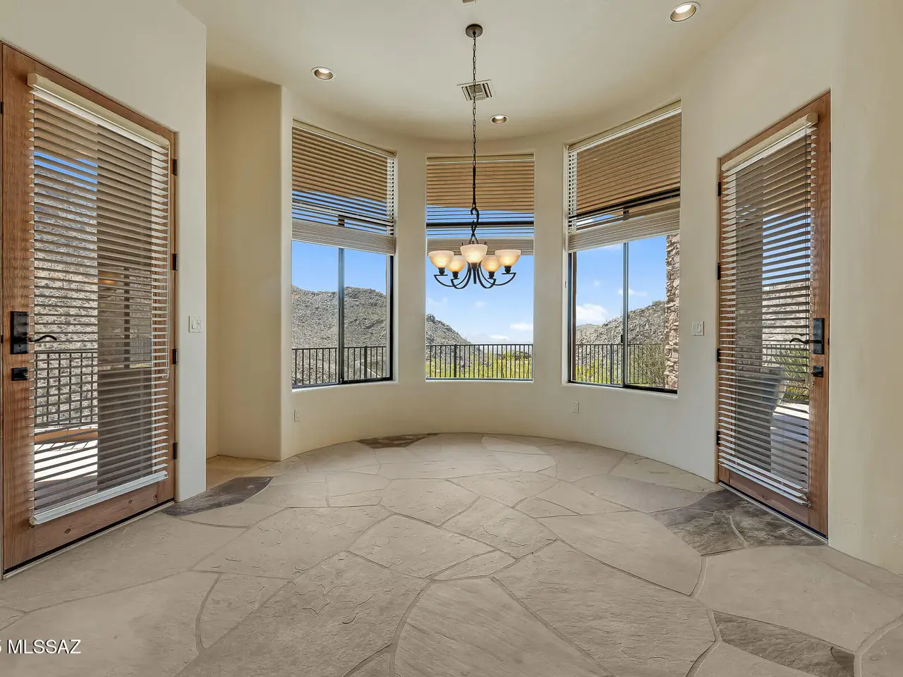 LUXURIOUS CUSTOM ESTATE sits high nestled against the Tortolita Mountains in the premier, guard gated community of Canyon Pass at Dove Mountain. Enjoy breathtaking panoramic views of the canyon, valley and mountains beyond... plus a sparkling, heated pool. Gated drive winds to a flagstone patio entrance with orbital water fountain. This 3, 665 sq ft residence affords 4 bedrooms and 4 full baths plus den/office. Large gathering room greets you with soaring ceilings, wall-to-wall view windows, corner stacked stone fireplace and custom art/media center. Formal dining area with views lies off a gourmet kitchen offering large island with prep sink, granite slab countertops, stainless/black appliances, built-in workstation and pantry, plus wood paneled Sub-Zero refrigerator/freezer, Dacor microwave and Asko dishwasher. Elegant Owner's suite accesses rear patio and hosts a stacked stone fireplace and luxury bath with granite covered vanity, jetted tub, circular tiled walk-in shower plus dual walk-in closets. Bedrooms 2 & 3 offer luxury en suite baths. Bedroom 4 lies off hall bath. Other luxury amenities include flagstone flooring, alderwood cabinets, curved walls & windows, stacked stone outdoor columns & interior accents, custom closets, skylights, art niches, recessed ceilings & clerestory windows. Extended laundry with sink, zoned heating/cooling and water heaters, plus 3-car extended garage with customized storage room. Security features include gated driveway, alarm and fire suppression. Retreat to a spectacular rear oasis with flagstone patio accents, wrought iron view fence, heated pool with rock waterfall plus breathtaking panoramic views. Dove Mountain is home to the Ritz-Carlton Resort & Spa, Gallery Golf & Sports Club, Golf Club at Dove Mountain, plus sport parks and hiking/biking trails.