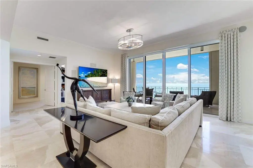 Perched above the shimmering Gulf waters, this exceptional 3600 a/c sq ft, 3-bedroom, 3.5-bath residence offers expansive living and family room areas, a spacious den, and soaring 11-foot ceilings-available only in select units. Floor-to-ceiling impact sliders and windows frame the breathtaking panoramic views of the Gulf of America, the 10,000 Islands, and Marco Island. Designed for both comfort and elegance, this home features a rare private 2-car air conditioned garage located directly under the building-an uncommon and highly sought-after convenience. With luxurious open living spaces and sweeping water views, this residence is a true coastal retreat.