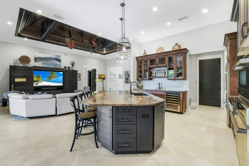Stunning 5-bedroom, 4-bath custom home just half a mile to South Beach access and minutes from shopping, dining, and the movie theater. This beautifully designed custom built residence features soaring ceilings, impact windows and doors, travertine tile throughout, and a spacious split floor plan with a primary suite plus den on one side, and three en-suite guest bedrooms on the other. The gourmet kitchen includes a gas cooktop, large island with abundant storage, walk-in pantry, and built-in bar with wine cooler. The living area impresses with 90-degree sliders and a custom wood-inlaid decorative ceiling. The primary suite offers corner sliders, his-and-her California closets, a spa-style bath with large walk-in shower, dual vanities, and private commode. Step outside to a spacious lanai with outdoor kitchen, electric shutters, and a private pool and spa with 3 waterfalls, surrounded by lush privacy hedges. Also features a pool bath, epoxy-coated garage floors with custom storage, and both a circular and side driveway for added convenience. Turnkey furnished and ready to move right in!