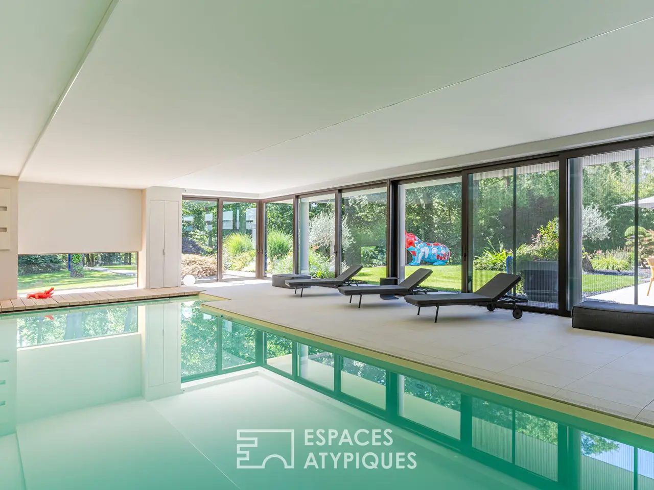 Nestled in a privileged setting on the outskirts of Haguenau, this architect-designed villa of 905 m², built in 2014, unfolds in complete privacy on a 7,500 m² landscaped park. With a distinctly contemporary inspiration, it stands out for its very high-end finishes and perfect integration into its natural surroundings. The ground floor is organized around a majestic 118 m² living space, where natural light enhances the generous volumes. It adjoins a 47 m² Bulthaup dining kitchen accompanied by a large wine cellar. From the living room, a bold and sculptural opening leads to an immersive cocoon: a private cinema room for unforgettable evenings. This level also features a luxurious master suite of over 90 m², complete with a dressing room and bathroom. The choice of noble materials and meticulous attention to detail reflect a rare level of excellence. A monumental staircase leads to the upper floor, which distributes the sleeping areas with five suites, two offices, a laundry room, and a dojo. Complementing this, a 200 m² wellness area reminiscent of a luxury hotel spa includes an indoor pool, sauna, hammam, and gym, creating a living space designed for absolute comfort. The outdoor spaces have been conceived as a natural extension of the home. Adorned with bicentennial olive trees and centennial Japanese maples, the carefully landscaped park and its large 100 m² terrace invite tranquility. A green roof and solar panels emphasize an environmentally conscious design. Situated in a quiet area near a forest, the villa benefits from quick access to shops and schools. This exceptional property, a signature of prestigious real estate, embodies a rare combination of architectural luxury and constant dialogue with nature. A truly unique home offering an extraordinary living experience. REFERENCE: 1656 Additional Information: 10 rooms 6 bedrooms 3 bathrooms 4 shower rooms 1 floor Land area: 7,500 m² Parking: 6 spaces Property tax: €5,889 Energy Performance Diagnostics: Primary energy consumption: B – 74 kWh/m²/year Extremely energy-efficient property CO₂ emissions: 2 kg CO₂/m²/year Very low CO₂ emissions Estimated average annual energy costs for standard use, indexed for 2021, 2022, 2023: €4,790 – €6,530 (including subscription) Agency Fees: All fees are VAT-inclusive and borne by the seller Mediator: Mediation Franchise-Consumers www.mediation-franchise.com 29 Boulevard de Courcelles, 75008 Paris Information on risks related to this property is available at: www.georisques.gouv.fr