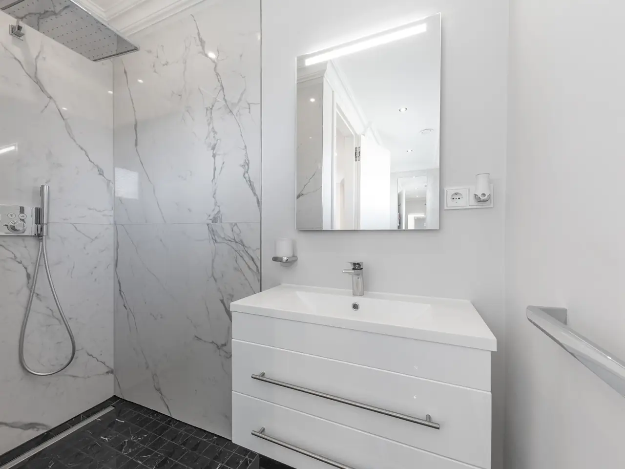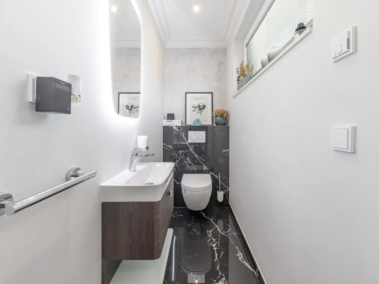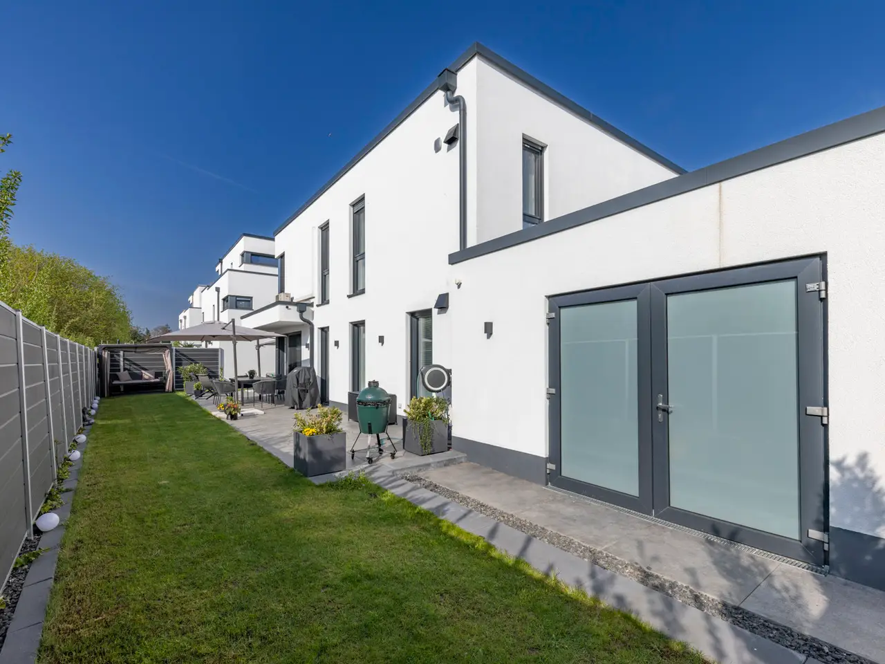 Exclusive home with modern furnishings and spacious garden area. For sale is a new detached house built in 2022 and presented in first-class condition. This property offers a generous living space of around 167 m² on a leasehold plot of around 354 m². With a variety of high-quality features, this offer is aimed at buyers who value quality, modern fittings and comfort. Upon entering the house, you are greeted by a large entrance hall, which is equipped with a built-in wardrobe with large mirrored surfaces. A spacious and modern guest WC completes this area. On the first floor you will also find a utility room/technical room and a timeless fitted kitchen. The kitchen is equipped with high-quality appliances (Miele, Siemens, Liebherr) and has a Quooker that supplies hot, cold and sparkling water. The worktop and bar counter are fitted with real granite. The light-flooded living and dining area offers plenty of space and is equipped with elegant furniture that can be taken over. Floor-to-ceiling windows with triple glazing ensure a pleasant flood of light. The ventilation system and 2 air conditioning units ensure a constant room temperature and fresh air. Electric external roller shutters and an alarm system with video surveillance contribute to a high standard of security. The underfloor heating guarantees cozy warmth and an excellent living climate. On the upper floor, a large hallway leads to two of the three bedrooms. These are located at the front of the house and share a modern bathroom with shower. The master bedroom impresses with an adjoining dressing room with fully mirrored fittings and a spacious en-suite bathroom equipped with a bathtub, bidet and shower. The outdoor area boasts an L-shaped terrace with a lounge area and a projector. A dining set and a barbecue area invite you to enjoy sociable evenings. The well thought-out garden architecture offers maximum privacy. A photovoltaic system ensures sustainable energy generation (incl. feed-in to the public grid for a fee). The large double garage not only offers space for vehicles, but is also tiled and equipped with an electric sectional door, direct access to the garden and a wallbox. This detached house is located in a privately accessible street. The entire house can be managed efficiently thanks to the modern bus system control. Unrestricted living comfort and high-quality fittings make this offer a remarkable opportunity for potential buyers. For further information or to arrange a viewing appointment, please do not hesitate to contact us. Take the opportunity to acquire this as-new and superbly equipped family home.