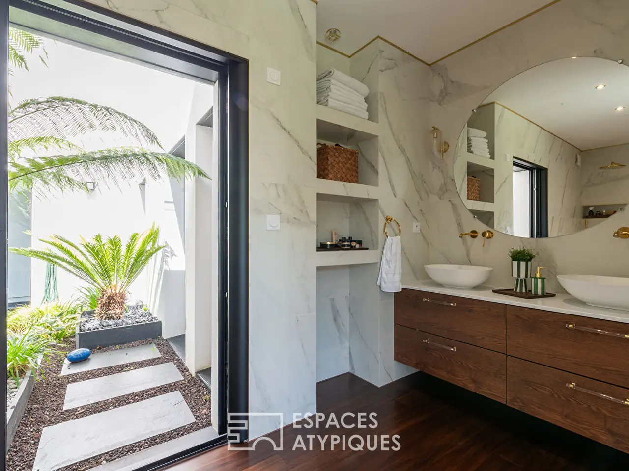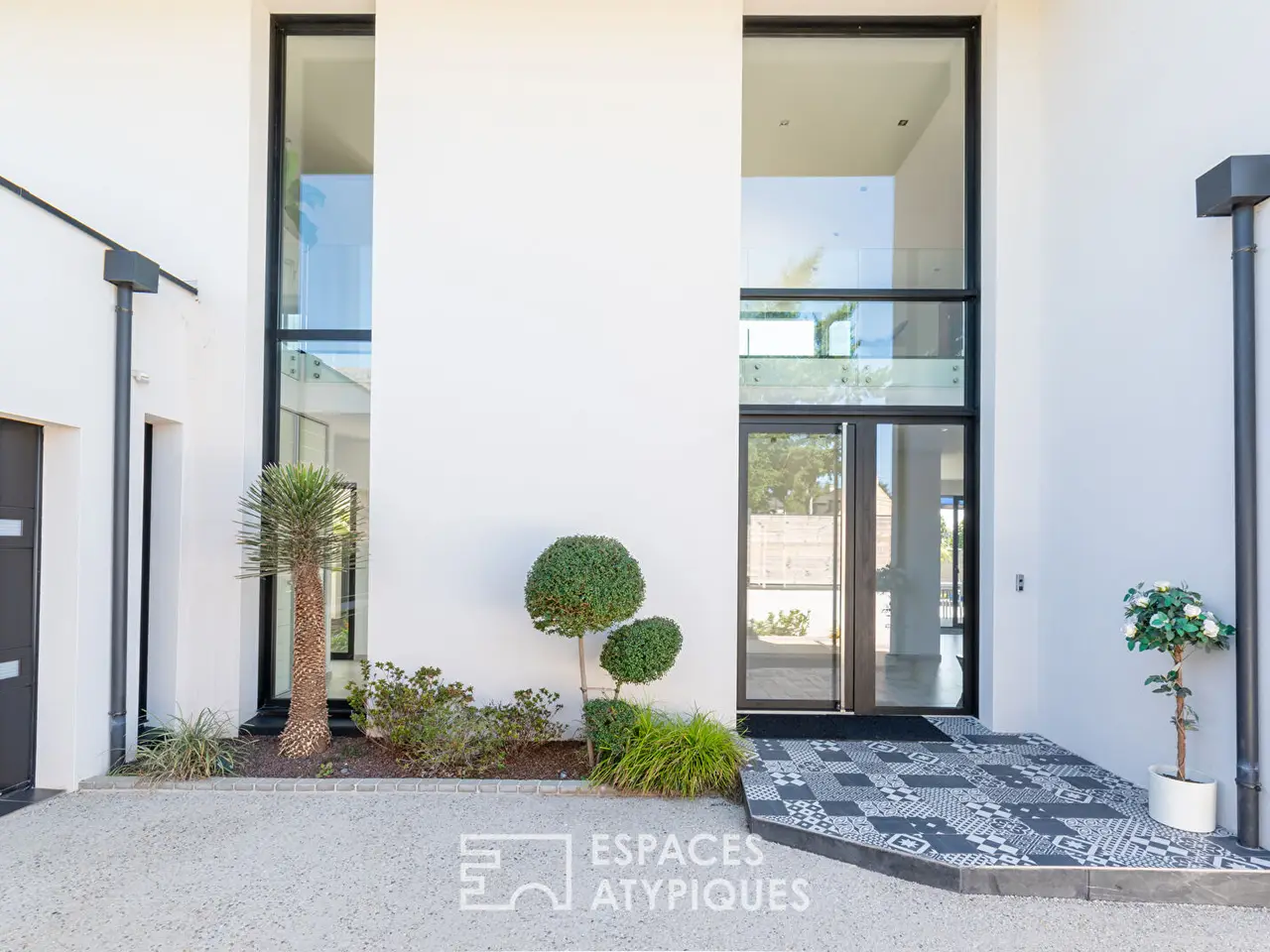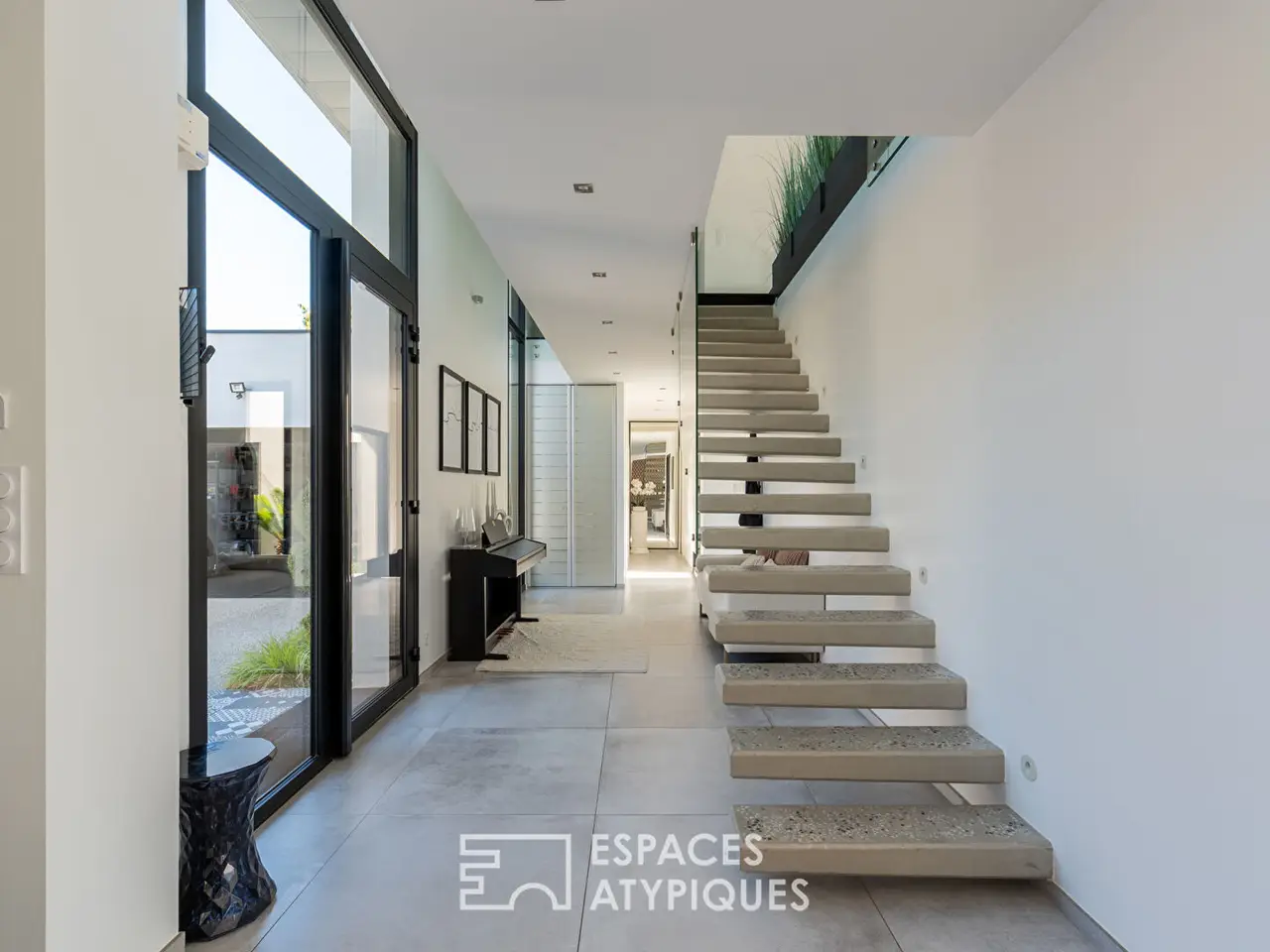 Just ten minutes from the outskirts of Rennes, this 252 sqm contemporary villa located in the town of Melesse boasts elegant, designer architecture on a 600 sqm plot. Inspired by the Californian style, it combines clean lines, beautiful volumes, and large glass openings.Its layout offers optimal comfort and a playful character thanks to its landscaped exteriors and swimming pool. The garden level is organized around a vast and bright living space combining a fitted and equipped open-plan kitchen, a dining room, and a living room. The interior landscaped patio offers a beautiful breath of fresh air and extends the beautiful fluidity of the space. The contemporary kitchen and its scullery combine design and functionality. This first level also features a master suite with a dressing room and a shower room, as well as a junior suite with a bathroom and storage. A laundry room and a tiled garage provide practicality and comfort for everyday use. The upper floor houses two junior suites with bathrooms, a mezzanine opening onto the living room, and a terrace, providing independence and privacy for everyone. Outside, the landscaped garden, not overlooked, offers a peaceful living environment.The elegantly designed swimming pool extends into a large terrace, partially protected by an awning, ideal for enjoying the beautiful weather. A dedicated technical room facilitates maintenance. The architecture highlights the permanent dialogue between interior and exterior, in a sought-after residential environment. Technical elements: home automation, high-efficiency ventilation, adjustable sunshades, optimized insulation and orientation contribute to the performance of this recent construction.A unique property, designed as an inhabited work, which combines refinement, modernity, and the art of living, close to all services and shops.REF. 12403Additional information* 6 rooms* 4 bedrooms* 1 bathroom* 3 shower rooms* 1 floor in the building* Outdoor space : 597 SQM* Parking : 3 parking spaces* Property tax : 2 772 €Energy Performance CertificatePrimary energy consumptiona : 35 kWh/m2.yearHigh performance housing*35kWh/m2.year1*kg CO2/m2.yearA*B*C*D*E*F*GExtremely poor housing performance* Of which greenhouse gas emissionsa : 1 kg CO2/m2.yearLow CO2 emissions*1kg CO2/m2.yearA*B*C*D*E*F*GVery high CO2 emissionsEstimated average annual energy costs for standard use, indexed to specific years 2021, 2022, 2023 : between 590 € and 850 € Subscription IncludedAgency feesThe fees include VAT and are payable by the vendorMediatorMediation Franchise-Consommateurswww.mediation-franchise.com29 Boulevard de Courcelles 75008 ParisInformation on the risks to which this property is exposed is available on the Geohazards website : www.georisques.gouv.fr