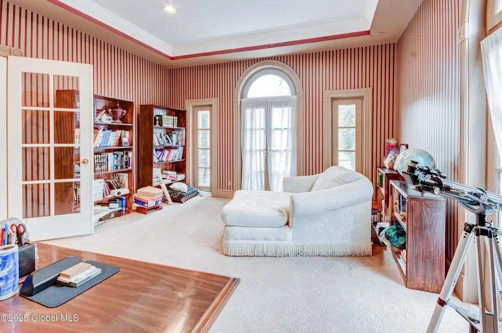 Step into this elegant & luxurious custom home set on a lovely 2.19-acre lot with beautiful mountain views. Located in the prestigious Sage Estates Gated Community in Loudonville. Property features a three-car garage. French doors open to a classic columned veranda. Upon entering, you'll be welcomed by a grand foyer with a magnificent staircase, marble floors, & a stunning crystal chandelier. The spacious kitchen is perfect for family gatherings & with over 8,000 sq ft of living space, it's an entertainer's dream. Main level also offers a primary suite, dining room, living rooms & offices while the upper level includes three additional primary suites with balconies. The finished basement boasts a home theater, gym, bedroom, bonus rooms & two full bathrooms. HOA covers gate, pond, tennis courts. Must see!