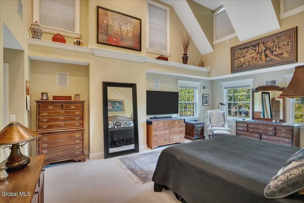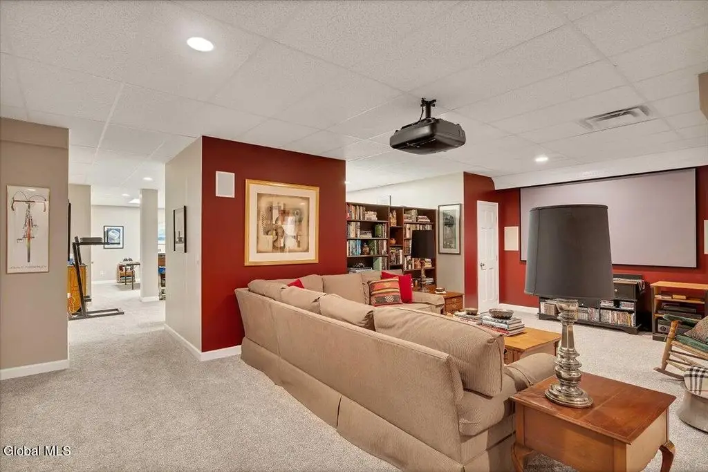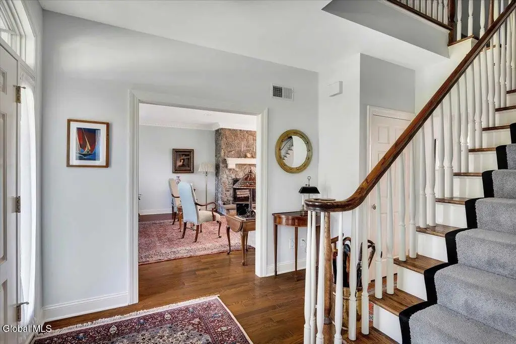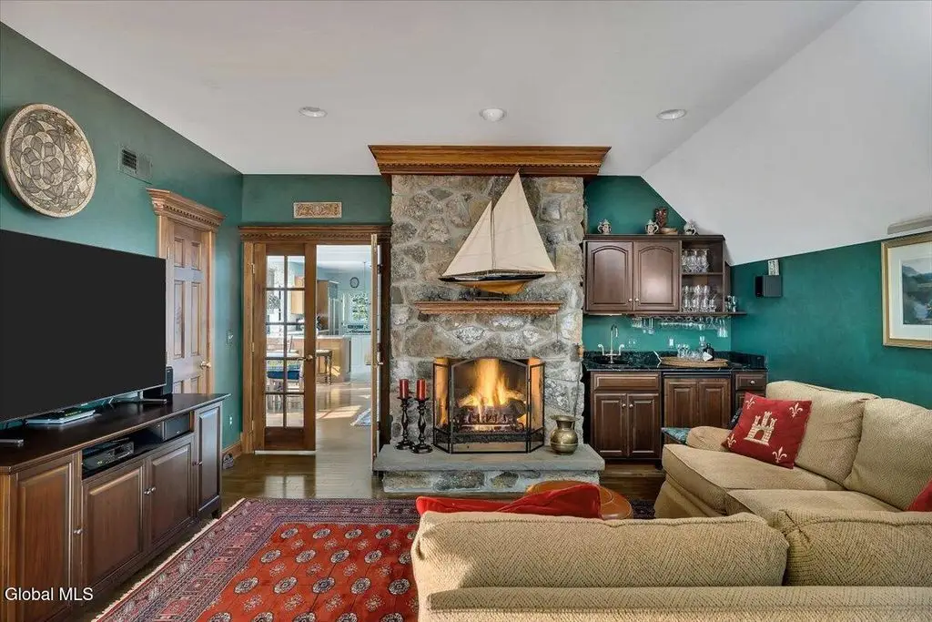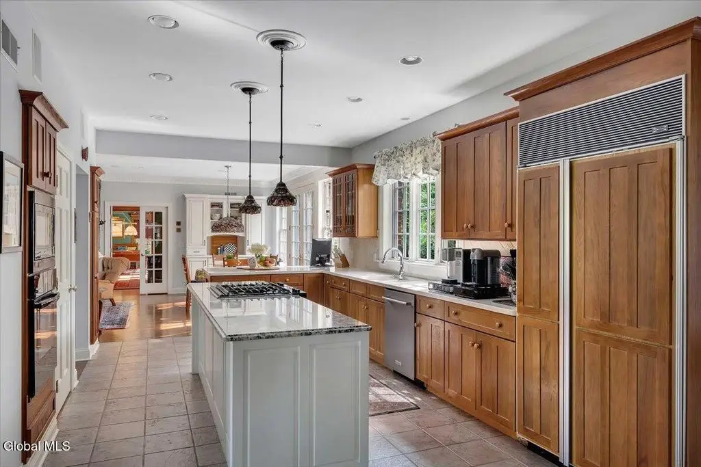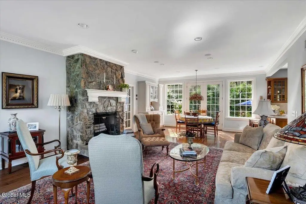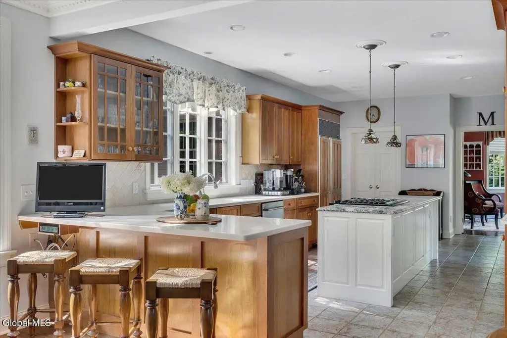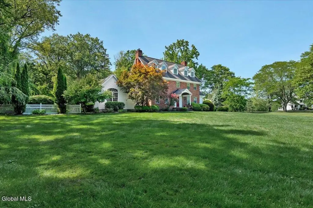 This stately & stunning custom-built Colonial offers 4 BR, 4.3 BA & approximately 6,000 sq. ft. of tastefully appointed living space! Set amid lush landscaping, this luxury home welcomes you with an elegant entrance. A gracious living room with a striking fossil stone fireplace. Handsome den with a gas log fossil stone fireplace & wet bar. Impressive billiard room. Gourmet kitchen with center island. Formal dining room with brick fireplace. Sunlit study framed by a large bay window. Laundry/mudroom. Dramatic two-story primary suite boasts a spa-like bath. Dormered loft area. 2 additional suites. Private guest suite with separate staircase. Lower level with: theater, kitchenette, bath & gym/game area. Private porch & terrace. Basketball court. An exceptional home in a desirable location!