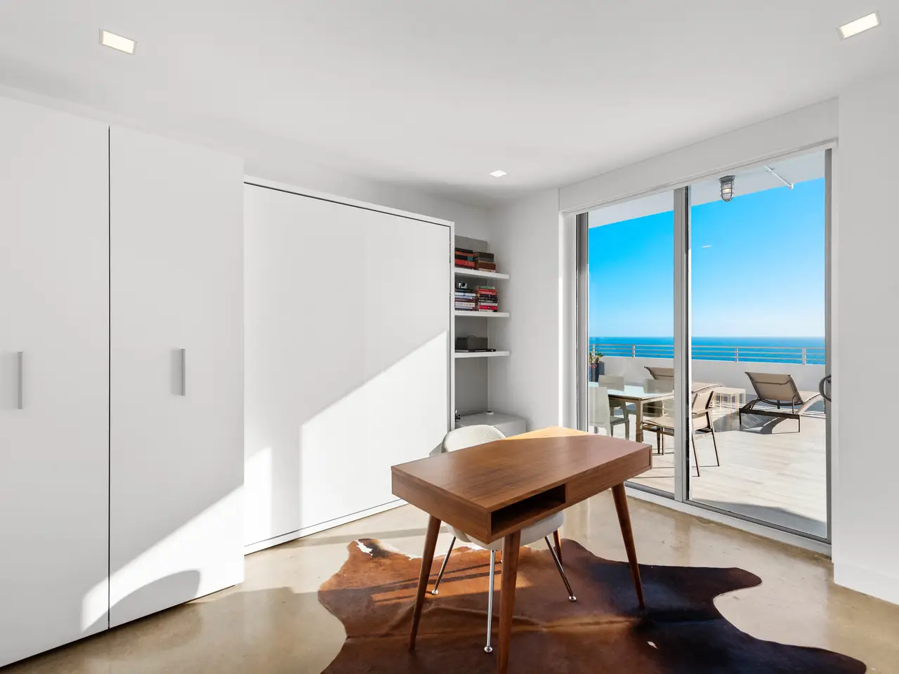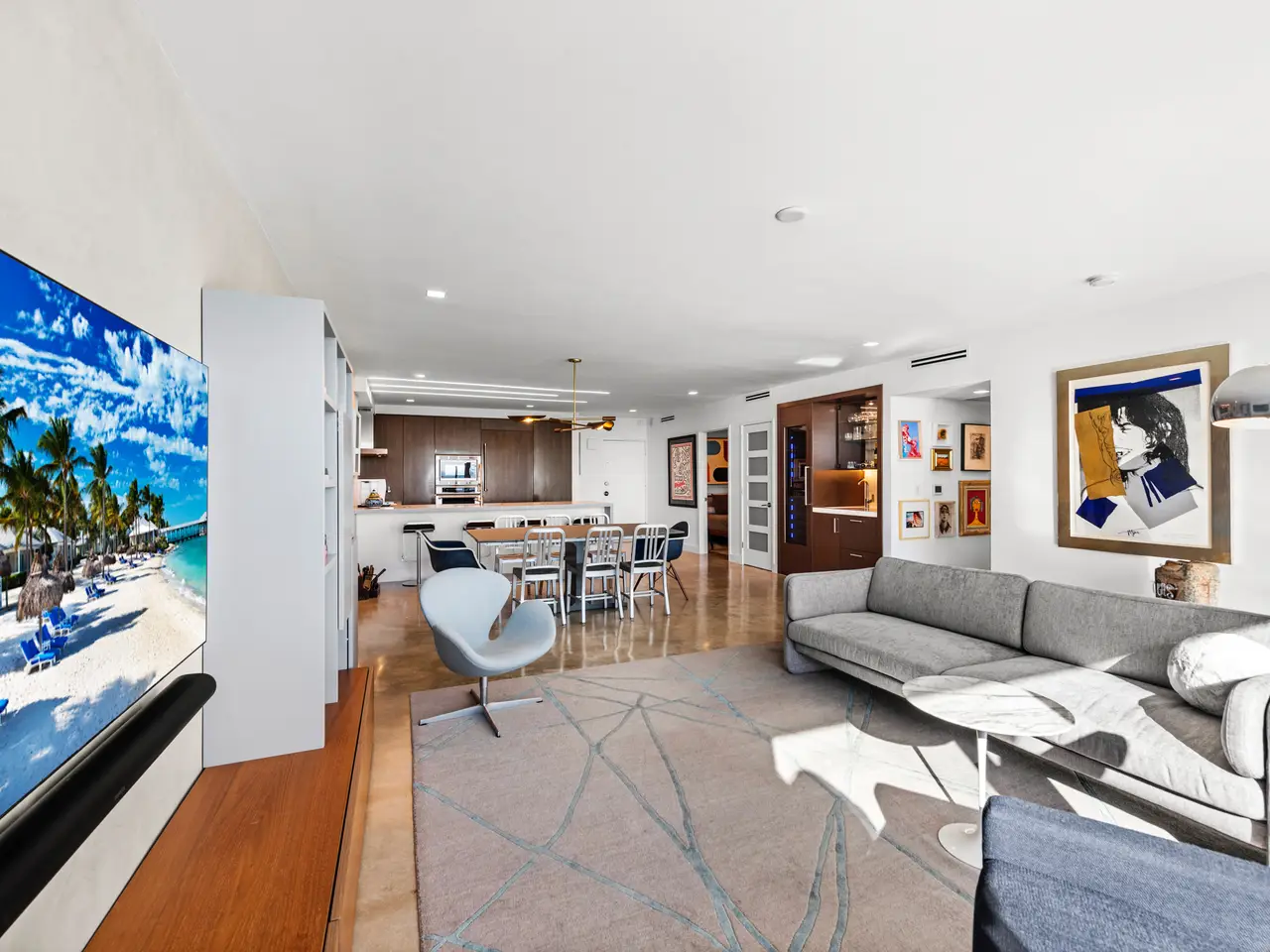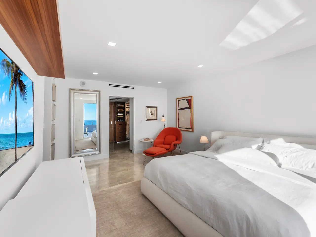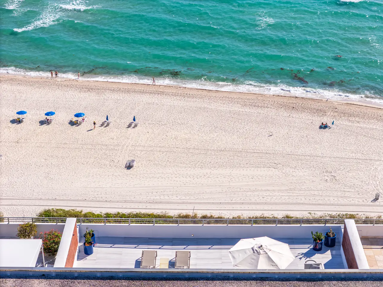A spectacular Penthouse in Miami Beach, an iconic building designed by famed architect Morris Lapidus, a Beachfront ‘Home in the Sky’ with an impossible to find direct ocean view 1100 sf terrace, ideal for entertaining. Featuring expansive living room and sleek open kitchen with custom cabinetry, Thermodor appliances, built in wet bar with 24” Dual Zone Perlick wine fridge, polished concrete floors, Lutron smart lighting system, motorized shades, custom five panel interior doors, Venetian plaster feature wall, and a Clei wall bed. Exquisite details, custom vanities, Porcelanosa tile, Porcelanosa Krion integrated sink & Kalista bath fixtures in the primary bathroom, Ann Sacks tile, Kohler bath fixtures in 2nd bath & Ann Sacks solid stone pedestal sink in the powder room.