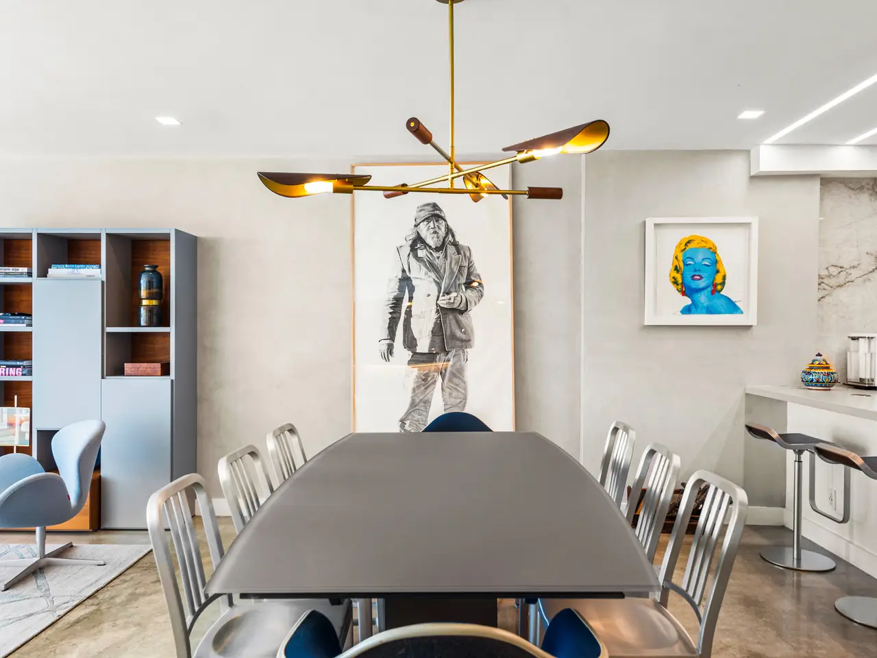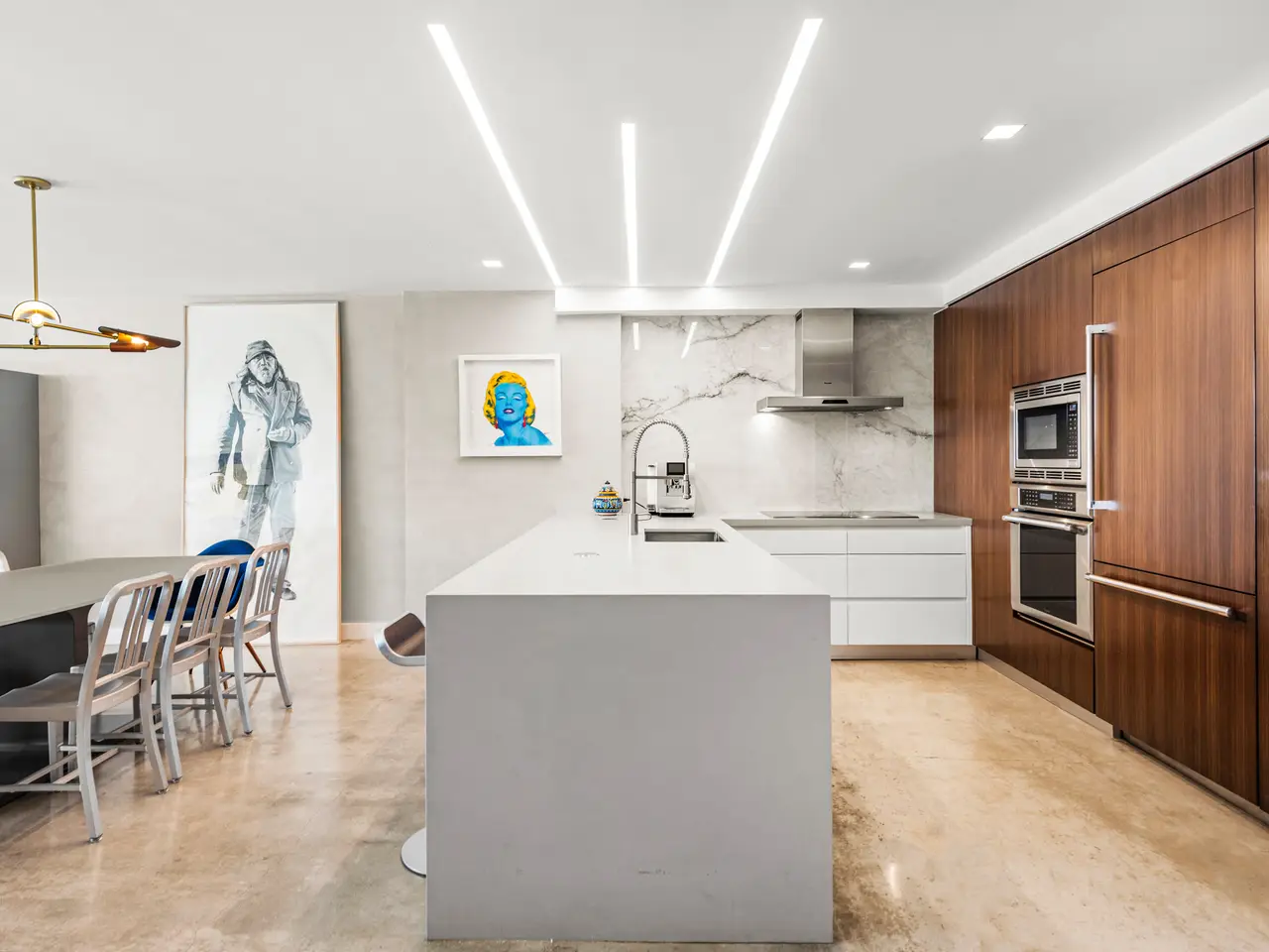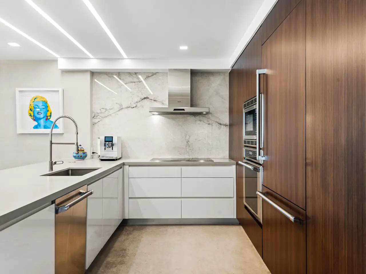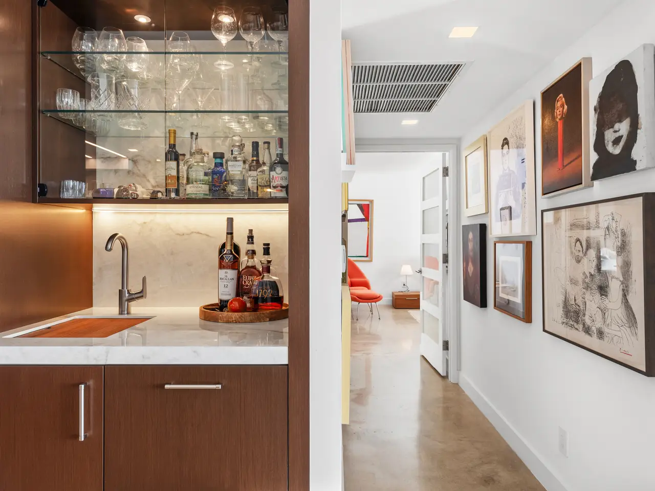 A spectacular Penthouse in Miami Beach, an iconic building designed by famed architect Morris Lapidus, a Beachfront ‘Home in the Sky’ with an impossible to find direct ocean view 1100 sf terrace, ideal for entertaining. Featuring expansive living room and sleek open kitchen with custom cabinetry, Thermodor appliances, built in wet bar with 24” Dual Zone Perlick wine fridge, polished concrete floors, Lutron smart lighting system, motorized shades, custom five panel interior doors, Venetian plaster feature wall, and a Clei wall bed. Exquisite details, custom vanities, Porcelanosa tile, Porcelanosa Krion integrated sink & Kalista bath fixtures in the primary bathroom, Ann Sacks tile, Kohler bath fixtures in 2nd bath & Ann Sacks solid stone pedestal sink in the powder room.