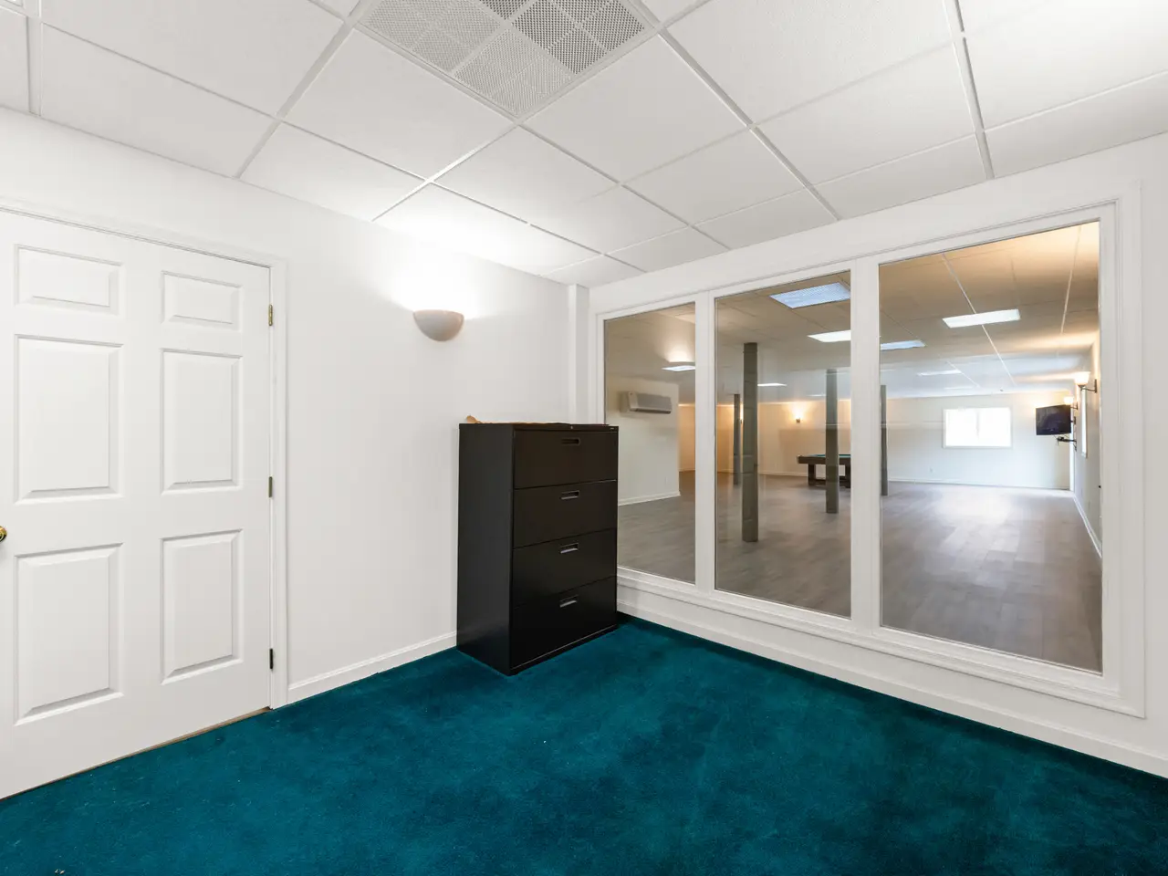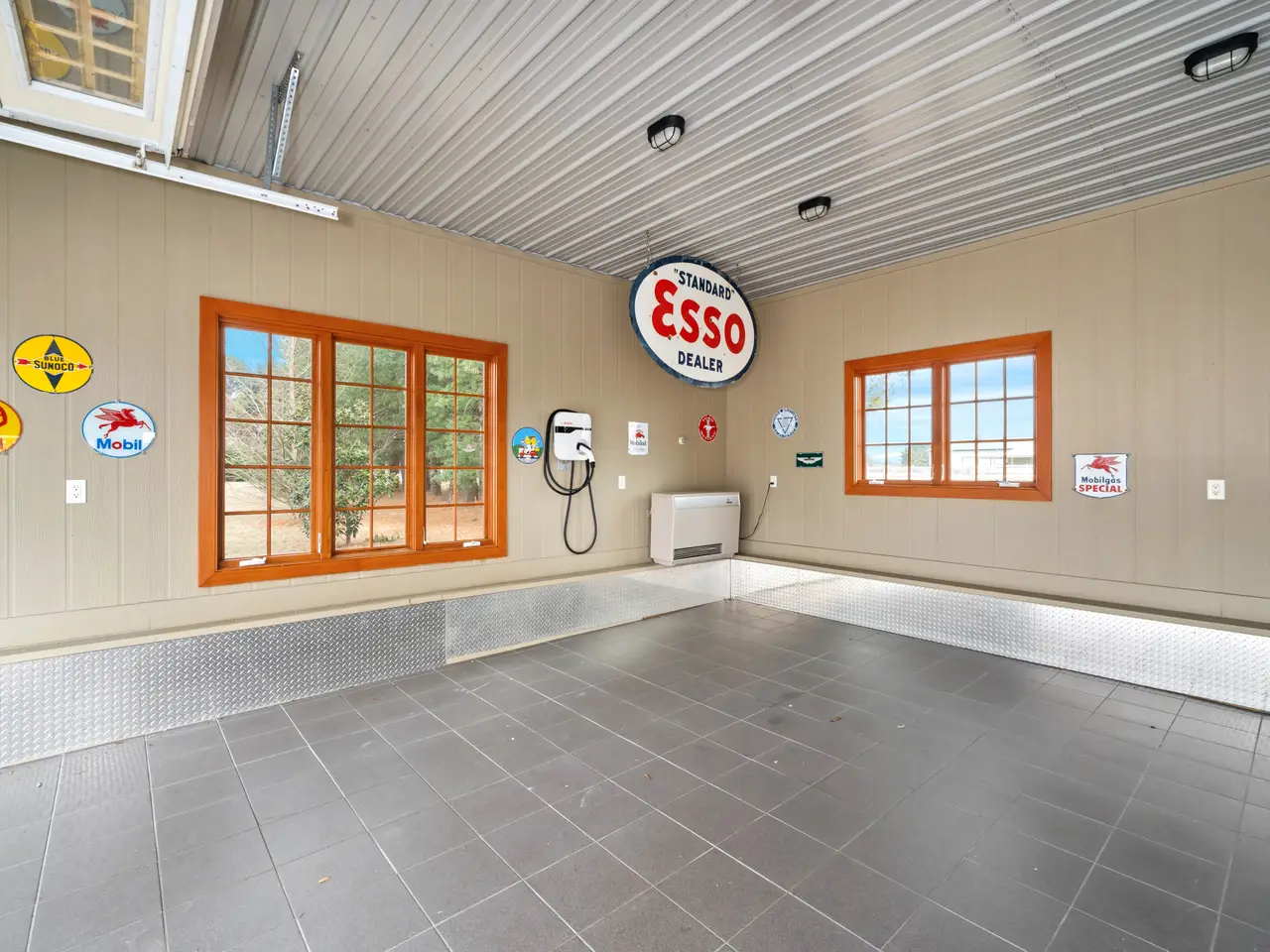 Four-car garage with tile floor and EV charging station