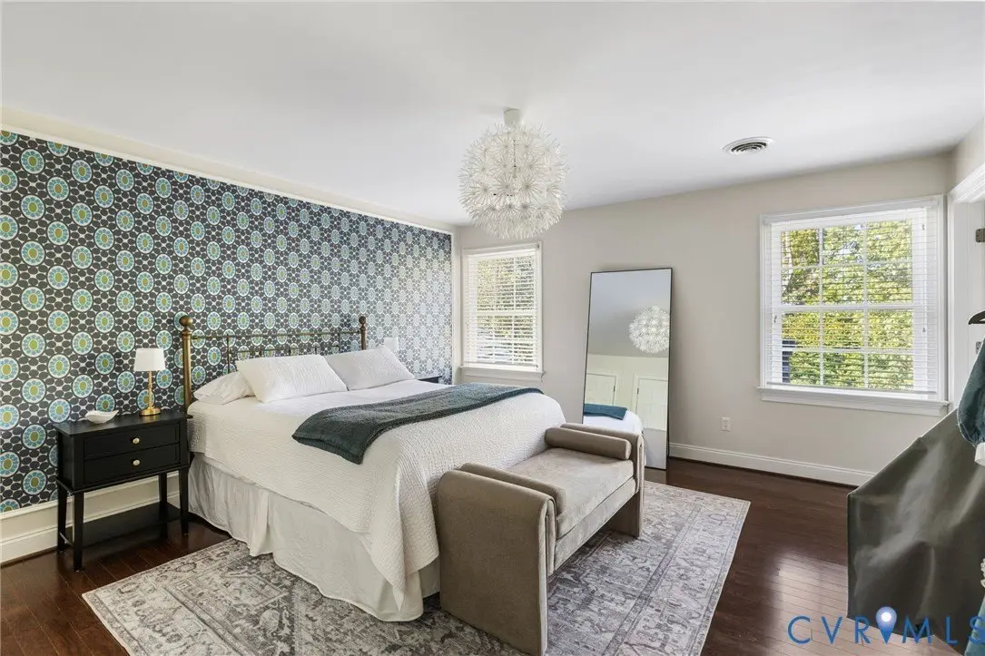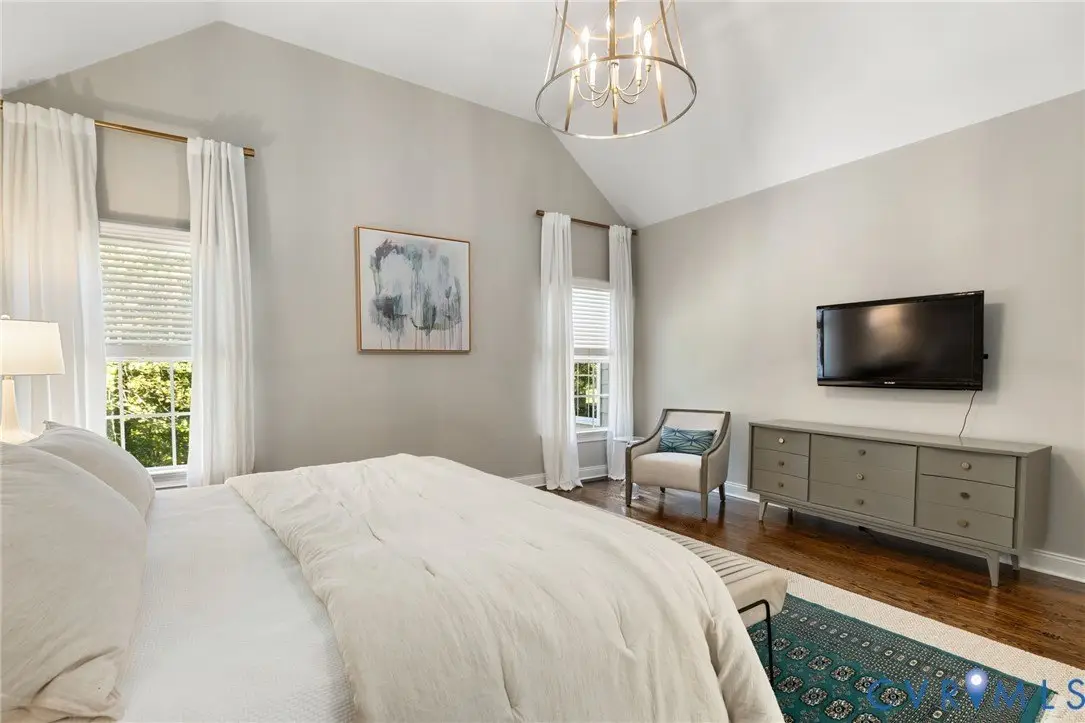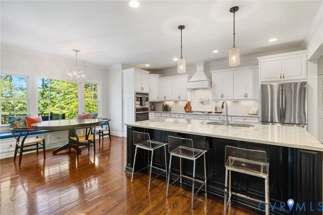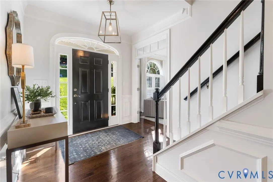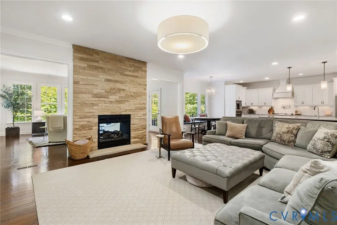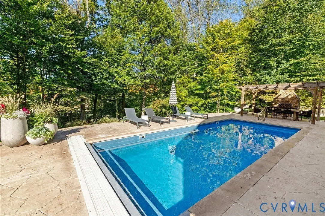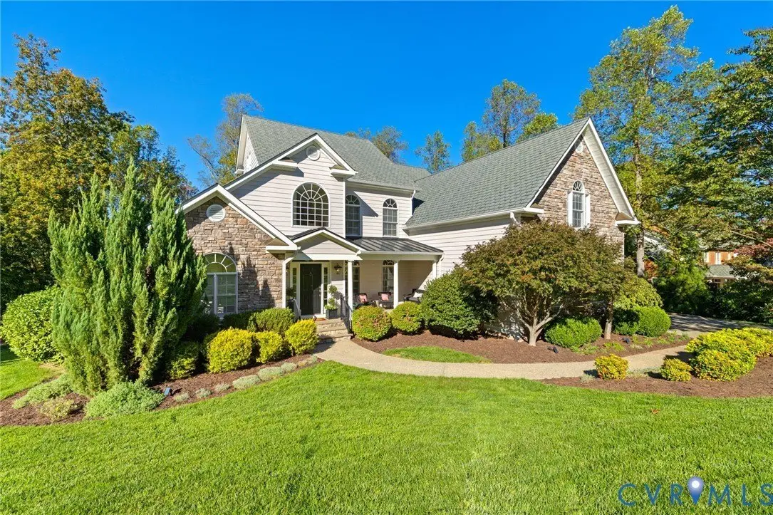Stunning Luxury Home in Sought-After River Downs Community! Welcome to this exquisite 5-bedroom, 3 full and 2 half bath home showcasing over 5,200 sq ft of beautifully designed living space. Home offers the perfect blend of elegance, comfort, and outdoor resort-style living. Step into the bright and inviting foyer, accented with double crown molding, gleaming HDWD, and plantation shutters. To your left, a private home office with a Palladian window provides the ideal work-from-home setting, while the formal dining room on the opposite side impresses with picture frame molding and timeless details. The 1st-floor primary suite is a true retreat, featuring vaulted ceilings, an accent wall, hardwood floors & WIC. The spa-inspired en suite bath showcases dual quartz vanities, a custom-tiled shower, and a freestanding soaking tub. The heart of the home is the expansive family room, centered around a double-sided stone fireplace that opens to a cozy additional living area, perfect for relaxing or entertaining. The gourmet kitchen is a chef's dream, offering quartz counters, large center island, tile backsplash, under-cabinet lighting, gas cooking, wall oven & walk-in pantry. The adjoining butler's pantry with a wine fridge, wet bar, and custom cabinetry makes entertaining effortless. Upstairs, find 4 spacious BRs, each with HDWD, generous closets & two Jack-and-Jill BAs. The finished third floor provides an incredible recreation room complete with skylights, recessed lighting, built-in storage, reading nook & 1/2 BA, perfect for a playroom, media space, or private retreat. Step outside to your own backyard paradise. Covered patio overlooks a sparkling in ground pool, stone fireplace, and pergola, an entertainer's dream & the ultimate spot to unwind after a long day. This exceptional home combines timeless craftsmanship, modern luxury & an unbeatable location close to shopping, dining, and top Chesterfield schools. Come experience this one-of-a-kind property in River Downs, where elegance meets everyday comfort.