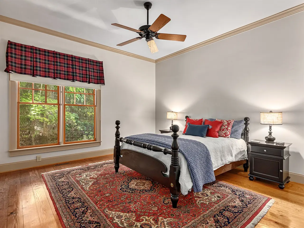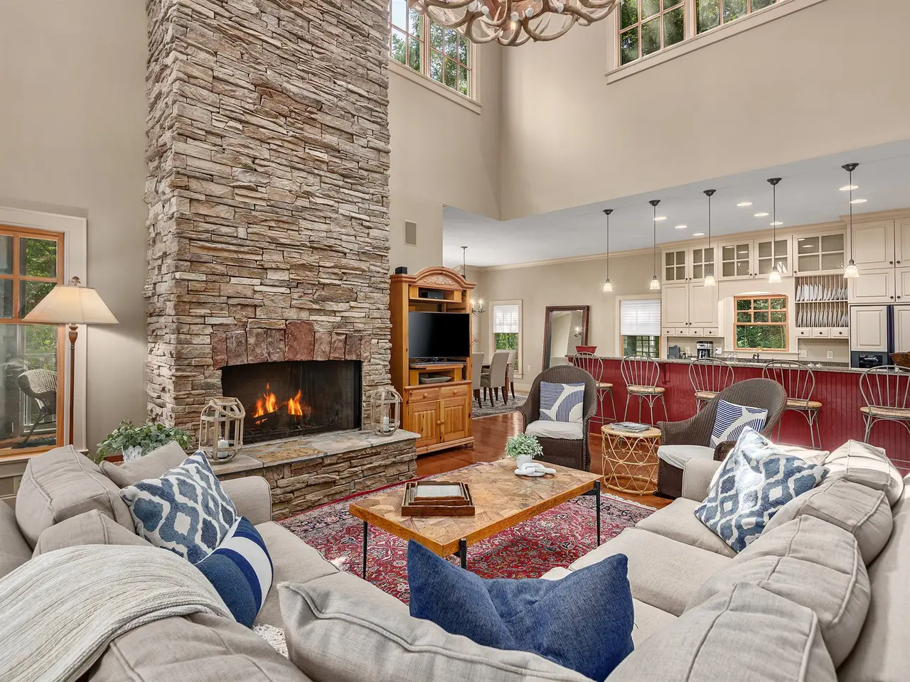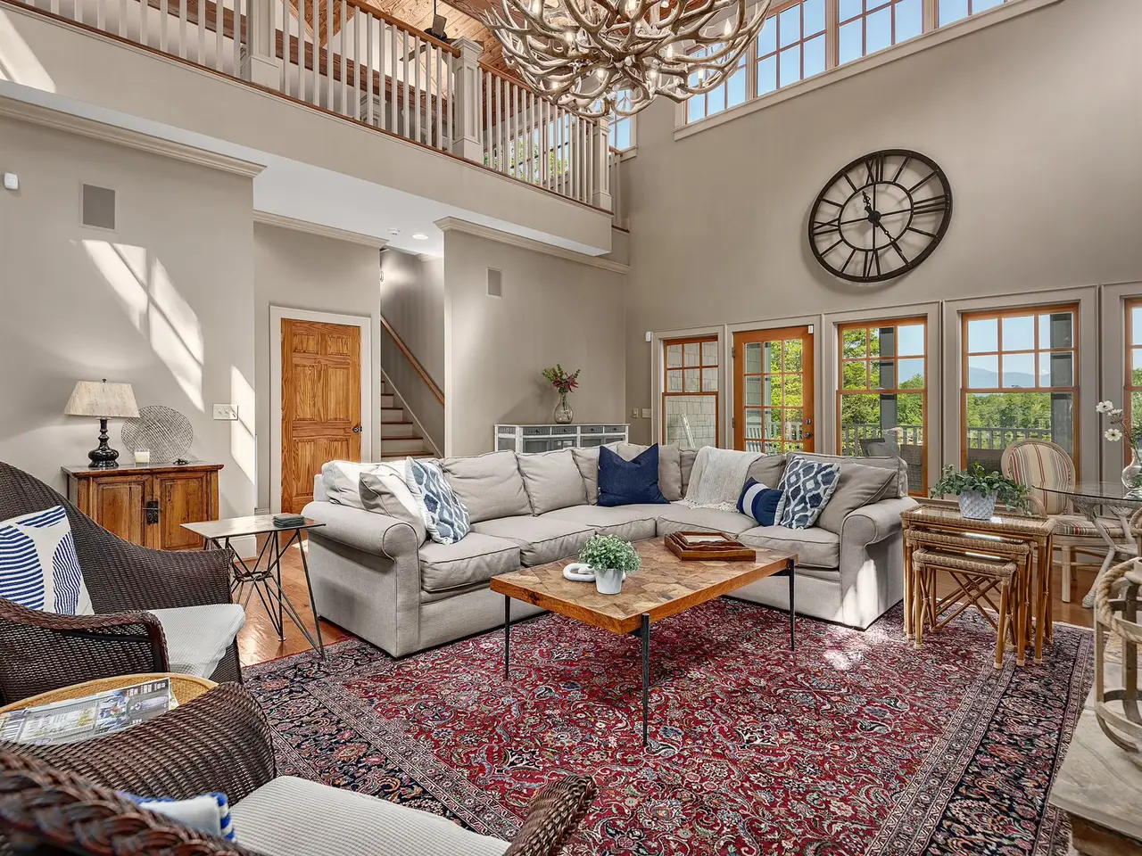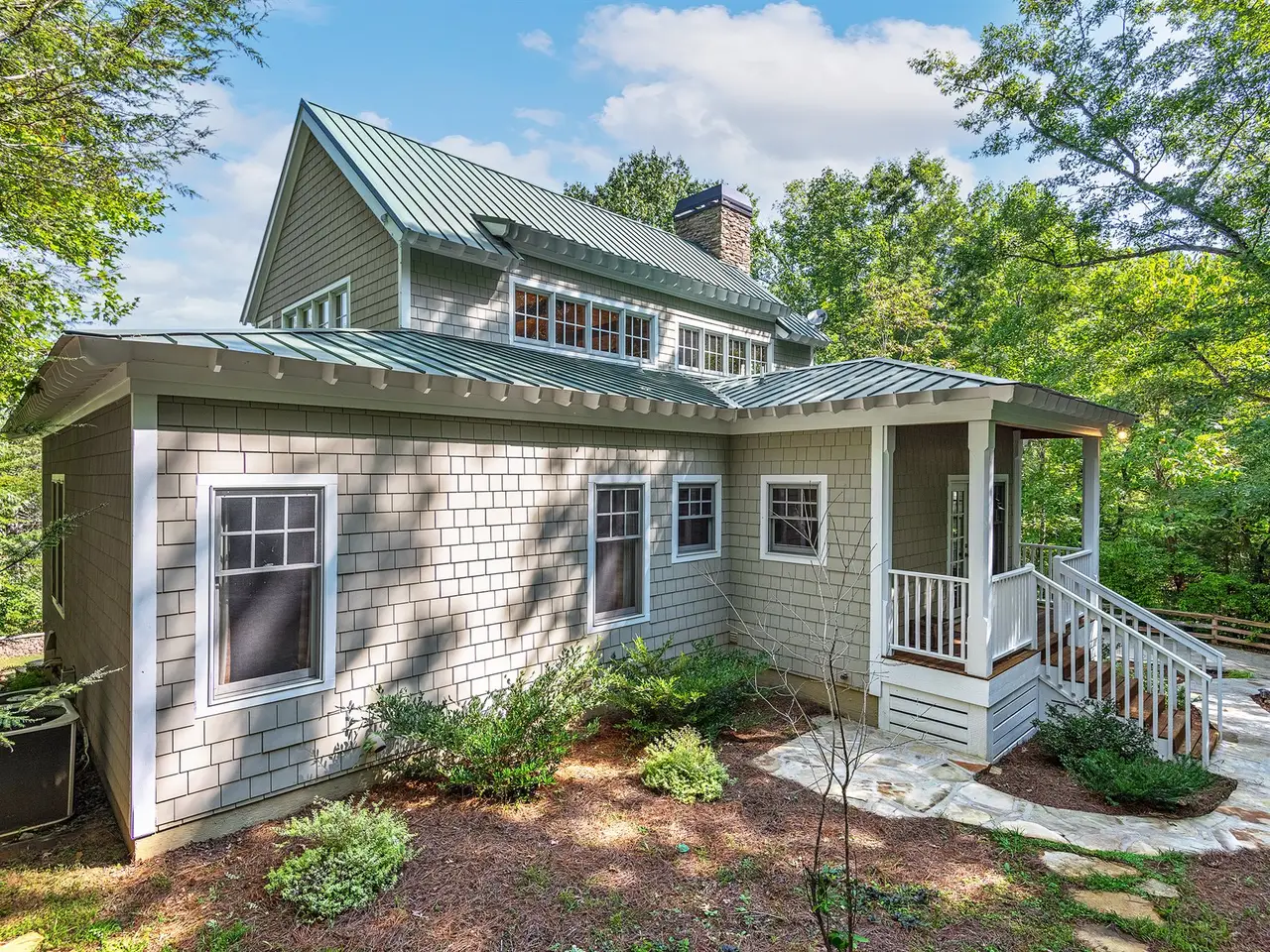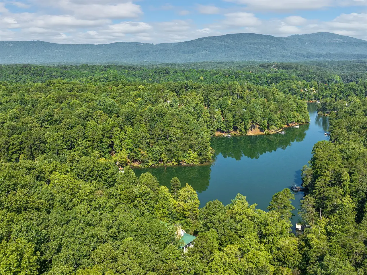 Idyllic lakefront home tucked in a private cove on Lake Adger is the perfect mountain getaway! Featuring year-round lake and mountain views, this home sits close to the water and has a gentle sloped yard with stone pathway to the lake and your own floating dock. This home checks all the boxes including an open floor plan, a large versatile kitchen, warm pine wood floors, and a marvelous great room with a dramatic two-story stacked stone fireplace and vaulted wood ceilings. The rooms are spacious, and the ceilings are almost 10' tall throughout. Relax and listen to the splashing creek from the wraparound covered porch or terrace level patio. Create the ultimate home office on the second level loft. Invite all of your friends because there is plenty of room including a terrace level family room with entertainment kitchenette, a large bunk room, and bonus rooms throughout. Loads of storage, and an attached tandem garage with plenty of room to store your water toys. This is the lake life!