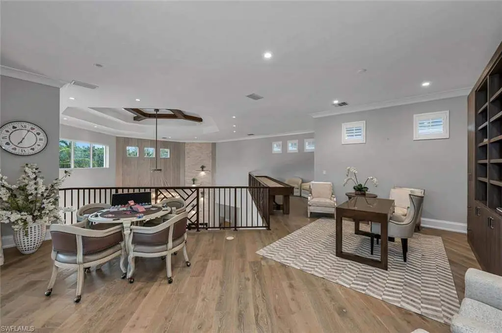The ultimate waterfront lifestyle awaits in this exclusive Estate property with private dock in Miromar Lakes Beach & Golf Club. Perfectly designed on a private peninsula waterfront homesite, this magnificent 5-bedroom residence showcases exquisite architectural details. The centerpiece is a soaring, open-concept great room with grand chandelier & lighted 24-foot dual-sided linear gas fireplace. Design features include white oak wood flooring, tongue-and-groove and wood beam ceiling details, designer tile, open concept gourmet kitchen, butler's pantry, and back-up generator. The primary suite offers a gracious bath with dressing area, steam shower, 3 walk in closets including a hers dressing room and separate entry. The second-floor with elevator access includes a game room, en suite bedroom, and open-air balcony. The outdoor oasis offers living room, fireplace, cooling system, electric screens, fully turfed yard with sprinkler system, wrap-around bar with grill and resort-style saltwater infinity edge pool, spa, outdoor shower, private dock. Tesla charger, AC garages, and home gym which can be converted back to additional garage. This is the perfect property for a discerning buyer looking to immediately begin enjoying the Miromar Lakes and its unparalleled waterfront living. As the only southwest Florida community with miles of beach, boating, golf, and resort-style amenities in one picturesque destination, it offers a truly remarkable lifestyle. Water-ski, paddle board, kayak, sail, or fish on the 700-acre freshwater lake, unwind at the wellness spa, play the Arthur Hills "Signature" championship golf course, hone your tennis, or pickleball skills, or simply relax in the dreamy beachfront cabanas. Located minutes from Southwest Florida International Airport, world-class beaches, shopping, and dining.