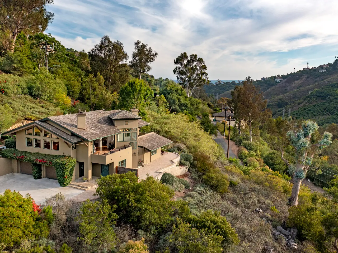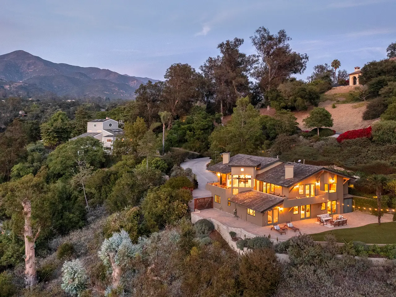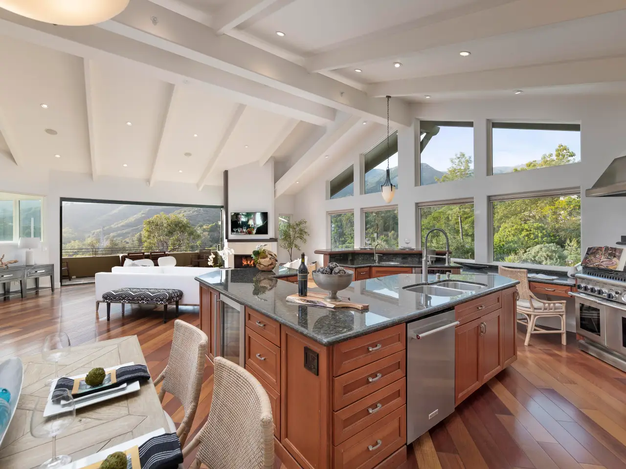 Situated above Sycamore Canyon on Montecito's western edge, 62 Canon View is a stunning contemporary retreat that offers privacy, quality, and breathtaking mountain and canyon views. Located in the Eucalyptus Knolls community and within the award-winning Cold Springs School District, this gorgeous four bedroom, three- and one-half bath home on a private one-acre parcel provides a serene sanctuary just minutes from both Coast Village Road and Downtown Santa Barbara. Quality construction is evident from the moment one passes through the large custom copper front door. Views abound from nearly every room, deck, and patio. The open floor plan seamlessly integrates the main living areas, including the kitchen, dining, and living rooms, all of which feature soaring ceilings and hardwood floors. A cozy fireplace anchors the living room, and a dramatic six-panel bi-fold glass wall perfectly frames the stunning view of Cathedral Peak. The luxurious primary suite is a private retreat, complete with its own view deck, fireplace, vaulted ceilings, multiple walk-in closets, a spa-like jetted tub, and a glass enclosed shower. The additional three bedrooms feature French doors which provide access to the yard and allow in copious amounts of natural light. Designed with both relaxation and entertainment in mind, the outdoor spaces have been meticulously upgraded with beautifully hardscaped walls, stairways, and rock features. Fruit trees, custom low-voltage landscape lighting and irrigation enhance the lush landscaping, while paver walkways and turf create inviting yet drought tolerant outdoor living areas. Modern amenities elevate the home's comfort and efficiency, including multi-zone heating and air conditioning, high-speed Ethernet cabling, and WiFi-enabled LED lighting with dimmer switches. Remote-controlled Hunter Douglas shades provide effortless privacy, and built-in infrared outdoor heaters on the upstairs terrace allow for year-round enjoyment. A top-of-the-line whole-house reverse osmosis system ensures premium water quality at every fixture and appliance, while Nest thermostats, smart smoke and carbon monoxide alarms, and Arlo high-definition security cameras offer state-of-the-art convenience and peace of mind. Additional upgrades include an enhanced built-in sound system, high-flow HVAC vents for efficient heating and cooling, an EV charger, and smooth, WiFi-enabled garage door openers. The oversized two-car garage offers ample storage and a workshop area, while the flexible floor plan presents a convenient dual-living option. Combining contemporary elegance, cutting-edge features, and an unbeatable Montecito location, 62 Canon View is a rare opportunity to experience the best of canyon living.