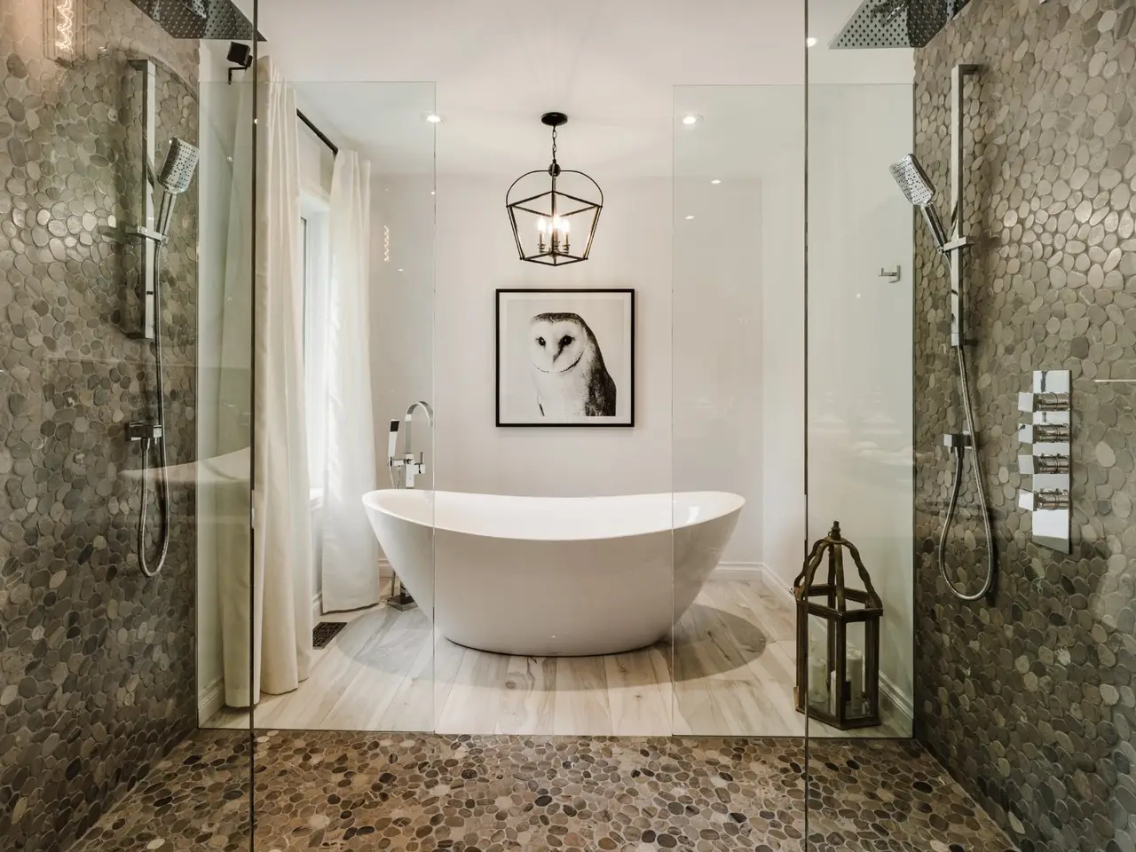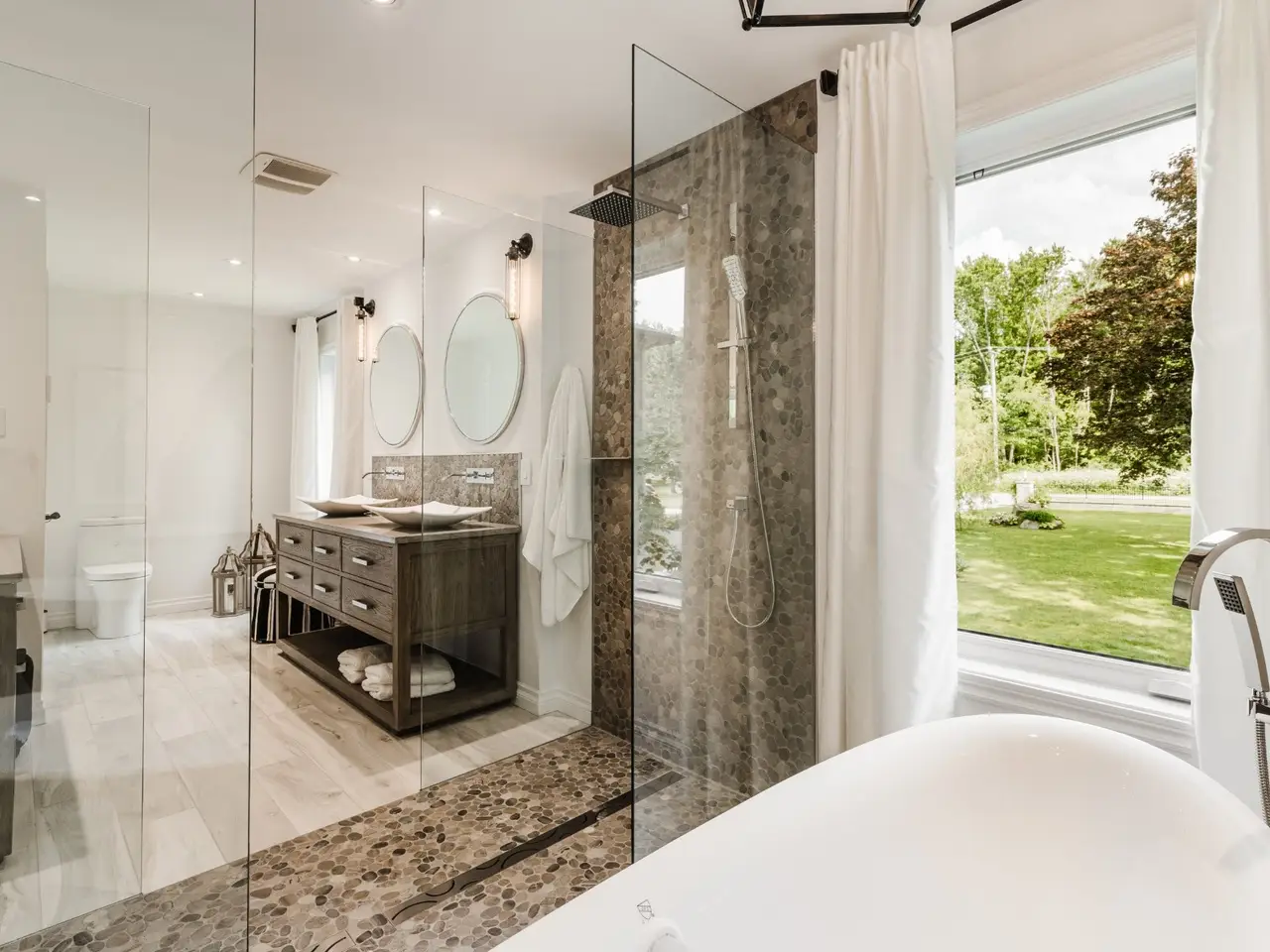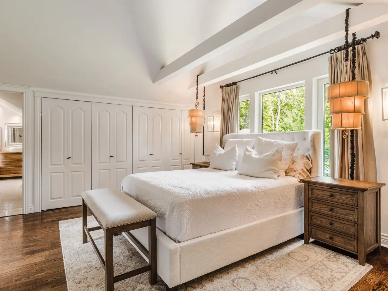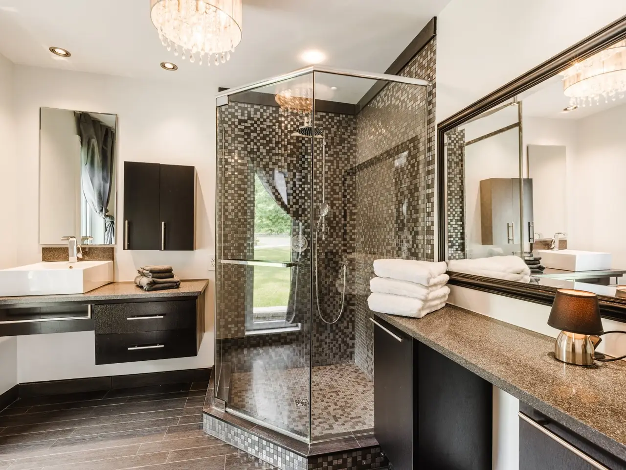 Handsome and imposing waterfront estate, in prime location, w/ panoramic views; this all-stone 7,348 sqft residence, set on a large 52,842 sq ft lot, was built and renovated to a high standard, w/ quality fixtures & finishes, and boasts 5-car garage(2 + 3),7 bedrooms,6.5 bathrooms(4 ensuite),luxury indoor pool pavilion + shower,bar,4 fireplaces, grand oak staircase(basement to 2nd floor),porcelain and hardwood floors (1st & 2nd),chef's custom wood kitchen with premium appliances, dinette, formal dining room,2 living rooms, games room/family (cinema) room, primary bedroom suite, custom walk-ins, balcony & large unistone patio, private backyard & sandy beach.