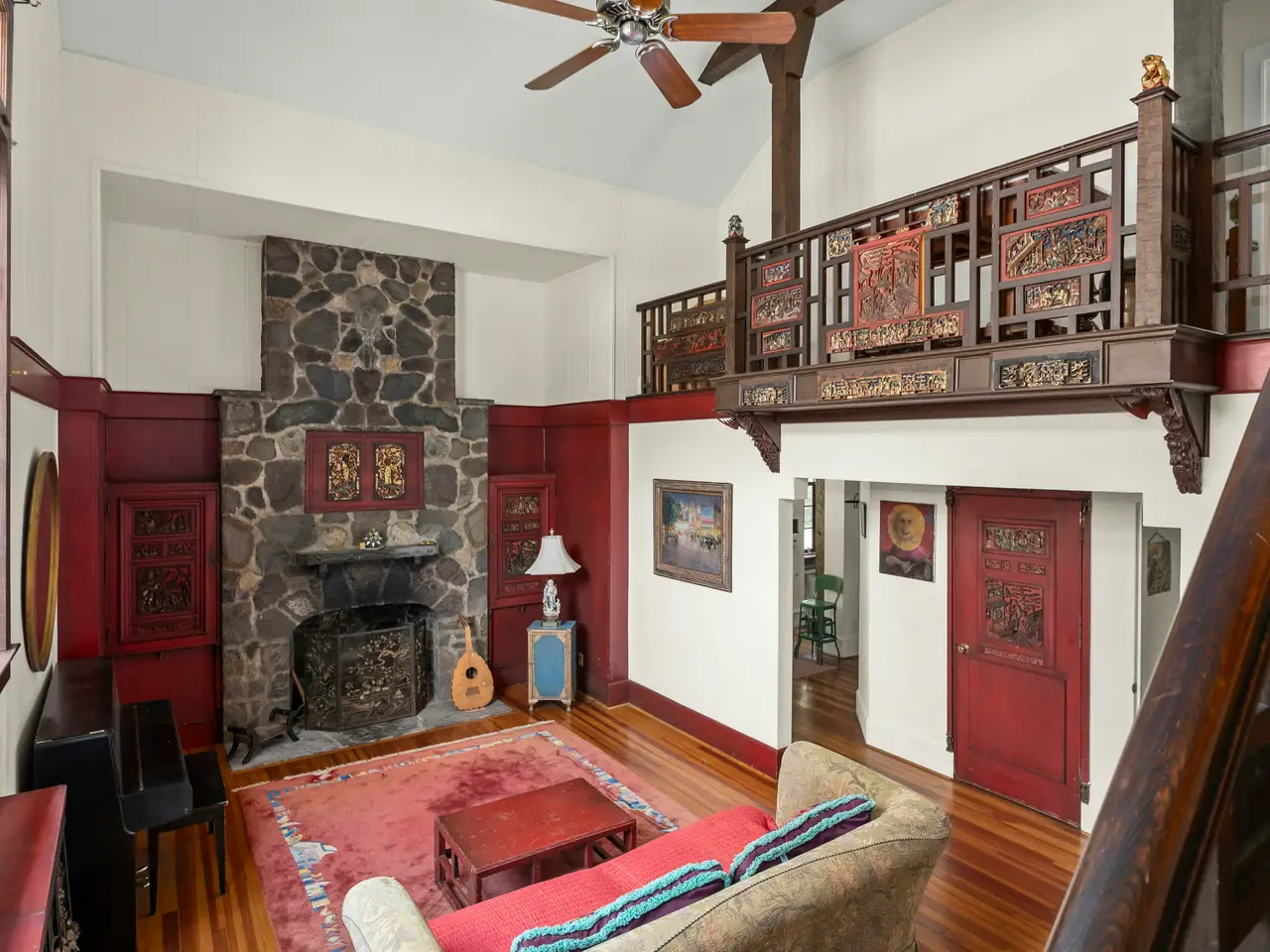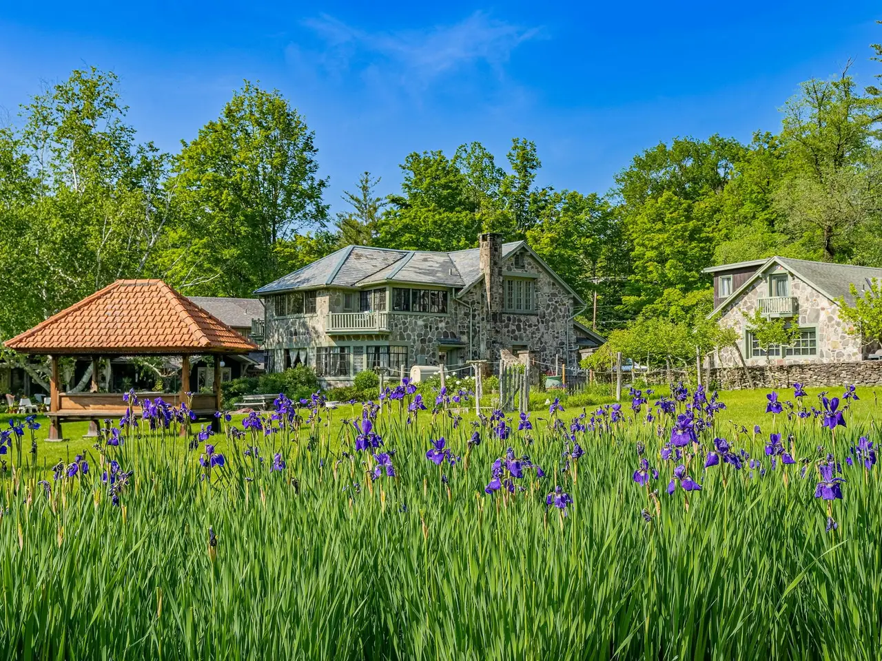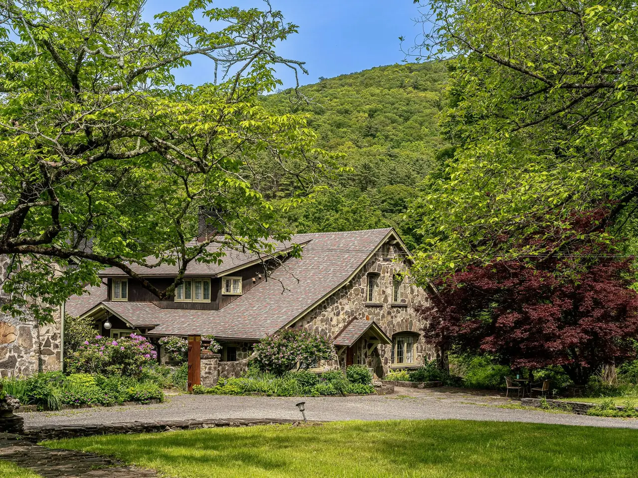 Welcome to Happy Brooks, the much-loved compound for many years of Woodstock Festival co-founder and legendary music industry icon Michael Lang, this mythic Mt. Tremper property boasts true style, along with a creative pedigree that dates back to the 1920s. Originally built for the artist G. Adolph Anderson, the 17 acre estate features three architecturally significant & historic structures designed by prominent architect A.M. Bedell; the original main house was built in 1928, with the two additional & alluring buildings following soon after. The grandly scaled double-height great room of the primary residence has played host to renowned artists of every stripe through the decades, with the inspired design detail easily matched by the world-class art and music created within its impressive walls. In this wing you will also find an office, two powder rooms, upper-level bedroom, and a library. Past a massive bluestone fireplace on the ground floor a central foyer leads into a formal dining room with long-range mountain views, a cooks" kitchen with breakfast area, and an open-plan media room (and another massive fireplace with wood stove & built-in bread oven). A light-filled hallway brings you to three oversized bedroom suites, including the romantic, beautifully scaled primary. Behind magnificent stained glass doors you will find a reading room with window seats that overlook the verdant, rolling lawn below. Connecting this wing of the home is a spectacular conservatory with a 24-foot glass ceiling - the perfect place to cultivate plants (or plans), paint a masterpiece, or simply dream. Across the central courtyard, and framed by a wide, mature birch tree is a two bedroom storybook guesthouse that holds true design treasure. An oversized living room leads into a den with bluestone fireplace and a striking collection of built-in Fu dogs and wood-carvings on gilded plaques collected from travels to China that depict an epic story (like the one you can create here). There is also a charming dining area and full kitchen. The third stone and wood structure is a two bedroom cottage that is connected to a three-bay garage, and has a greenhouse ready to be restored or turned into a Romanesque walled garden. Additional structures include a tool shed, three-stall barn, as well as an enchanting picnic pavilion sited up on a knoll with views of Slide Mountain, the tallest peak of the Catskills. From the moment you enter the gates there is a feeling of being in your own private village, and the park-like land is a natural wonder, with winding paths, stone walls, orchards, fields of wildflowers and a large centerpiece pond with its own art island showcasing a sculpture by Michael Lang. On sultry summer days you can enjoy a swim in the 53 x 40 oval lined cement pool while gazing at the peaks and valley's in the distance. Mt. Tremper is located just minutes from main street Woodstock, and Happy Brooks itself is approximately two hours from NYC. This rare Hudson Valley treasure, so full of possibilities, is ready for its next refresh and adventurous steward. So come on and get Happy.