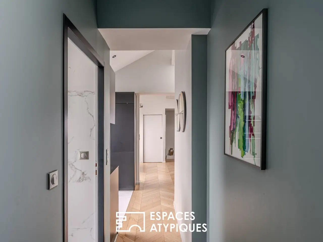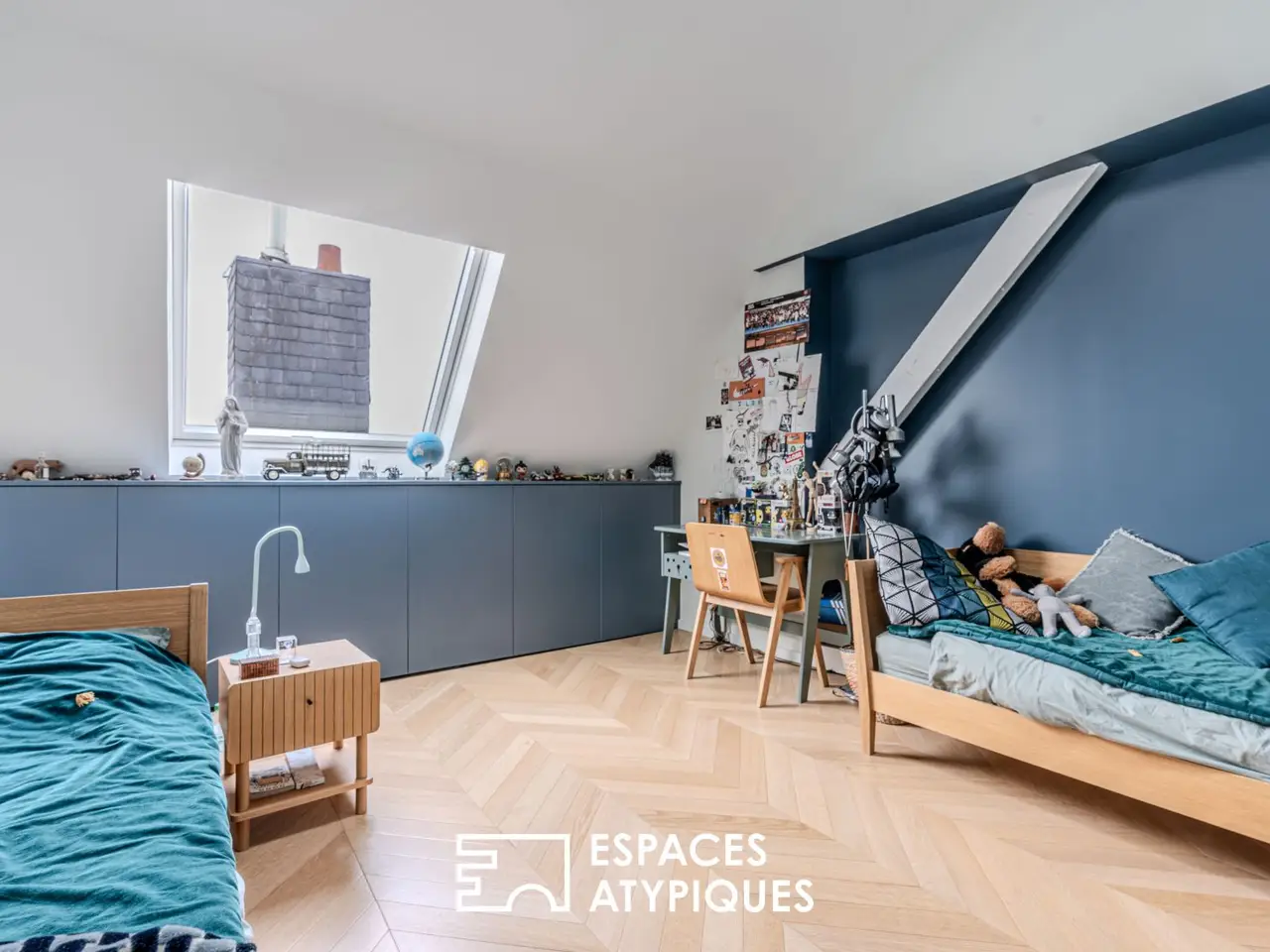 Ideally located in the hypercentre, on the top floor of a Haussmannian building, this fully renovated apartment has 108 sqm (113.48 sqm) and offers a refined and bright living environment. Its private elevator, its generous volumes and its neat finishes make it a rare property on the Nantes market. From the entrance, the living room bathed in light reveals a warm and sophisticated space. The spacious living room, decorated with a custom-made library and a cathedral ceiling with exposed beams, benefits from a double exposure that enhances every moment of the day. The open kitchen, fully fitted and equipped, combines contemporary design and functionality. On the night side, the apartment has an elegant master suite, with a custom-made dressing room and a refined bathroom with double sink and high-end finishes. Two other bedrooms complete the space, accompanied by a bathroom with noble materials, designed in a sober and refined spirit. Located in the heart of a sought-after area, close to shops, schools and transport, this apartment combines old-world charm and modern comfort. Its privileged location, its optimized layout and its atypical character make it a unique address for lovers of exceptional properties. Possible purchase option in addition on a closed and secure box in the area Property subject to the status of co-ownership: 12 lots including 9 residential Annual charges: EUR3,100 Information on the risks to which this property is exposed is available on the Georisques website https://www.georisques.gouv.fr Energy class C / Climate class A, Estimated average amount of annual energy expenditure for standard use, Average prices Average energy prices indexed on January 1, 2021 (including subscriptions): between EUR1,096 and EUR1,482 per year. REF. 2421 Additional information * 4 rooms * 3 bedrooms * 1 bathroom * 1 bathroom * Floor : 6 * 6 floors in the building * 20 co-ownership lots * Annual co-ownership fees : 3 100 € * Property tax : 1 900 € Energy Performance Certificate Primary energy consumption : 160 kWh/m2.an High performance housing