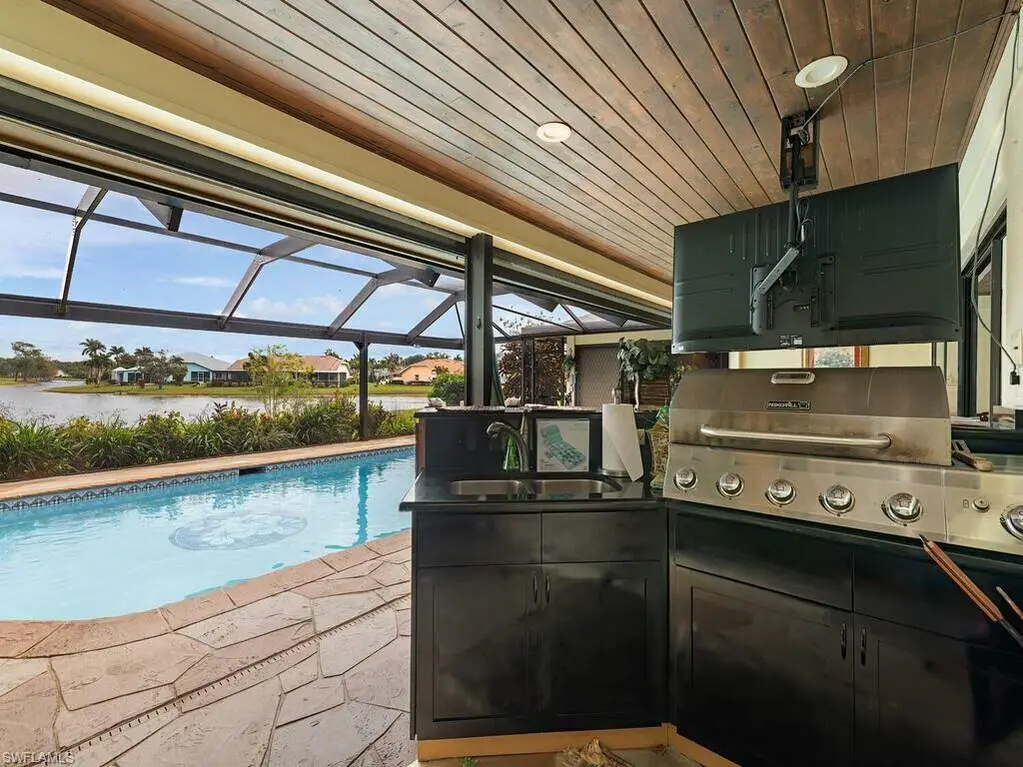 Welcome to your dream home! Enter this property through the charming front garden courtyard, complete with custom plantings, and prepare to be amazed by the stunning views that await you. The disappearing sliders in the great room open up to create an incredible 16-foot-wide panorama of the pool area, showcasing the serene lake and pristine golf course beyond. The great room is designed for versatility, offering ample space for both casual and formal living areas. It also includes room for a formal dining area, though the current owners have creatively used this space to accommodate a grand piano. Adjacent to this, you'll discover a chef's dream kitchen. Designed and crafted by the owner, a master carpenter, the kitchen features custom-built cabinets and a center island made from a single, full slab of quartz measuring an impressive 5x10 feet. The kitchen is further enhanced by upgraded stainless steel appliances, an 8x7-foot walk-in pantry-perfect for storing everything you need to host large gatherings-and a cozy breakfast nook with bay windows that offer picturesque views of the pool, lake, and golf course, often visited by graceful Snowy Egrets. Connected to the kitchen is a casual family room, an ideal space for relaxing, snacking, and watching TV. The home boasts three fully remodeled bathrooms, each updated with new frameless shower doors, vanities, and modern toilets. The luxurious master suite is truly a retreat, spanning 21x17 feet and featuring sliding doors that lead directly to the pool area. Step outside to the recently resurfaced pool area, adorned with elegant stamped concrete. The lanai includes a built-in summer kitchen and a new cage with large, unobstructed picture windows that frame the breathtaking views of the lake and golf course. The pool area also features see-through hurricane shutters that can be controlled remotely via your smartphone. This home is not only beautiful but also highly efficient. The owner has invested in 55 solar panels and two backup batteries, a $147,000 upgrade, resulting in an average electric bill of just $37 per month. Additionally, the property includes a private well, minimizing water costs. The garage is equipped with an electric car charger, and the driveway is scheduled to be upgraded with brick pavers in March. In addition, the roof was replaced in 2023 and the outside completely repainted in 2024. With every detail thoughtfully designed, this home offers unparalleled comfort, luxury, and sustainability. It's truly a property that has it all-and it's ready for you to call it home.