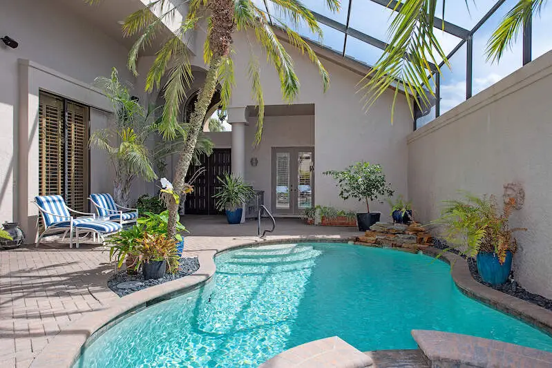 This beautiful custom-built home features recent updates, including a new tile roof and marble-faced fireplace. IN ADDITION, THE SELLER HAS A FULLY TRANSFERABLE GOLF MEMBERSHIP! The spacious chef's kitchen has custom cabinetry, a large walk-in pantry, and newer appliances. Custom 8ft. solid core doors and premium hardware throughout. Plantation shutters and 10ft. sliding glass doors open to the pool courtyard and guest cabana, Custom lighting, skylights, a home office, a central vacuum system, and a heated pool/spa with a waterfall, are just some additional amenities to make your living here a joy. Other notable features include an AqualLink control system, storm shutters, a 2-car garage, brick pavers, and a tropical courtyard. The golf course, lake, and mangrove views from your screened lanai are stunning. Windstar has a Tom Fazio-designed golf course, and clubhouse with spectacular views of Naples Bay and 72 slip deep water marina, affording direct gulf access in less than 10 minutes. The club has clay tennis courts, a fitness center, and the Keewaydin Island Beach Club with a boat shuttle and private membership.