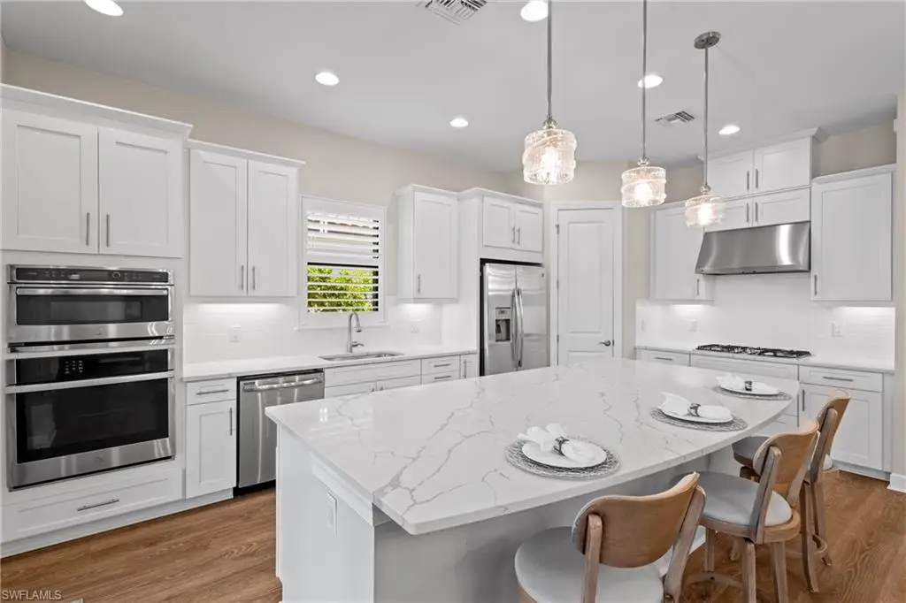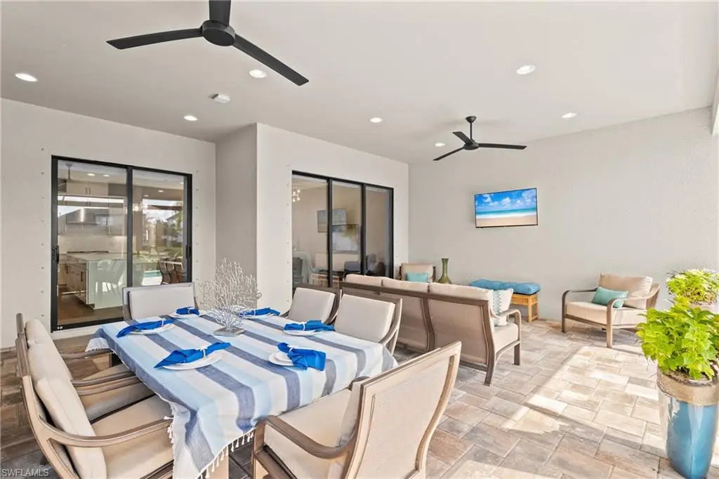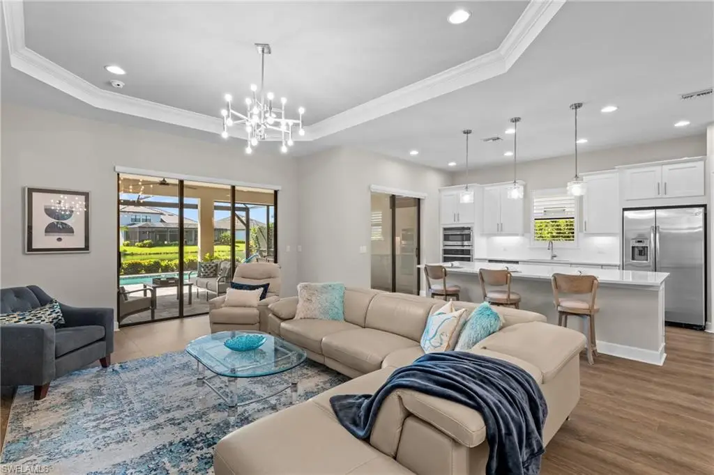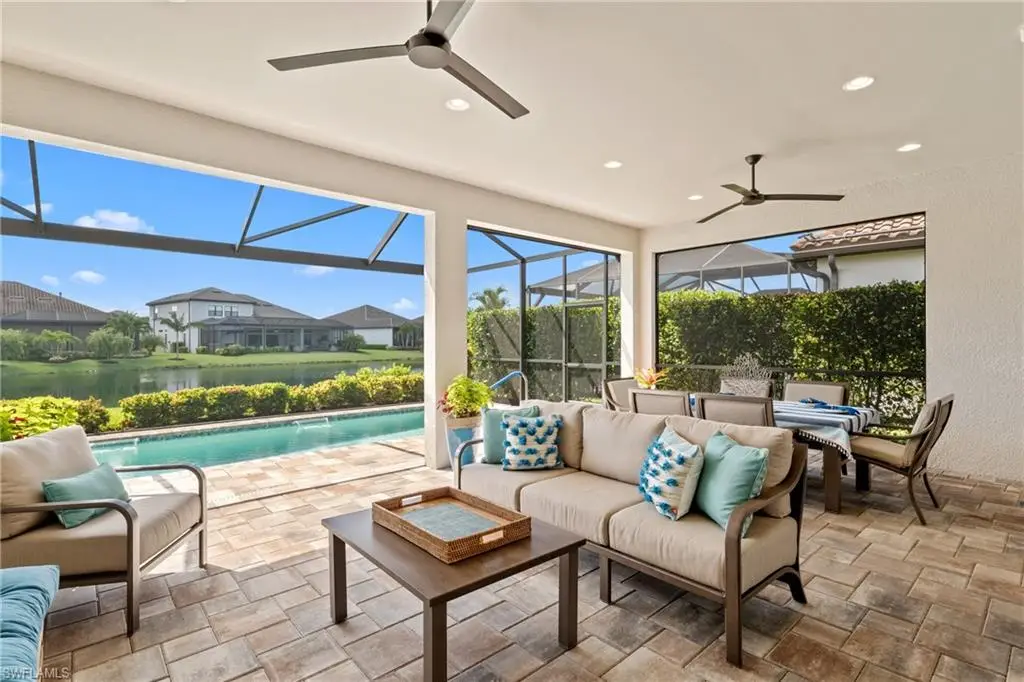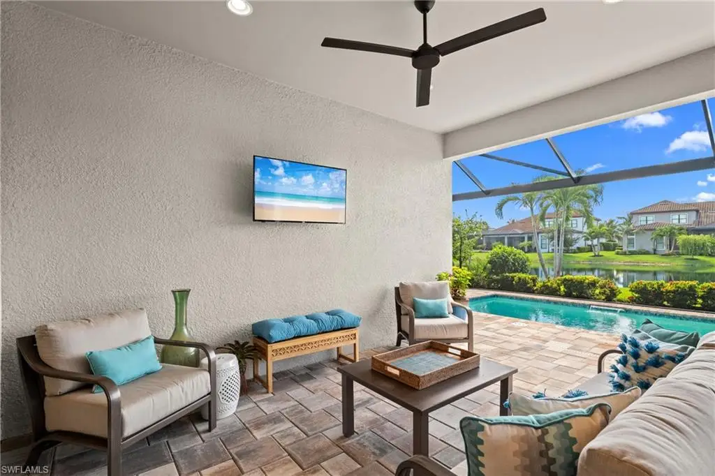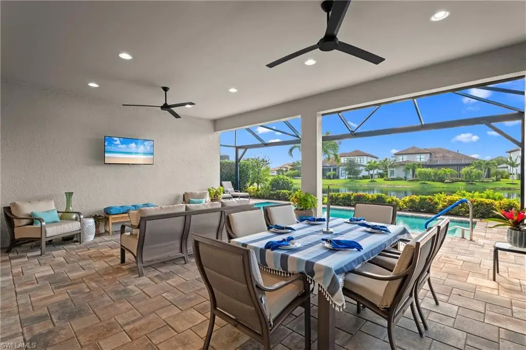 LIVE A VACATION LIFESTYLE IN ESPLANADE! FULL GOLF MEMBERSHIP INCLUDED! Built in 2019, this Lazio model offers a perfect mix of luxury, comfort, and relaxation with its lakefront setting and SOUTHERN rear exposure, which make this home light and bright. The layout, with 3 bedrooms, a den, and 3 full bathrooms has been upgraded with high-end features like the GE appliance package (including GAS cooktop, wall oven, and built-in wall convection microwave), beautiful quartz countertops throughout the kitchen & baths, luxury laminate floors throughout the common areas & den, upgraded sculpted carpet in the bedrooms, and more. The spacious open great room flows out to an extended covered lanai through two sets of sliding glass doors, with dedicated outdoor living and dining areas (pre plumbed for an outdoor kitchen with gas, water, and electric - ideal for entertaining. The GAS and SOLAR heated saltwater pool with two water features and picture window screen cage framing wide and long lake views, making this space both relaxing and ideal for social gatherings. The primary suite offers a spacious bedroom with three windows overlooking pool & lake, luxurious bath with soaking tub and walk-in shower with frameless glass shower enclosure, and large walk-in closet. There are also many added features such as a WHOLE HOUSE GENERATOR, ELECTRIC MOTORIZED ROLL DOWN HURRICANE SCREENS ON THE LANAI, roll down and accordion style hurricane shutters on all windows, three tray ceilings, enhanced landscaping, upgraded Voss bathroom/shower fixtures, and more! The EXTENDED AIR CONDITIONED GARAGE (24X20) with epoxied floor and the large laundry room with cabinetry only add to the home's convenience. Esplanade Golf & Country Club of North Naples offers a true Lifestyle Community with world-class amenities, including a resort pool with cabanas and the popular Bahama Bar, tennis, pickleball, bocce, a 14-mile network of bike/walking trails, and an 18-hole private golf course. The impressive 15,000 Sq Ft clubhouse features a restaurant, bar, wine-tasting room, wine lockers, and a Starbucks-style cafT. Best of all, the property's landscaping, irrigation, golf membership, and all community amenities are covered under a quarterly fee of just $3,412 no additional fees or memberships required! Don't miss your opportunity to own this exceptional home in one of Naples' most sought-after communities. Schedule your tour of this stunning home and Esplanade Golf & Country Club today!