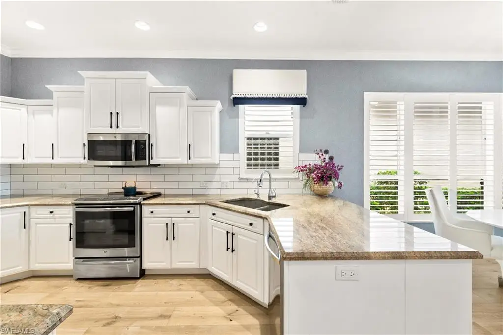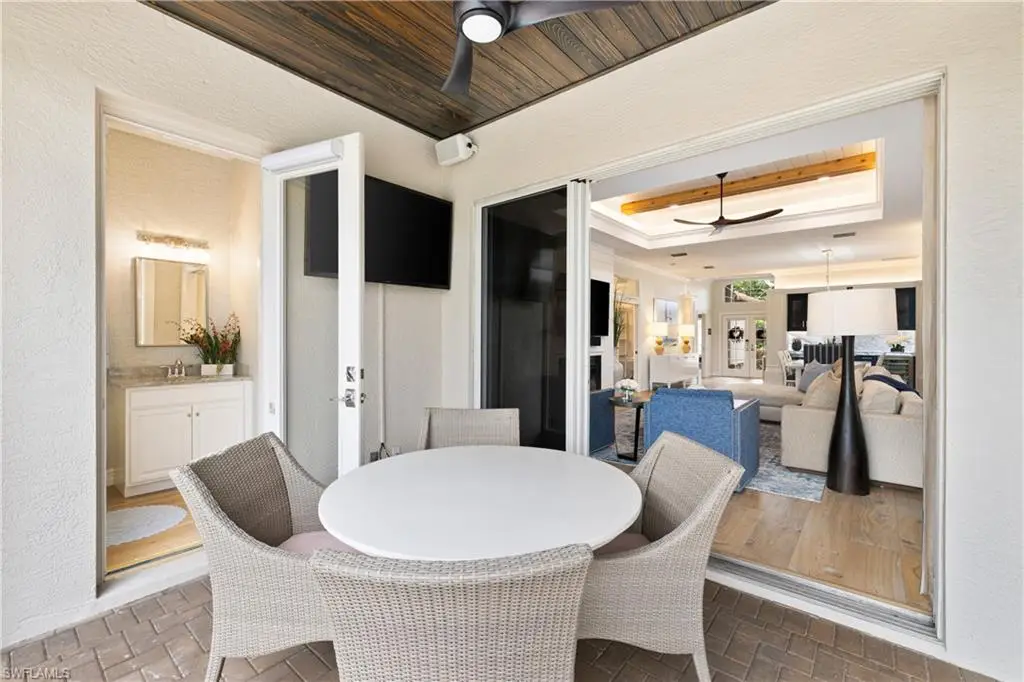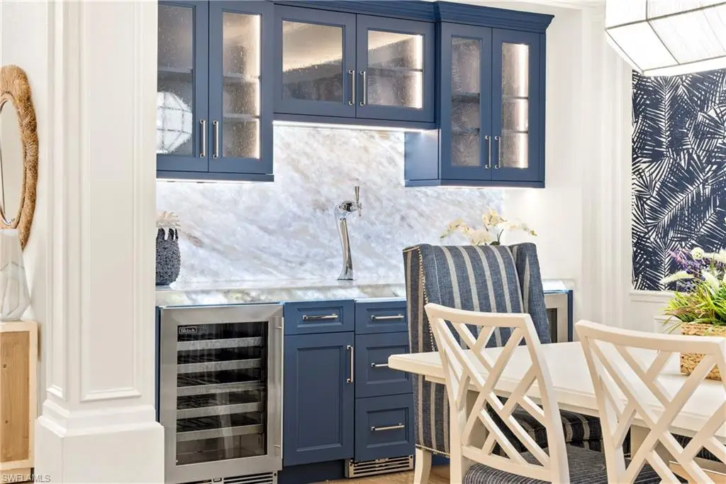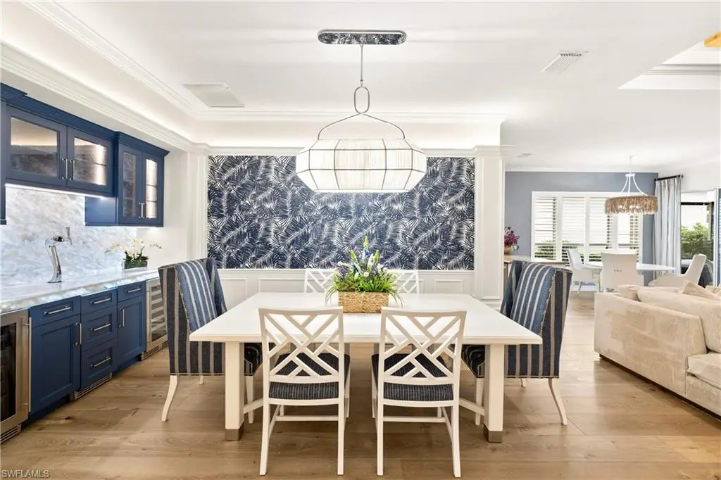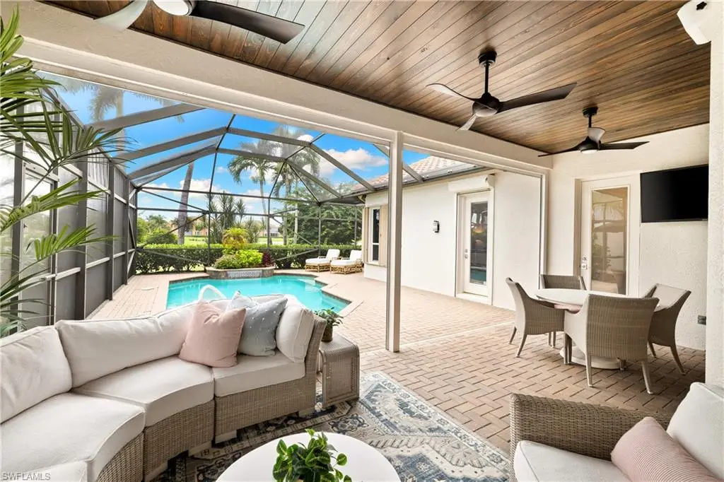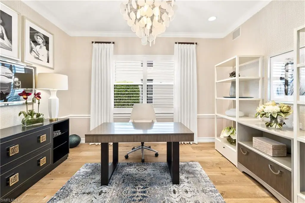 This stunning residence has been completely reimagined by the award winning team at Design West and presents a true ôclose today and entertain tomorrowö opportunity. Every detail of this three-bedroom plus den, South-facing pool home has been professionally curated and finished to the highest of standards, creating one of the most exceptional turnkey offerings here in Naples. Interiors showcase DuChateau hardwood flooring, a Cristallo Italian backlit quartzite wine bar, designer furnishings and window treatments, striking wallcoverings, custom ceiling inlays, refined lighting, and luxurious accessories that harmonize seamlessly throughout the entire property. The gourmet kitchen, dining, and great room flow effortlessly for entertaining, complete with custom chandeliers, area rugs, and accent furnishings. The primary suite includes a full Design West furnishing package with custom closets, wallcoverings, rug, lighting, and a wood ceiling inlay, while guest rooms and baths are equally tailored with coordinated furniture, mirrors, and finishes. Peace of mind comes with a brand-new tile roof (2019), electronic hurricane shutters with accordion shutters on remaining windows, and a custom epoxy-finished garage with cabinetry plus an extended bay for a golf cart. Outdoor living is equally refined, with a south-facing saltwater pool, sectional seating, dining areas, and designer furnishings overlooking tranquil golf course views. Offered fully furnished and accessorized, this home represents the most effortless and sophisticated move-in experience available in The Strand. Residents enjoy resort-style amenities including a full-service spa, pickleball, tennis, bocce, dining, an active social calendar, and 27 holes of championship golf. Schedule your private tour today to experience the best of Naples living.