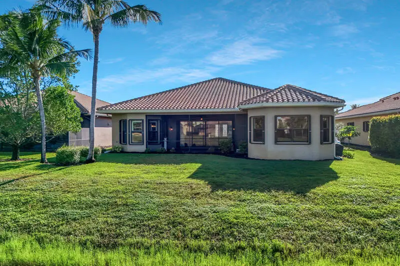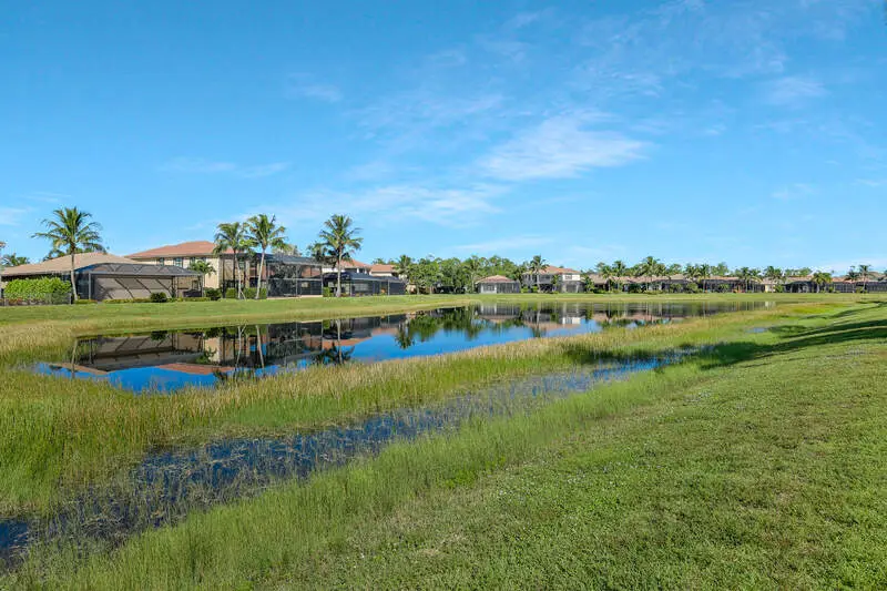 Sunsets over the lake and timeless elegance define this coveted 3,051 sq. ft. Carlyle, the most sought-after floor plan in Riverstone. Beyond the gated courtyard, double entry doors reveal an inviting layout designed for both easy everyday living and effortless entertaining. A spacious great room, formal dining room, wet bar with KitchenAid beverage fridge, and an adjacent custom wine storage rack for over 150 bottles make hosting unforgettable evenings a breeze. At the heart of the home, the gourmet kitchen features upgraded off-white shaker cabinetry, granite counters and backsplash, ambient lighting, and stainless-steel appliances including a double wall oven, vented hood over the cooktop, and a newer KitchenAid refrigerator-sure to inspire any culinary enthusiast. The versatile Club Room, finished with wood flooring and matching plantation shutters, is perfect as an office, den, or media retreat. The primary suite offers serene lake views, custom closets, and a spa-like bath with marble counters and decorative mirrors. Two private guest suites, each with a full bath and built-in closets, ensure comfort for family and friends. Thoughtful details include crown molding, wood-wrapped pillars, decorative mantlepiece, upgraded lighting fixtures and fans, and elegant window treatments. Everyday living is made easier with a finished laundry room offering a sink, ample cabinetry, folding counter, and a new (2024) LG washer and dryer. Peace of mind comes with a whole-home Generac generator powered by dual 120-gallon tanks, accordion shutters for quick storm prep, and an AC system with medical-grade UV lights and filters. The garage is equally functional with storage shelving and insulated doors. Expansive glass sliders flow seamlessly to the outdoors, where a west-facing lanai frames tranquil lake views and panoramic sunsets that fill the sky with vibrant color. The backyard offers abundant space to add a custom pool or design your own custom tropical oasis. Here, unforgettable gatherings, quiet moments, and golden sunsets become part of everyday life. Riverstone offers a vibrant, vacation-inspired lifestyle for all ages. Located in North Naples, just minutes from I-75 and zoned for "A"-rated schools, the community features a fitness center, social hall, resort-style pool, lap pool, spa, five lighted tennis courts, outdoor basketball and pickleball, a full indoor basketball court, tot lot, children's water play area, game room, and an activities coordinator; making it easy to meet new friends. Perfectly suited for entertaining, unwinding, or savoring the view, this home captures the essence of Naples living.