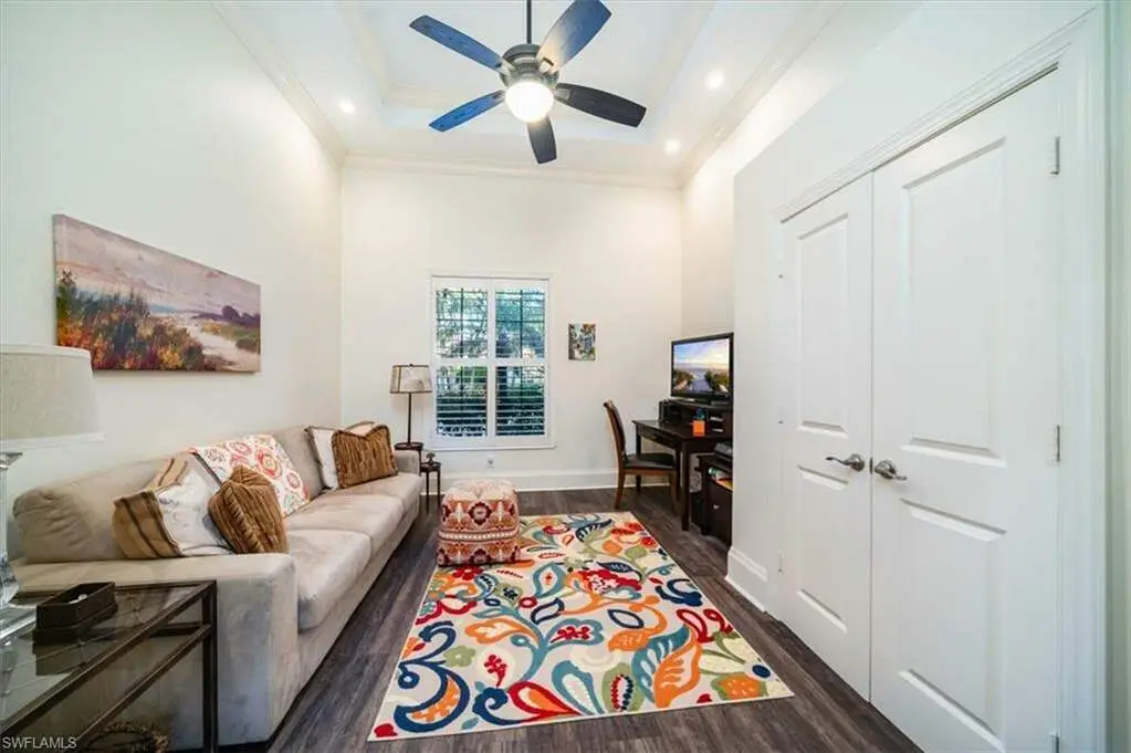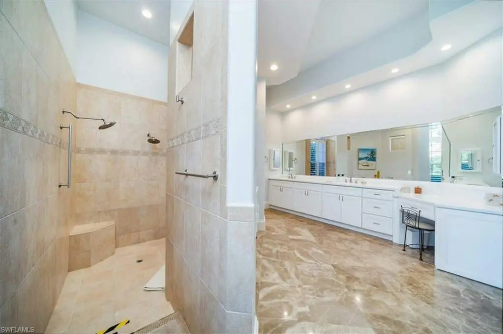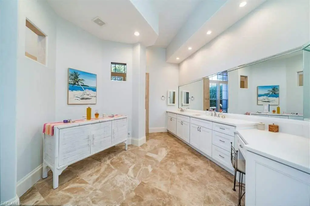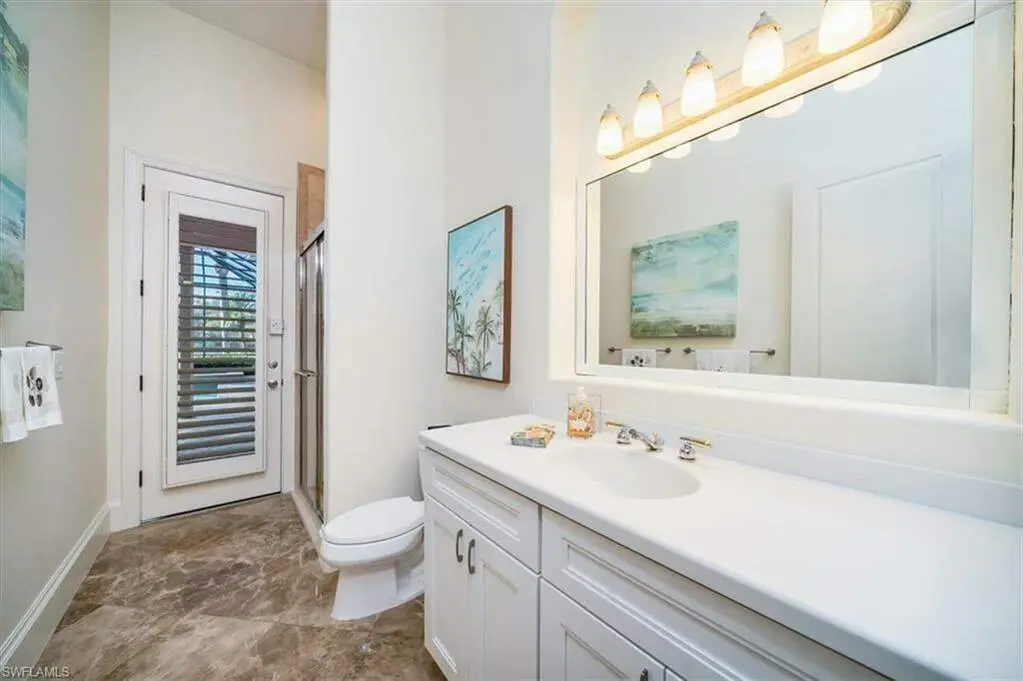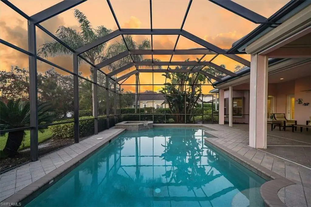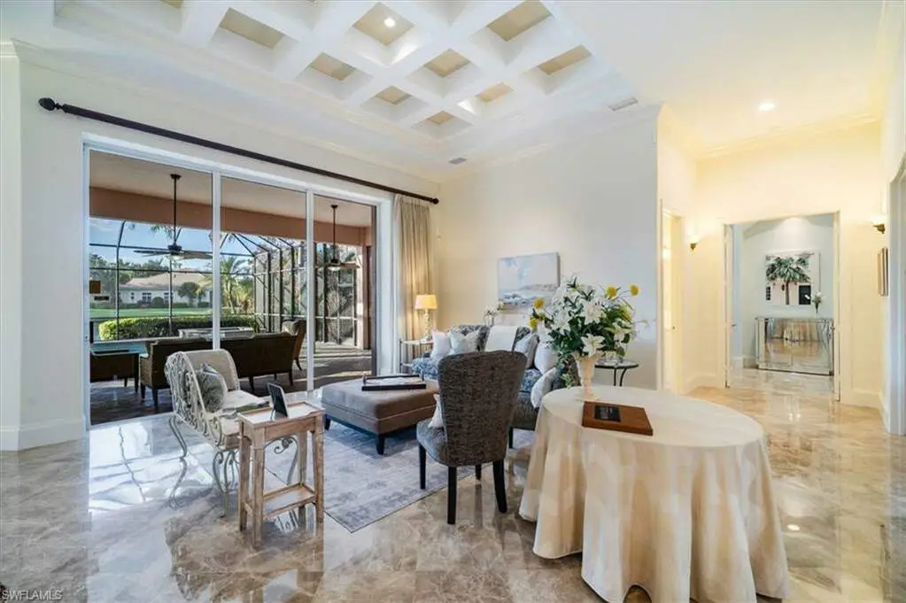 Nestled behind the gates of the prestigious Vineyards Country Club, this custom-built residence is a rare gem that showcases exceptional craftsmanship, thoughtful design, and a host of luxury upgrades that set it apart. December 2023 NEW ROOF!! Nestled behind the gates of the prestigious Vineyards Country Club, this custom-built residence is a rare gem that showcases exceptional craftsmanship, thoughtful design, and a host of luxury upgrades that set it apart. Designed by a discerning builder for personal use, the home offers numerous high-end extras not commonly found, including soaring ceilings that create a grand sense of space and scale, extensive custom millwork, and refined architectural details throughout. From the moment you arrive, the curb appeal is striking-with a stately governor's paver driveway, side-entry 3-car garage, and lush, mature landscaping enhanced by fresh mulch, all situated on a quiet, oversized cul-de-sac lot offering unmatched privacy and picturesque lake views. Inside, the elegant marble-floored foyer opens to a gracious living room with coffered ceilings and seamless flow to the expansive screened lanai, ideal for indoor-outdoor living. The home's layout is both functional and inviting, with formal and casual dining areas, an updated white kitchen with solid-surface countertops, a breakfast bar, and a glass-enclosed breakfast room bathed in natural light. The oversized family room and outdoor summer kitchen make entertaining effortless. Each guest suite is a private retreat, with luxury vinyl "wood look" flooring, custom double closets, and individual bath access that have been remodeled and updated. The owner's wing is a sanctuary, offering two walk-in closets, lanai access, and a spa-inspired bathroom with a walk-through shower and dual vanities. An additional flexible space serves as a fourth bedroom or office, and the third garage bay has been transformed into an air-conditioned bonus room, ideal as a game room, gym, or "mancave." A prime location within one of Naples' most established and amenity-rich communities, this residence is the perfect blend of elegance, comfort, and thoughtful upgrades.