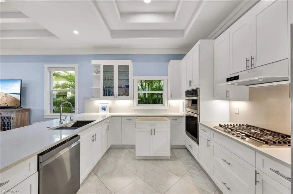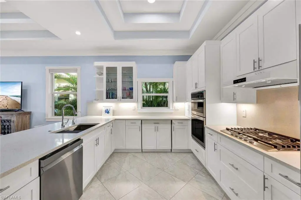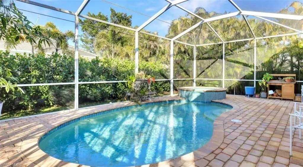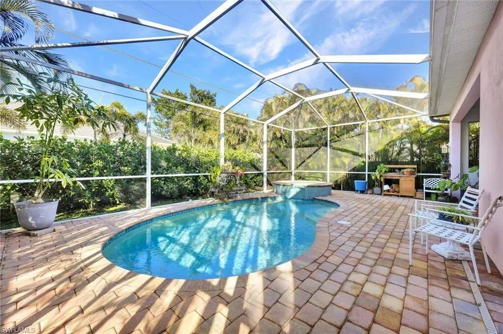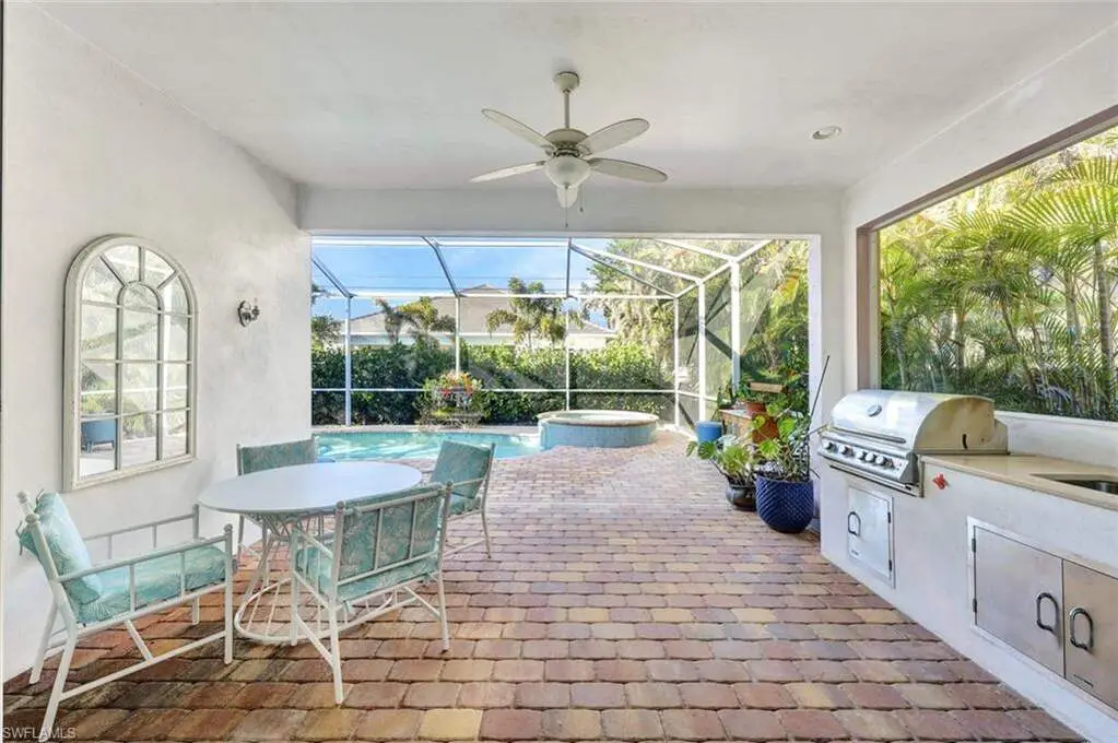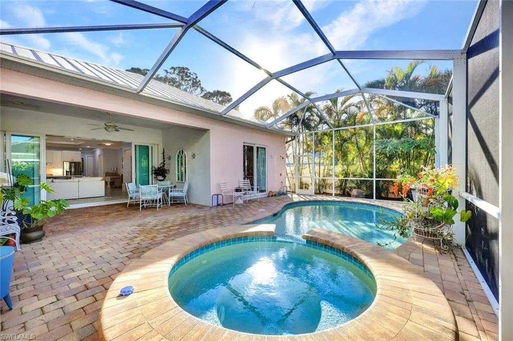 Exceptional 3 bedroom PLUS DEN & 3-bathroom is well appointed with high-end finishes and nearly 2,000 square feet of sophisticated living space - every corner invites you to relax and unwind! Open concept and high ceilings throughout create an expansive, open feel. Dramatic double Tray ceilings in the kitchen, living room, and primary bedroom add architectural elegance. Calming coastal-inspired interior provides a serene, yet refined atmosphere. Newly remodeled kitchen designed with thoughtful details in mind - new quartz countertops with waterfall edge and backsplash, all new stainless-steel appliances and hard-to-come-by gas cooktop. Oversized breakfast bar in the kitchen and pull-out butcher-block island/prep area provide both function and style. Freshly updated primary bathroom is a luxurious retreat, featuring a marble-encased shower room with waterfall showerhead. Versatile den offers more space to easily adapt to your needs. Enjoy seamless indoor-outdoor living with stunning disappearing sliding glass doors to create an unobstructed, open view. Generous sized lanai is enclosed by lush palms, creating a private oasis where you can lounge by the heated saltwater pool and spa, or entertain friends & family in the brand-new summer kitchen, ideal for al fresco dining and gatherings. Seashell pink exterior is complemented by professional tropical landscaping and metal roof, setting the stage for a true Key West-inspired escape. Within walking distance from white sugar sand and clear blue water at Vanderbilt Beach. Shopping, dining, and entertainment options are plentiful at Mercato just minutes away. Indulge in luxury at the nearby world-renowned Ritz Carlton. This location truly provides the best of Naples - all with no HOA fees or restrictions. High & dry in Flood Zone X. Whether you're looking for a full-time residence or a vacation home, this property is a rare find!