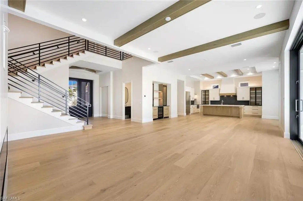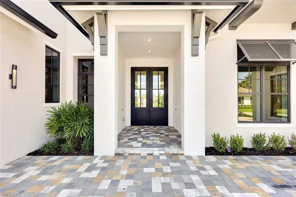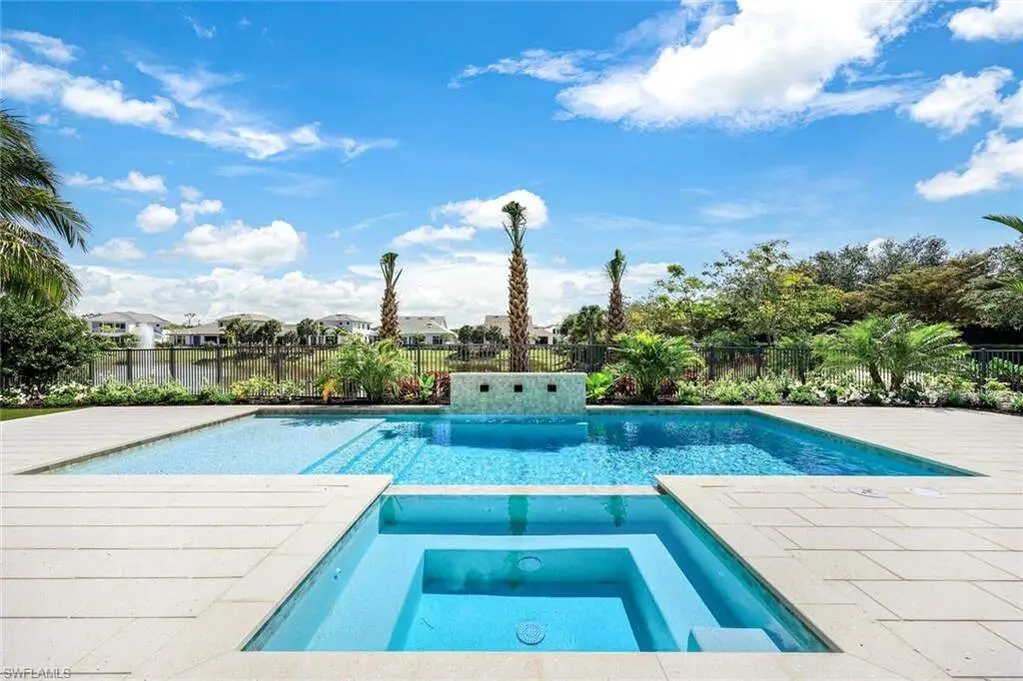 Nestled within Naples, a picturesque gated community awaits, where brick-paved streets wind through meticulously planned landscaping, leading to a stunning lakefront residence. Embracing the epitome of outdoor living, the expansive lanai offers a pool, spa, and outdoor kitchen, perfectly complementing the captivating lake views. This charming corner-lot retreat boasts a fenced yard and green space, ideal for children and pets to roam freely. The interior exudes a culinary allure, featuring a gourmet-inspired kitchen with GE Monogram appliances, while a wood beam ceiling and fireplace add warmth and character. Seamless convenience awaits with proximity to Seed To Table, Gulf beaches, Mercato, and SW FL International Airport, making every day a celebration of leisure and luxury within The Promenade's embrace. A vision of idyllic living, this lakefront haven weaves an enchanting tale of comfort and elegance.