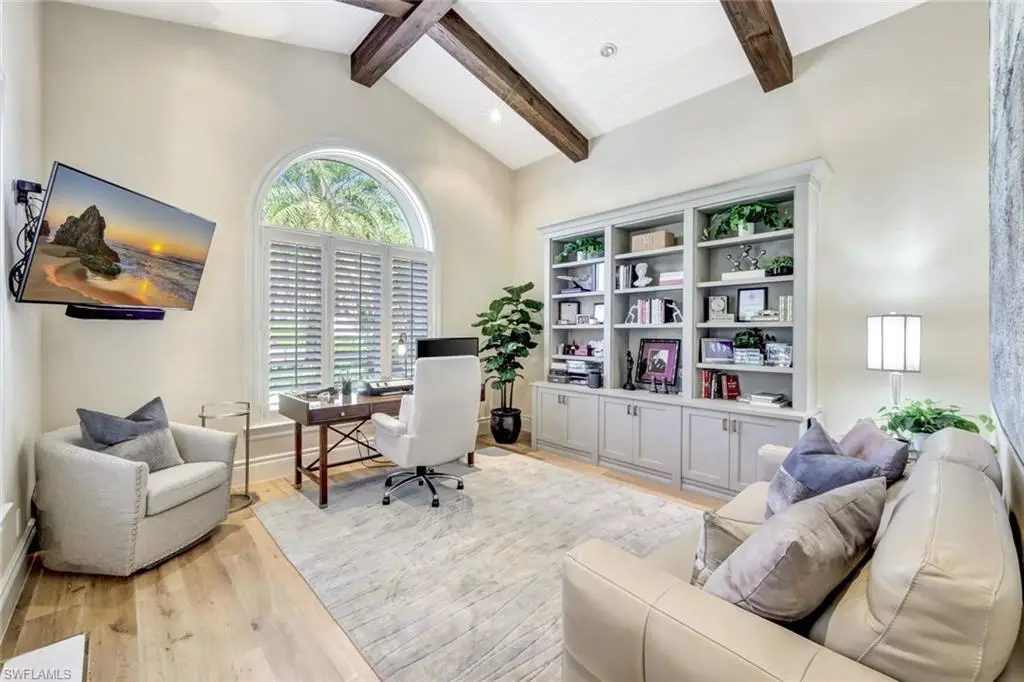 This exquisite custom estate welcomes you with sweeping southern lake views that transition seamlessly to the stunning fairways beyond. With 3 bedrooms, Den and 3.5 baths it is designed for both comfort and sophistication, the open-concept floor plan is impeccably decorated by a professional designer and features rich Pecky Cypress beams, stone and wood flooring, and a gourmet chef's kitchen. The outdoor living space is equally impressive, with a summer kitchen, fireplace, and sparkling poolùprotected by a state-of-the-art ôbuzz offö systemùall surrounded by lush, tropical landscaping that creates the sense of a private island retreat. The private office is flooded with natural light and includes custom built-ins, while the expansive owner's suite showcases breathtaking views and a spa-inspired bath. Every detail has been thoughtfully curated, from the whole-house generator and Icynene attic insulation to automatic storm and bug screens, Sonos sound system, security system, and pool with both gas and heat pump options. Located in Talis Park, a renowned Norman/Dye-designed golf community consistently ranked among Florida's top courses, this residence offers more than just a homeùit offers a lifestyle. Residents enjoy access to the award-winning Vyne House clubhouse, world-class fitness, tennis, spa, fine dining, vibrant social events, and a private beach shuttle. A true blend of timeless craftsmanship and modern luxury, this home embodies the very best of Naples living.