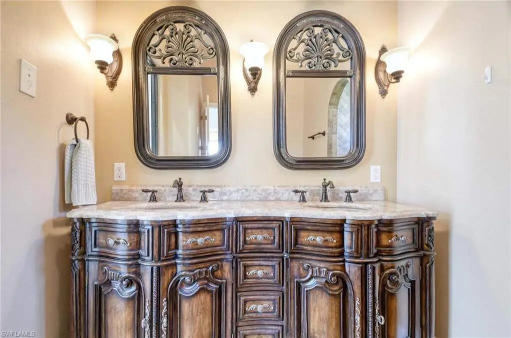 This exquisite estate in Da Vinci Estates at Olde Cypress boasts a new roof and gutters, a fabulous and rare FIVE CAR garage (set up as 3 and 2 on the courtyard), and ample space for family enjoyment. This home is a creation for making lasting family memories for multi-generations. Recently painted, the home features an impressive second floor with a movie theater, billiard room with bar, and half bath. The expansive primary bedroom includes sliders to the lanai, an oversized walk-in closet, and a sitting room, gym or second office space. With newly installed HVACs in 2025, stunning lake views and water feature from multiple rooms, and lightly lived-in, this property is perfect for both extended family gatherings and a serene primary residence for a family living in a vibrant community. The pool has a grotto spa with a cascading waterfall sure to delight the children. The cabana has resplendent views of the lake and an entrance to the lanai, full bath and mini bar. Guests will feel the expansiveness of the guest accommodations measuring 16'9" x 14'7" and 15'4"" x 14'0". The Cabana bedroom measures 15'1" x 15'3". The Den could be used as a fifth bedroom (13'2" x 27'7") with an ample closet. The Primary bedroom encompass the entire east wing of the home and measures 16'7" x 27' with a closet 14'2" x 10'7". The tub room is oversized and the shower room is a separate room. Two commode rooms in the primary bath suite. The oversized laundry room is 14'5 x 10'7". As the discerning buyer would expect, the home has extensive millwork and solid wood doors throughout. For those appreciating privacy, this home enjoys 140 feet of frontage at the street. DaVinci Estates has an additional gated entrance. The Club is a well respected PB Dye course that many golfers that do not reside in the community join for its challenge. It has had consistent renovations with the fastest drying greens in the county. Social membership is required for residents, with no initiation fees. Tennis, pickleball, bocci and fitness center with club house dining is all included in the social membership. (no minimums!) ONLY 550 homes in this community and all are single family homes makes for a neighborhood feel that is very social and FUN. Check out The Club at Olde Cypress Facebook page to see all of the social events. NEW expansion plans UNDERWAY for the clubhouse, With NO Assessments. NO CDD. Note where the guard gate is here. It is on the other side of the clubhouse. During reciprocal season, many golf communities have guests in and out of the residential streets--not the case here where only registered guests enter the residential streets of Olde Cypress. Logan's Landing and Founder's Square are close, Mercato is is a short drive. Peace of mind in living east of the gulf, but close enough to enjoy all that it offers, giving you the best of both worlds. Be sure to watch the DRONE VIDEO link of the interior and outside.