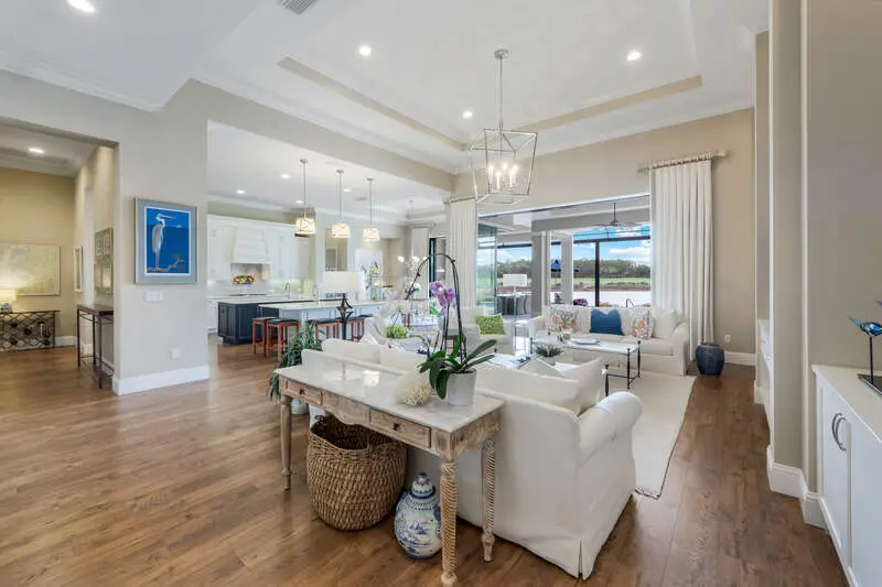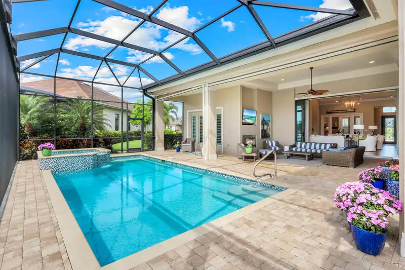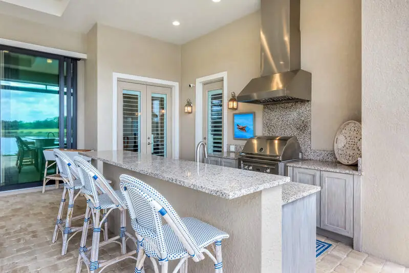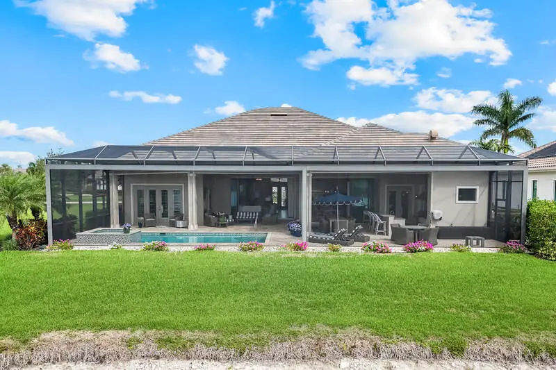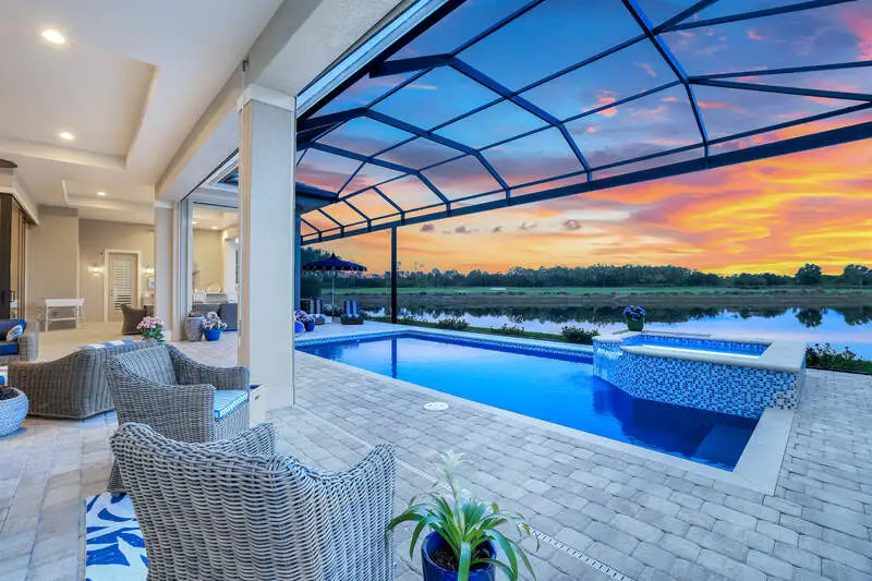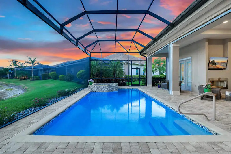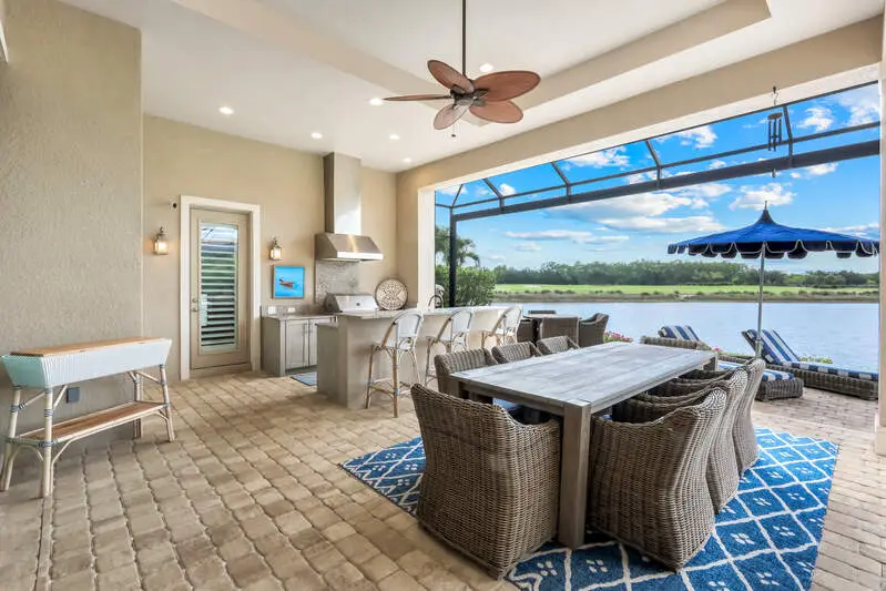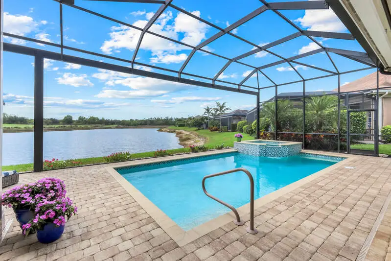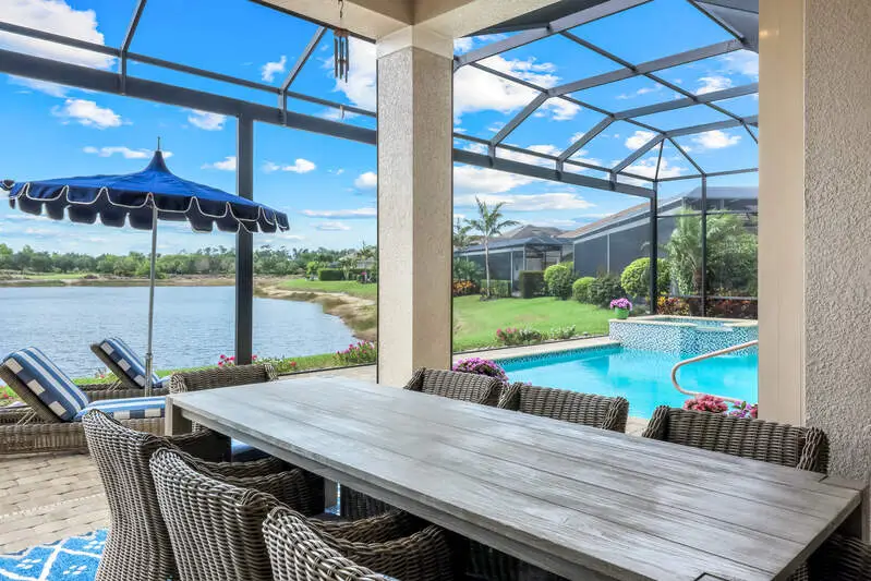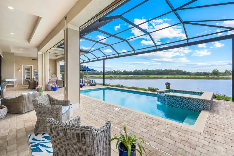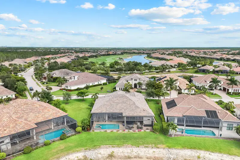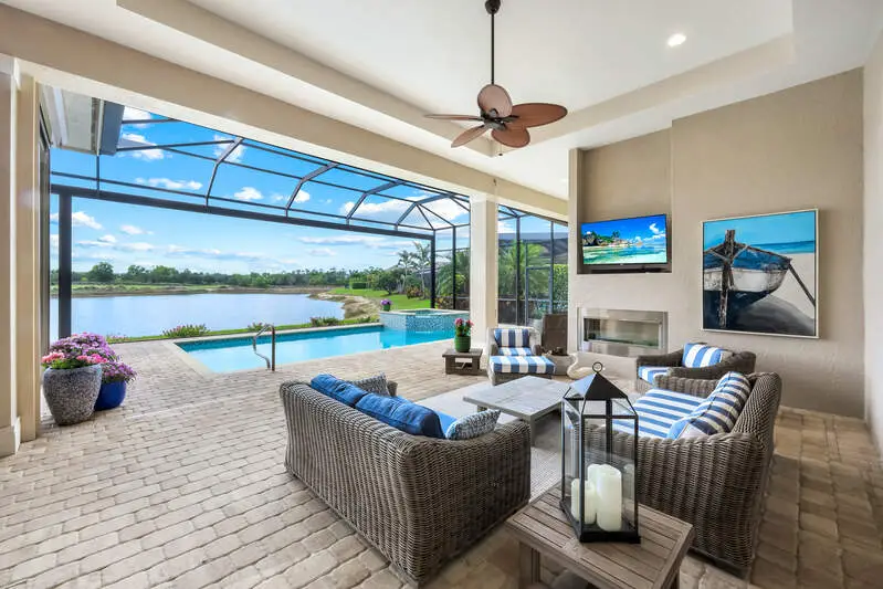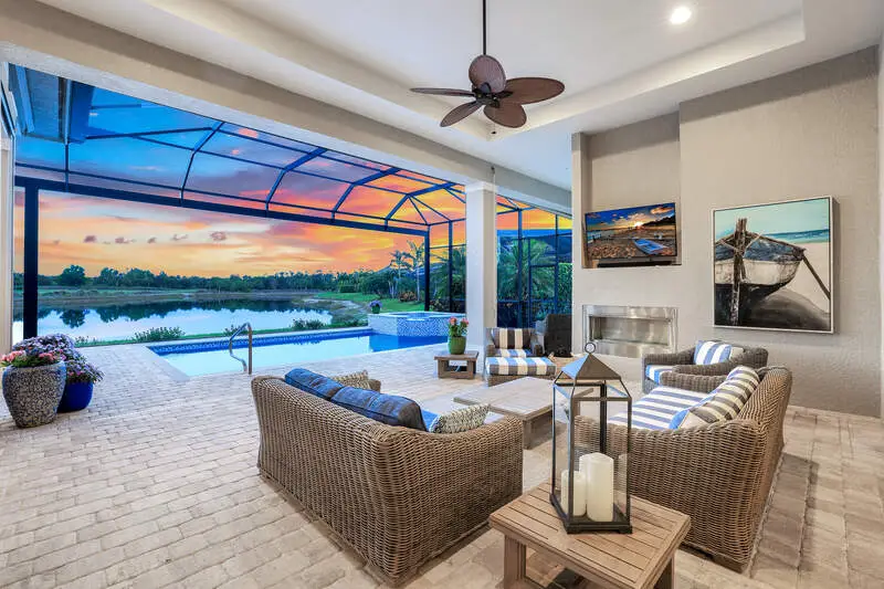 A rare opportunity awaits on Esplanade's most private enclave of custom estates. FULL GOLF MEMBERSHIP INCLUDED. This exquisite Glenmore floor plan custom built by STOCK Development is ideally situated on a quiet, coveted street, offering an unmatched blend of privacy, sophistication, and panoramic views of the lake, golf course, and natural preserve. From the moment you enter, you'll be captivated by the elegant finishes and breathtaking scenery that frame every window, a perfect harmony of resort-style luxury and timeless design. Thoughtfully designed for both everyday living and grand entertaining, this 4-bedroom plus den, 4.5-bathroom home welcomes you with an expansive open layout and seamless indoor-outdoor flow. The heart of the home is a designer chef's kitchen featuring TWO, 9-foot islands and one that comfortably seats eight, GE Monogram appliances, custom cabinetry with under-cabinet lighting, and a Dual Zoned Wine and Beverage Refrigerator. The adjacent living and dining spaces are adorned with custom millwork, tray and coffered ceilings, elegant light fixtures, plantation shutters, crown molding and custom drapery, all adding layers of warmth and sophistication. The luxurious primary suite offers a serene escape with dual walk-in closets, a cozy reading nook, and a spa-like bathroom complete with a freestanding soaking tub, oversized walk-in shower, double vanities, and a dedicated makeup area. Each guest bedroom enjoys its own private en-suite bath, providing comfort and privacy for family and friends alike. Step outside and experience true resort living on your private lanai, where brick paver flooring extends to an inviting outdoor fireplace and TV lounge, a full summer kitchen with bar seating, an outdoor shower, and a spectacular saltwater pool and spa with spillover feature, all under cover and protected by Storm Smart motorized screens. The home is further enhanced by a whole-house generator, impact-rated windows and doors, a full-home water filtration and reverse osmosis system, and an air-conditioned three-car garage with built-in storage. Located within Naples' premier bundled golf community, Esplanade offers an unmatched lifestyle including an 18-hole private golf course, resort pool with cabana bar, full-service spa, tennis, pickleball, bocce, state-of-the-art fitness center, and 11 miles of walking and biking trails. The 54,000-square-foot clubhouse features fine dining, wine lockers, and a calendar full of social events and activities. This is more than a home, it's a private sanctuary where luxury, lifestyle, and location come together in perfect harmony. ALL THE GOLF, TENNIS, FITNESS, PICKLE BALL AND LIFESTLYE AMENITES ARE INCLUDED WITH THE PURCHASE OF THIS HOME.
