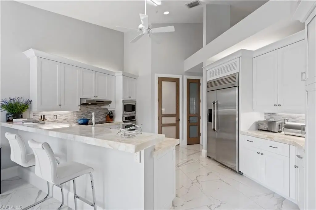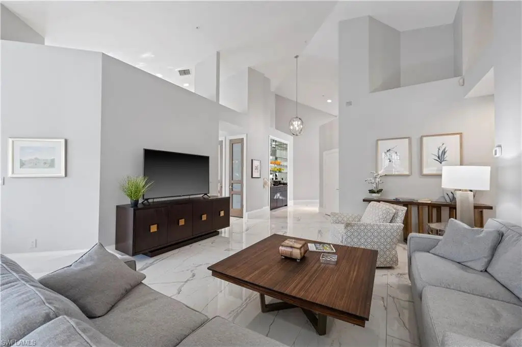 This impeccably modern second-floor retreat in the prestigious Colonnade of Park Shore redefines Naples luxury living. Spanning almost 2,500 square feet, this residence features a soaring double-height entry, a private elevator, a dedicated garage, and a generous screened lanai with automated storm shutters. Every inch exudes refined elegance and meticulous attention to detail. Inside, discover sophisticated touches, with built in bar, polished marble flooring throughout the living areas and primary suite, crisp paint, custom crown moldings, and sleek marble countertops in the gourmet kitchen and spa-inspired bathrooms. Enhanced with bespoke cabinetry, frameless glass showers, a decadent soaking tub in the primary bath, coffered ceilings, and stylish blinds, the home radiates modern luxury. Solid-core 10ft doors with etched glass panels and advanced ambient lighting complete the elevated aesthetic. Enjoy the large outdoor lanai with a spacious patio perfect for your morning coffee or evening beverage. Additional features to this home include an attached garage for your convenience with a private elevator to the main level.The ColonnadeÆs exclusive amenities include a vibrant social lounge with a catering kitchen, grill area, a sparkling pool, and a relaxing spa.The Colannade, a pet-friendly community, also offers a library, and fitness studio. Conveniently located steps to the beautiful shops and varied dining options in Venetian Village, and the sugar sand beaches of the Gulf, this home offers the epitome of upscale Florida living. Private access to Park Shore Beach. Indulge in world-class Naples sunsets, dining, and shopping. Don't miss the opportunity to make this exquisite property your new home.