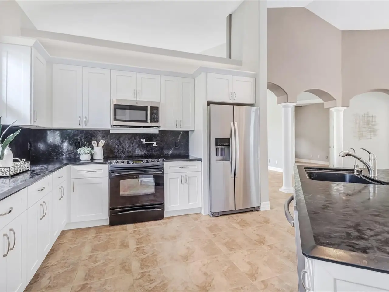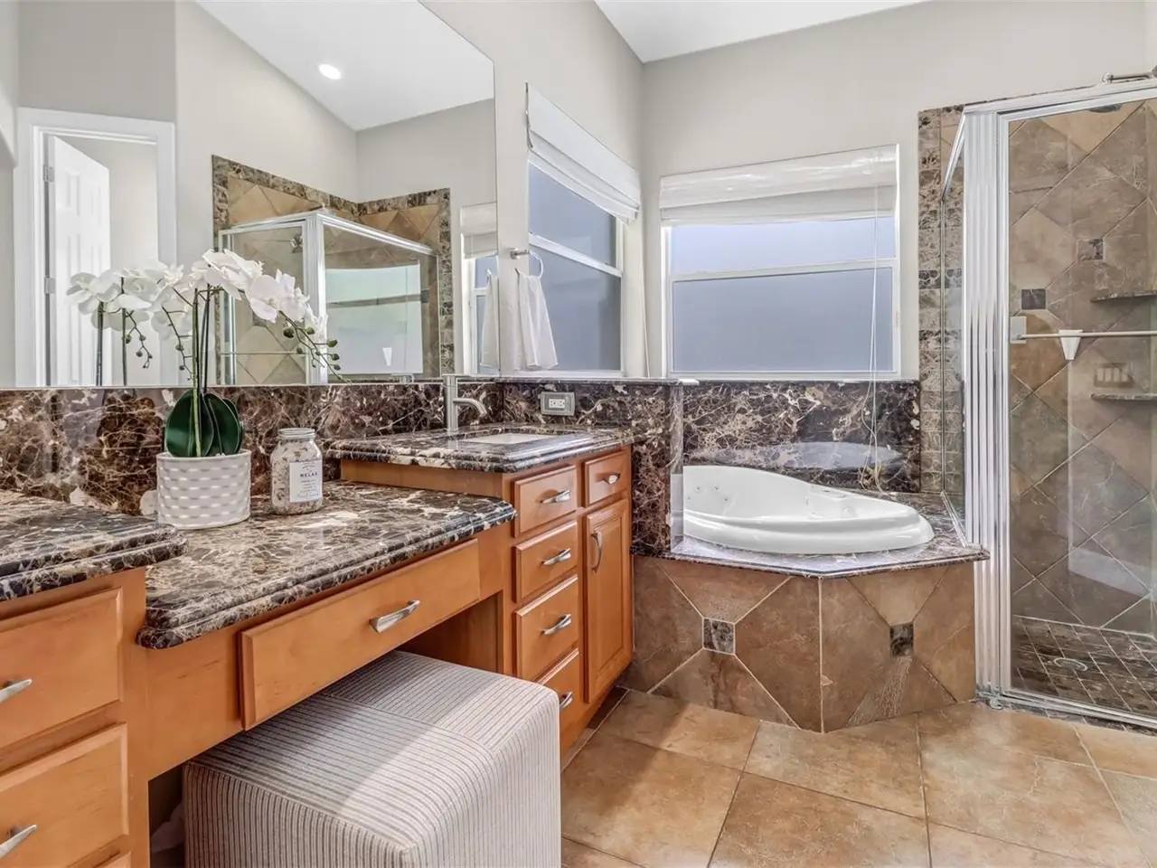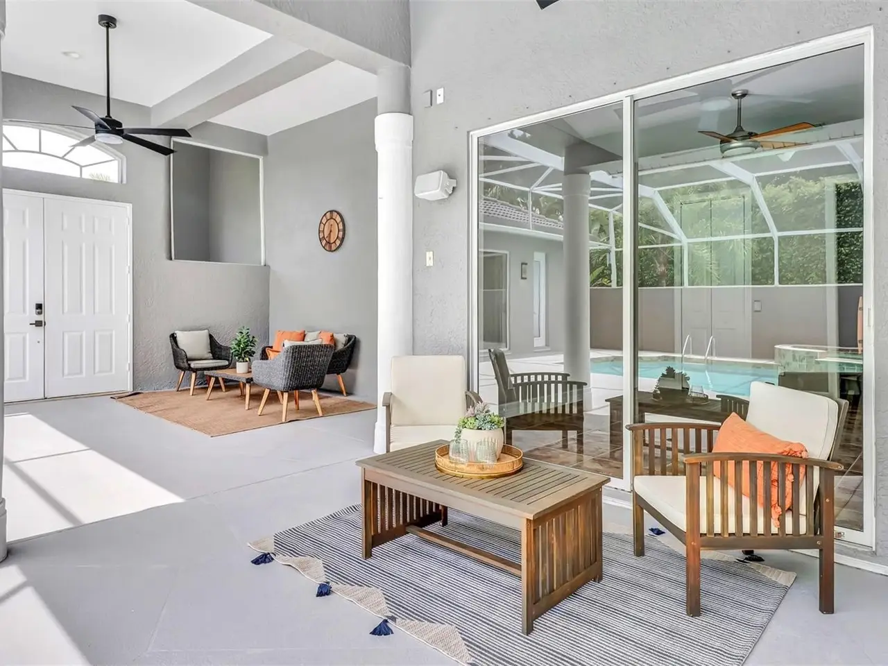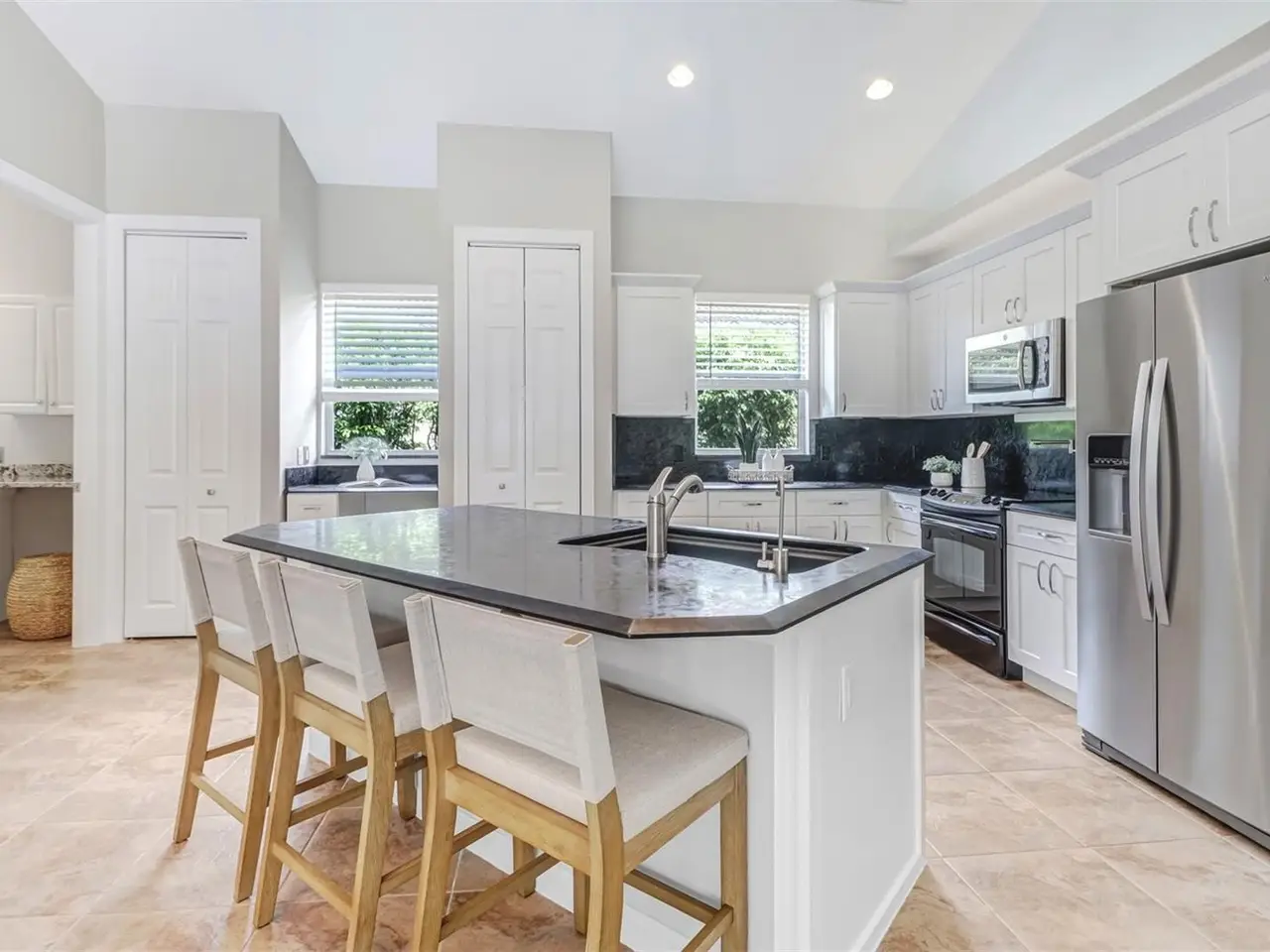 Luxurious Home in the Sought-After Wilshire Lakes Gated Community. Welcome to your dream home in the desirable Wilshire Lakes community. This exquisite property invites you into a stunning courtyard, accessible from various rooms throughout the home. The courtyard features a serene, lighted and heated pool/spa with a cascading waterfall, perfect for relaxation and self-care. Ideal for entertaining family and guests, this private oasis is enclosed by a screened courtyard offering both sun and shaded areas. The pool has new heating, filtration, lighting and fans for ambience, this courtyard/lanai ensures year-round enjoyment. This contemporary design includes four spacious bedrooms and 3.5 baths that has been meticulously maintained highlighted by an extra-large open kitchen with high vaulted ceilings, new cabinetry that boast rare Brazilian granite countertops with an extra-long beveled edge, stunning hardware and light fixtures, a wet bar on a diagonal for great conversations adjacent to the dinette area. The kitchen features appliances, including a pot-filling tap over the stove/oven, microwave, and refrigerator and a new dishwasher. Plenty of cabinet space with a pantry and built in desk area. This home was built in 2005 there are extra windows to bring in the bright natural light along with the appealing views. French doors off lanai that is easily accessible for a pool lavatory that has decorative art tiles and a pedestal sink. Walk through the grand pillars with vaulted ceilings and you will enter the living room, offering a relaxing retreat with privacy bushes and a view of the backyard lake. The primary bedroom is a sanctuary with an ensuite bath featuring a tile shower, spa tub, large walk-in closet, linen closet, dual sinks, vanity and provides a private water closet. Additionally, it has sliding doors leading to the courtyard along with a private side porch/dog run. A spacious laundry room with granite countertops, plenty of cabinetry, a washer/dryer, and a utility sink. That leads to the two-car garage, includes hurricane shutters and attic access. The courtyard includes a separate guest In-law suite/Cabana with a detached private entrance, kitchenette (stove, refrigerator, cabinets, sink), full bathroom, closet, and separate air conditioning. The traditional Florida exterior that has been completely painted, professionally landscaped along with landscaping lights, new sod in the front and the side yard, new roof in 2019. Situated on a private street corner, this home offers low HOA fees with great amenities and access to “A” rated schools. It’s conveniently located near North Naples shopping, dining, parks, and the beautiful Gulf beaches. Don’t miss the opportunity to own this stunning property in Wilshire Lakes. Schedule a tour today and experience luxury living at its finest!