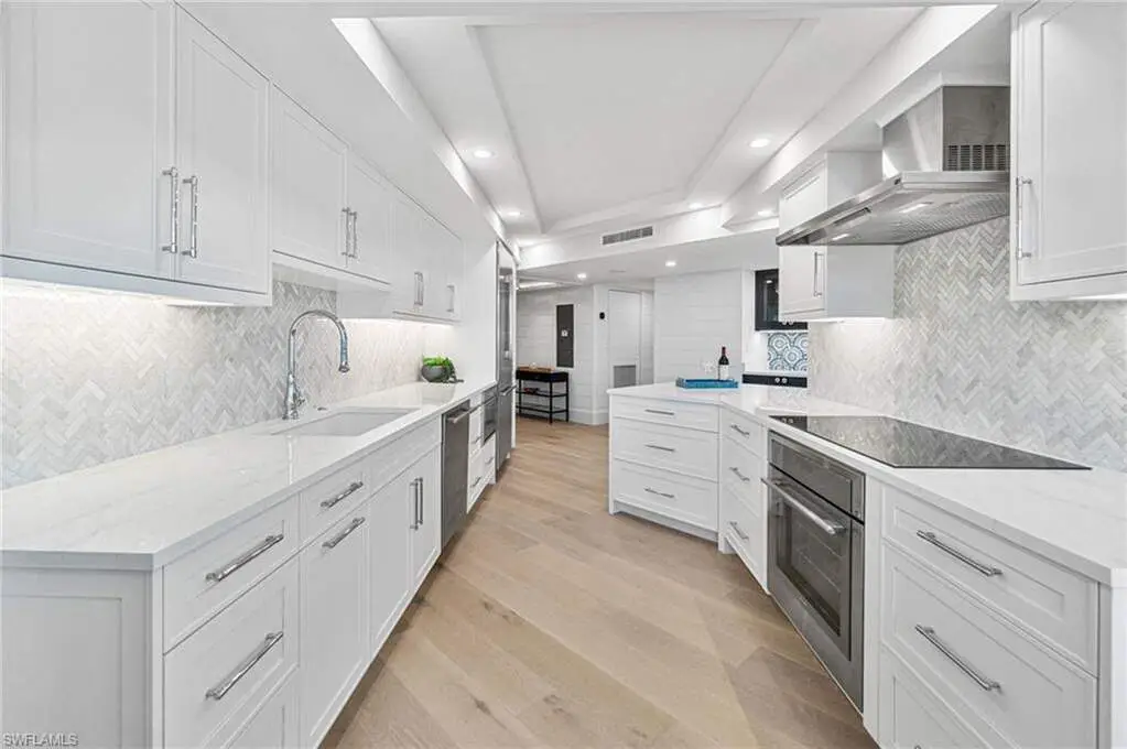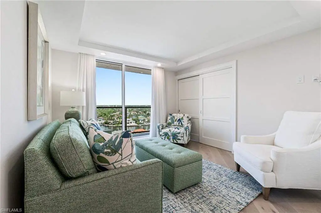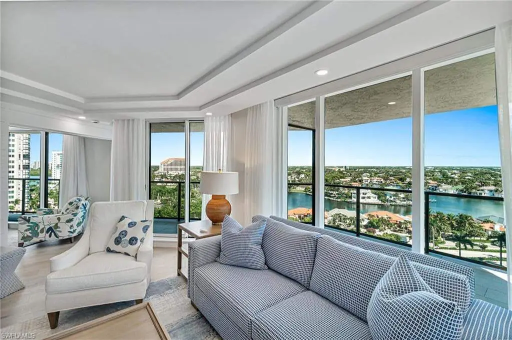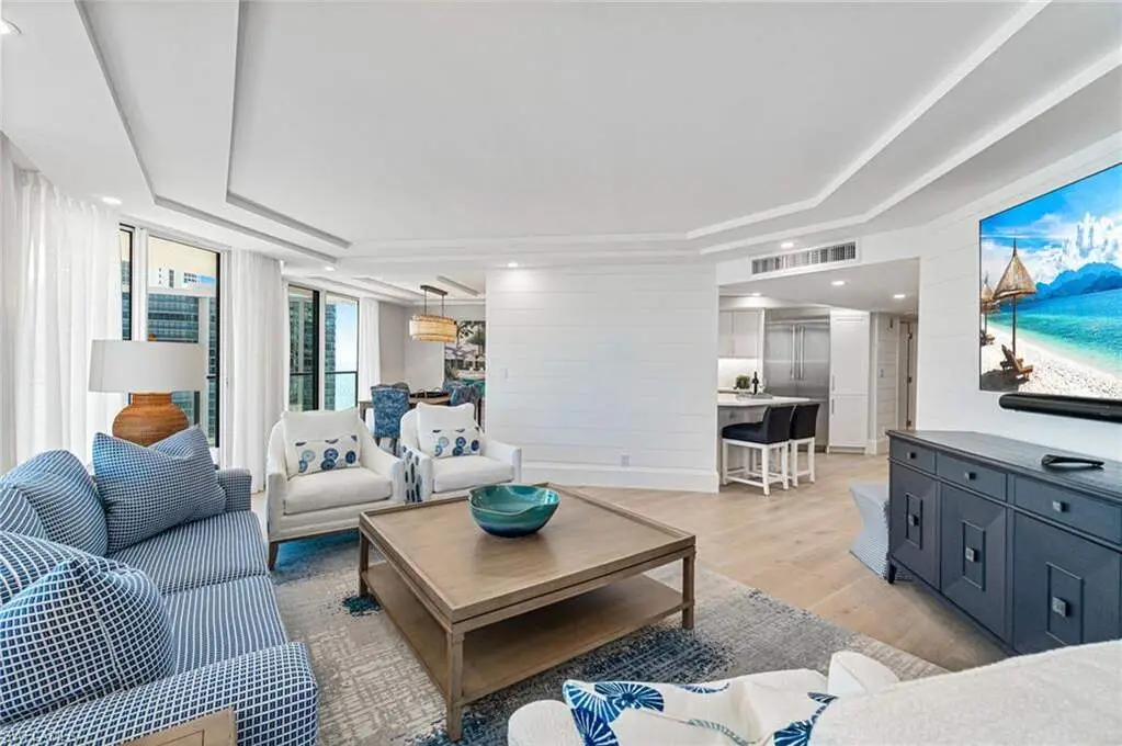 Experience the ultimate in modern coastal living in fully redesigned 3 bedroom, 3 full bath residence at The Meridian Club, one of Park Shore's most prestigious beachfront addresses. Perched on the 15th floor, this turnkey designer condo offers sweeping views of both Venetian Bay and the Gulf of Mexico - a true Naples retreat for discerning buyers relocating from "up North". The chef-inspired kitchen is a showpiece, featuring a Thermador appliance package with induction cooktop, built-in drawer microwave, and all stainless steel appliances. Elegant white cabinetry, quartz countertops, a white and gray herringbone backsplash, and high-end fixtures create a clean, coastal aesthetic. A breakfast bar for two adds casual dining space, while the complimenting wet bar with navy cabinetry, glass display, and patterned tile backsplash makes entertaining effortless. Designed by Diane Torrisi Designs and Kevin Steffanni Design Group, the home features wide-plank wood flooring, stepped ceilings, frosted glass and solid doors, and an open, light-filled layout leading to an expansive wraparound balcony with updated glass railings and a glass-enclosed seating area perfect for sunset views. The primary suite is a sanctuary with three custom closets, mirrored doors, and a spa-style bath with multiple shower heads. Two en-suite guest bedrooms offer refined comfort and privacy. High end designer furnishings, electric shades, custom draperies, and mounted TVs complete this elevated retreat. The Meridian Club sits on 3.5 acres of beachfront with only four units per floor. Enjoy a 24-hour doorman, resort-style pool and spa overlooking the Gulf, tennis and pickleball, outdoor grill area, and direct access to Naples' white-sand beach. Located minutes from Venetian Village's fine dining and boutique shopping, this home embodies effortless beachfront sophistication. Turnkey. Renovated. Ready for your Naples lifestyle.