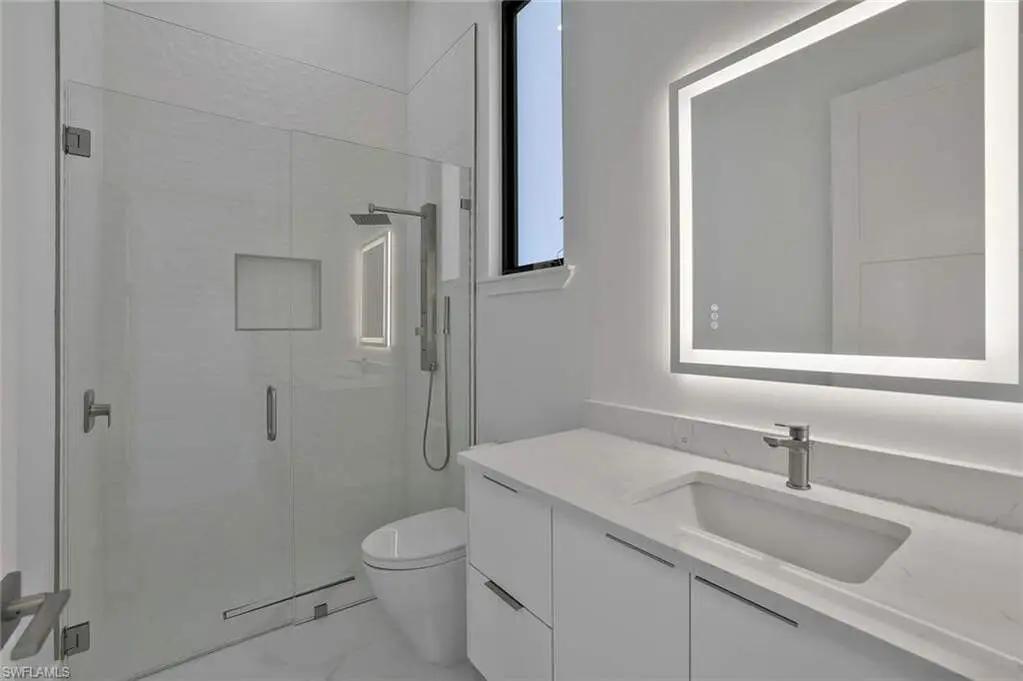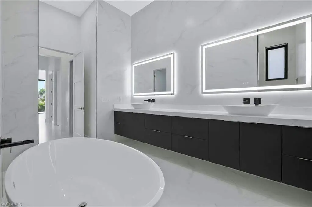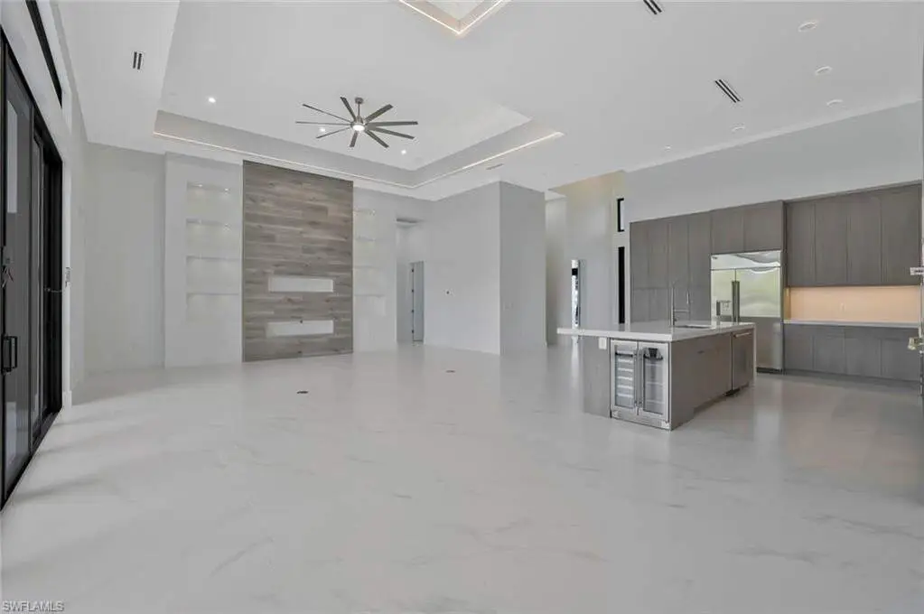 This exceptional new construction home is located in one of the best areas with no flood concerns. Designed with an open-concept layout and soaring ceilings, this residence features 4 bedrooms plus a dedicated office, 4 full bathrooms, and an inviting outdoor oasis complete with a pool and spa. The gourmet kitchen showcases quartz countertops, sleek modern cabinetry, a spacious center island, double oven, and a beverage cooler-perfect for entertaining. The expansive primary suite includes dramatic 90-degree sliders that open directly to the pool area. The luxurious en-suite bathroom features a freestanding tub, oversized shower, dual vanities, and two walk-in closets. One of the front bedrooms offers direct access to a charming front porch terrace, providing a private outdoor retreat. Additional highlights include impact-resistant windows, tile roof, 3-car garage, abundant natural light, and Lutron dimmer switches throughout the home for customizable lighting and ambiance.