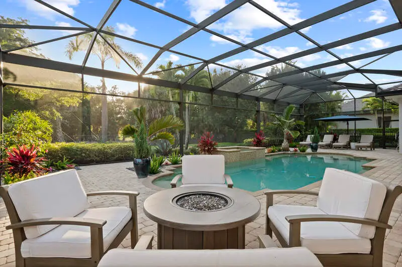 Experience the perfect blend of comfort and style in this newer yet freshly upgraded home thoughtfully inspired by Cardamom Design. Offering the most sought after southwest exposure, the screened lanai features various areas for relaxing, a full outdoor kitchen, built-in fireplace and inviting fire pit plus all-day sun and magnificent evening sunsets. The indoor/outdoor flow delights with a bright, open floor plan and premium finishes end to end- including a gourmet kitchen with upgraded appliances, newer countertops, custom cabinetry and wrap-around island for easy entertaining, a soaring great room with built-in tv wall and wine cooler and clever architectural touches throughout. The primary suite is a private oasis with a spa-like bath and generous walk-in closets while the overall floor plan flawlessly functions to allow privacy for owners and visitors alike. Dine al fresco or step inside to a separate dining room with built-ins or a casual breakfast area. Recently painted inside and out with many upgrades such as an air-conditioned 3-car garage with new built-in storage, Sonos sound system, custom closets and whole house generator, this home captivates at every turn.