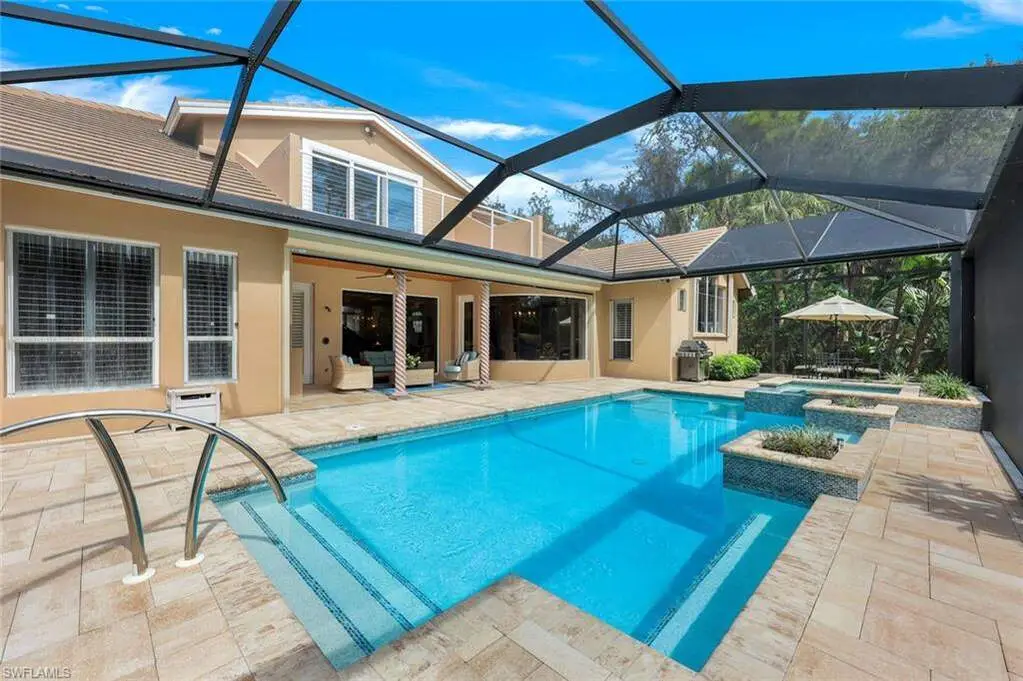 On the Sunny Side of Life ~ Tucked at the end of a quiet cul-de-sac, this residence offers the rare combination of privacy, space, and a premier southern orientation. Nestled on a generous half-acre with 185 feet of frontage against a backdrop of lush tropical foliage, the home lives like a tranquil retreat designed for both relaxation and entertaining. Inside, the light-filled four-bedroom-plus-den/office floor plan flows seamlessly, anchored by a spacious island kitchen with wood flooring, custom wood cabinetry, stainless steel appliances, and ample pantry space. Remodeled baths and a redesigned laundry room feature granite-topped, soft-close cabinetry elevating everyday living, while a gas fireplace adds warmth to the family room. Outdoors, the 33-foot lap pool and spa command attention, fully renovated and surrounded by an expansive new sun-soaked deck and panoramic-view lanai enclosure-ideal for morning swims or relaxed evenings under the stars. Practicality pairs with peace of mind through abundant storage, a full three-car garage, and recent updates such as a new roof, whole-house impact-rated storm protection, and a renovated upper balcony. At an enviable 11.3 ft elevation, this home is perfectly suited for the Southwest Florida lifestyle. Located in the prestigious Audubon Sanctuary Club of Collier's Reserve where world-class golf and active tennis and pickleball programs are coupled with premium amenities, multiple dining options, and a passion for environmental stewardship.