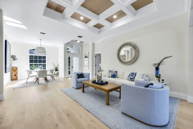 Experience a truly modern lifestyle in this recently remodeled four-bedroom, four-bath home, offering a modern aesthetic filled with natural light. Open concept living with 7" oak floors throughout, tiled accent wall in family room with Modern Flames fireplace and designer lighting throughout. Kitchen features new custom cabinetry, new Thermador appliances, tiled backsplash and Pompeii Quartz countertop. Custom glass enclosed wine storage in Dining Room. Spacious Master Suite allows access to Lanai. The ensuite bathroom offers a custom dual vanity & mirror with designer wall mount pendant lighting, a frameless walk-in shower, as well as a free-standing soaking tub for ultimate relaxation. A Spacious Guest Cabana with sliders to the pool and views of the beautiful back yard, offers your Guests their own space including a large, walk in shower, double sink vanity, walk in closet and Kitchenette. Step outside to discover a newly renovated private outdoor oasis, including new pool with sun shelf & spa, new pavers, screen enclosure and outdoor kitchen featuring an elegant stone wall, and integrated television creating the perfect venue for al fresco entertaining with a sought-after Western Exposure allowing for beautiful sunsets. Located on the coveted Bay Side of Audubon, the residence backs up to the 11th hole and offers views of the lush fairway, manicured landscaping, and a tranquil preserve. Audubon Country Clubs a 755 acre, Audubon-certified Sanctuary with a Joe Lee Signature 18-hole private course. IMMEDIATE GOLF PRIVILEGES with a "Social Waiting Golf" membership. Live the ultimate Country Club lifestyle in this welcoming and vibrant club featuring premier amenities such as tennis, pickleball, heated lap pool with poolside cafe, bocce, a state-of-the-art fitness center, kayaking and soon to be renovated Clubhouse.
