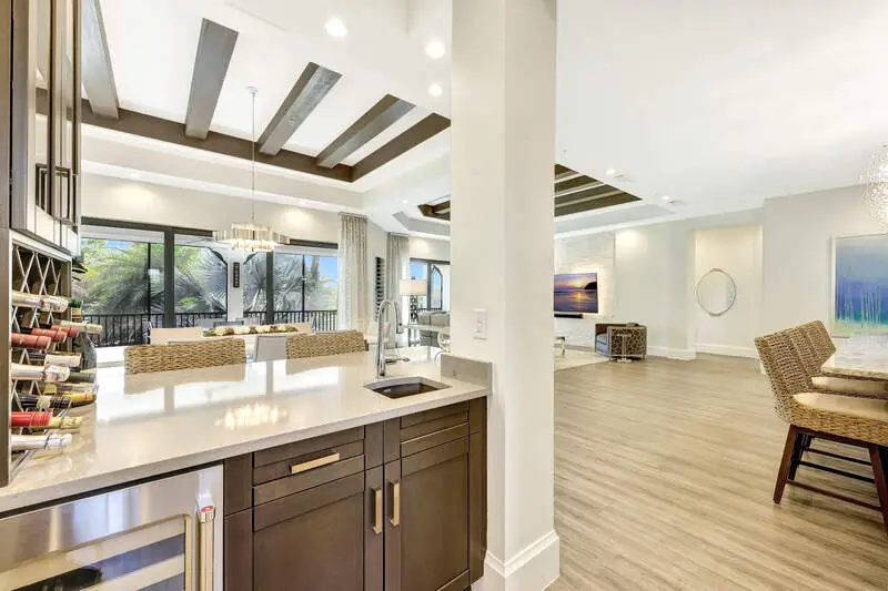 Sophisticated, Sunset-Filled Living in Talis Park's Coveted Corsica Neighborhood. Rarely available and highly sought-after, this three-bedroom plus den second-floor residence in Corsica at Talis Park presents a unique opportunity to own one of the community's most desirable floor plans in a premier location. Luxury and lifestyle meet in this exquisite second-floor coach home with private elevator, built in 2018 and located in the amenity-rich community of Talis Park. Spanning 3,382 sq ft of living space (4,402 total), this 3-bedroom + den/office, 3.5-bath residence delivers elegant design, expansive indoor-outdoor living, and high-end finishes throughout. Enter through a private courtyard into light-filled, open-concept living spaces designed for effortless entertaining and everyday comfort. The great room, dining area, and gourmet kitchen seamlessly connect and are highlighted by an 11-foot island, ceiling-high custom cabinetry, coffered ceilings, and natural gas-a true chef's dream. A spacious pantry, custom bar area, and floor-to-ceiling quartz accent wall with backlighting elevate the design even further. Step out onto the 53-foot lanai with rear-facing western exposure, long lake views, and an outdoor kitchen with built-in gas grill-a stunning setting for sunset dinners or quiet mornings. Every detail is curated for luxury living, from the dual private garages and private elevator to the thoughtful upgrades and designer finishes. Located just a short stroll from Talis Park's three-acre sports complex, residents enjoy access to six lighted Har-Tru tennis courts, four bocce lanes, a 50-foot lap pool, basketball hoops, a playground, tennis pro shop, and multiple on-site dining options. The community also features peaceful nature trails, a state-of-the-art fitness center (open 24/7), and an on-site spa offering a full range of services. Talis Park also features an award-winning championship 18-hole golf course designed by Greg Norman and Pete Dye, along with a nine-acre practice facility-a golfer's paradise nestled within one of Naples' most vibrant and active luxury communities. With its perfect balance of privacy, sophistication, and walkable access to resort-style amenities, this Corsica residence captures the essence of high-end Naples living.
