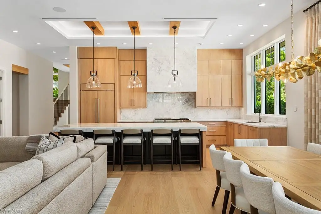STUNNING new construction home in Old Naples with 5,000 square feet of open-floor-plan living space. 5 bedrooms and 6 bathrooms. Top-of-line, sophisticated finishes throughout. The great room and kitchen are surrounded by floor-to-ceiling windows and sliding doors that open out to a covered patio and generous backyard with a lushly landscaped lawn, pool, spa, and fire table for effortless indoor/outdoor living. The ground floor includes a luxurious master suite & sitting room with a spacious, oversized bathroom and two enormous walk-in closets. A guest bedroom with bath is also on the 1st floor. The kitchen is equipped with custom cabinetry, Wolf/Sub-Zero appliances, two dishwashers and an island with seating for five. A walk-in pantry includes a wine cooler, two pull-out refrigeration drawers, and lighted, open shelving. The second floor has 3 additional large bedrooms, all with en-suite bathrooms and walk-in closets. All of the 2nd floor bedrooms open out to balconies for fresh air breezes and a seamless transition to an outdoor living experience. A large 2nd floor loft area also opens onto a large sunning balcony overlooking the pool for a relaxing environment. The home has two laundry rooms, one up, one down, for ease of daily living. The 2nd floor also includes a morning bar with sink and two refrigeration drawers. A Control4 smart home lighting system with Audio/Video is installed throughout the home along with a security system with multiple cameras - it can also be run via an iPad or smartphone. Motorized roll-down screens and hurricane shutters are at the outdoor patio. Windows and sliding doors are prewired for automated shades. Toto 700 series electronic toilets in all bathrooms. Natural gas has been brought to the home to fuel the Wolf six-burner range with griddle, the outdoor patio built-in grill, the two fireplaces, the tankless water heater, the heated saltwater pool & spa, the outdoor fire table, and a 48kW Generac generator housed on a roof pad to run the entire home in the event of a power outage. There are three air-conditioning zones for maximum comfort control with linear vents throughout the entire home for a sleek aesthetic appearance and optimal air distribution. Flood insurance is not required for this property (located in an X500 zone with a slab at over 11Æ NAVD). The home is designed by MHK Architecture, built by Lotus Construction, with interiors by Freestyle Interiors.