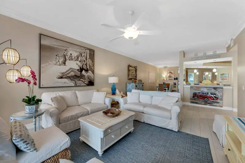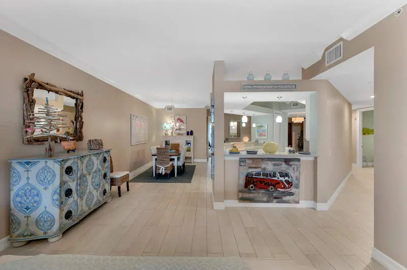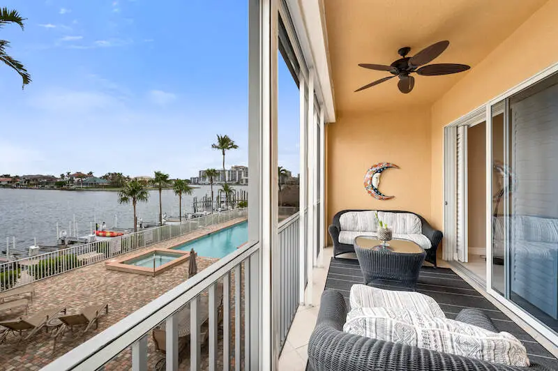 Welcome to this spectacular, beachy waterfront property in the heart of North Naples. This stylish first floor (second level) residence offers a coastal vibe and boasts stunning bay and gulf views from huge east and west facing lanais, perfect for catching both sunrise and sunset! The wide bay view overlooks three intersecting canals. The upgraded master faces the bay with huge separation from the two guest en-suite bedrooms that face the gulf. The den is hidden discreetly down the hallway from the primary bedroom. The interior features upgraded appliances, new flooring, renovated primary bath and beautiful kitchen counter tops. Also decorator shutters and electric storm shutters for added peace of mind. Amenities include a pool, two tiki huts, under building parking and extra storage for beach chairs making it a true waterfront paradise. Located across from the beach (public beach access across the street,) walking distance to La Playa and close to both the Ritz Carlton and Mercato, this home combines luxury and convenience for the Ultimate Naples Lifestyle!