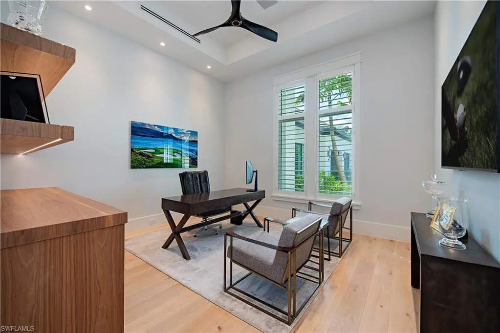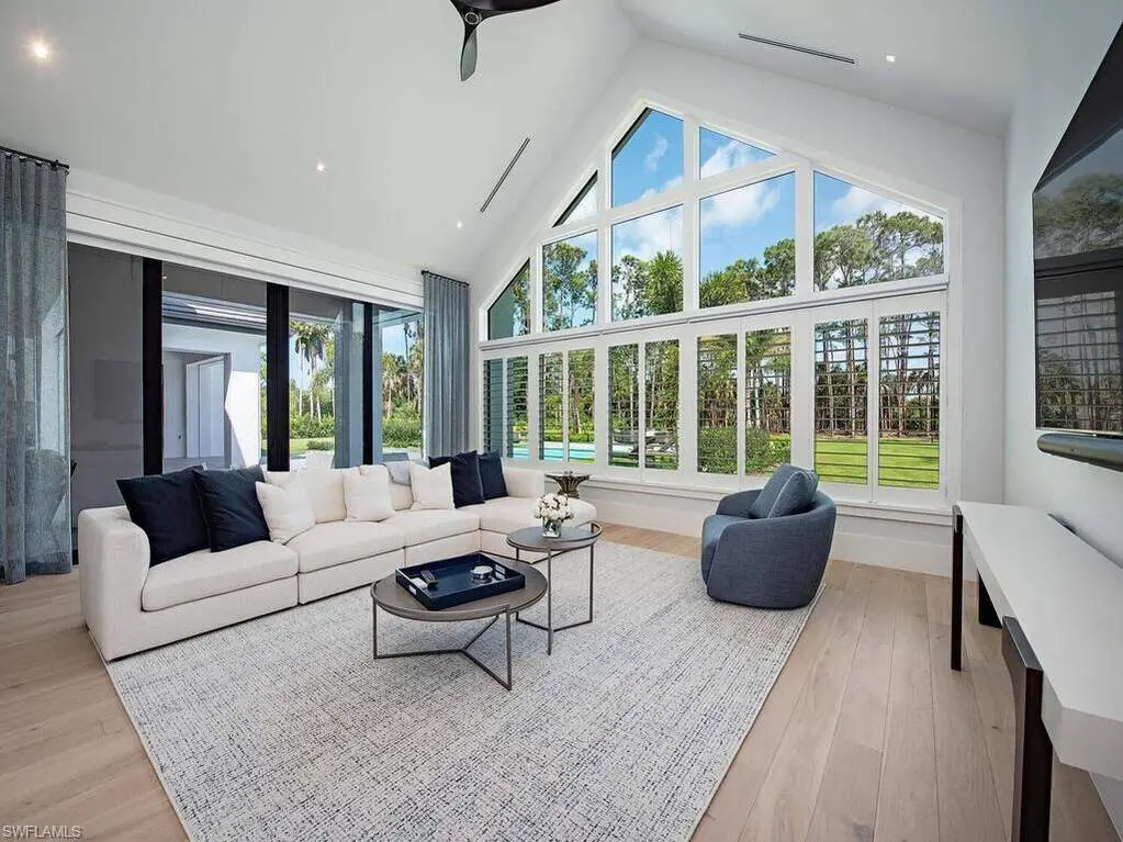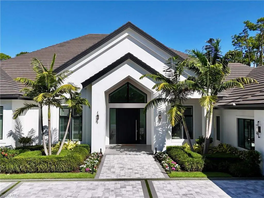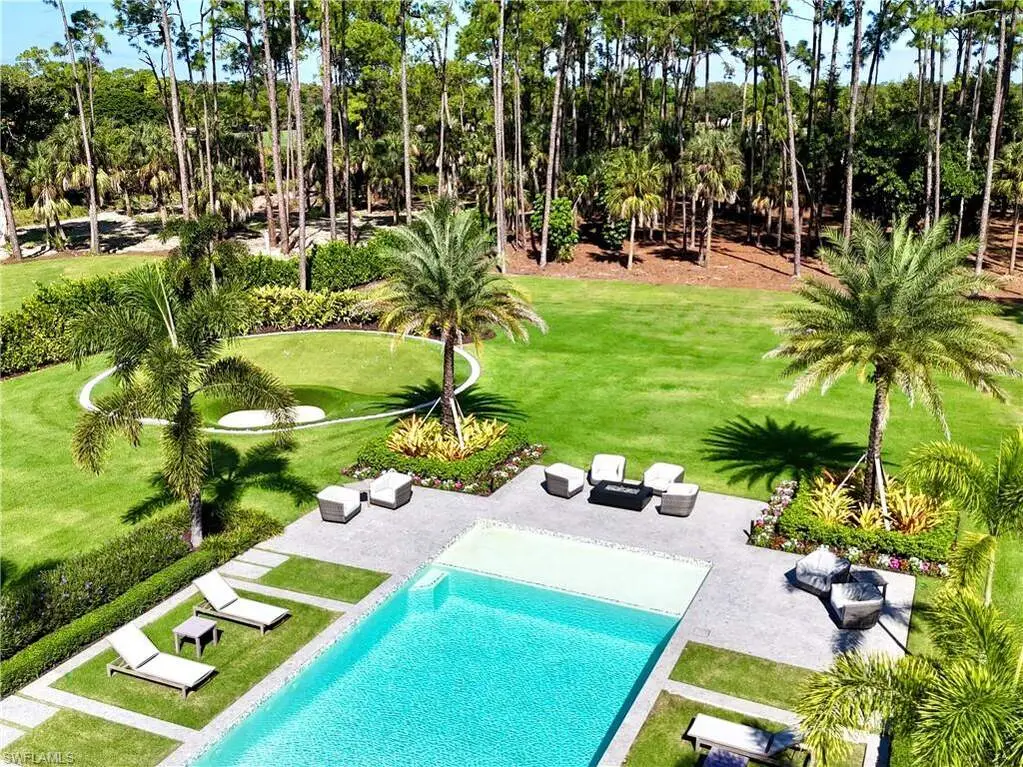 Welcome to Coach House Lane, a Gated residence celebrated for its luxury and privacy. This fully furnished 2023 estate sits on 2.58 acres of meticulously landscaped grounds with no HOA restrictions and offers over 7,200 sq. ft. of expansive single-level living. Designed for those who appreciate both comfort and sophistication, the home features a chef's kitchen with Wolf, Sub-Zero, and Miele appliances, a fully equipped prep kitchen/butler's pantry, bar and game room, dedicated media/entertainment room, private study, and a custom temperature-controlled walk-in wine room. The residence is enhanced by a Control4 Smart Home Automation system, providing seamless control of lighting, climate, entertainment, and security throughout. The sprawling backyard offers the ultimate retreat with a resort-style pool and spa, firepit, and a spacious lanai with fireplace and bar area-perfect for entertaining and relaxing. A professional lighted putting green with two hitting stations overlooks the pool, and there's ample room to add a tennis/pickleball court or guest house. Car enthusiasts will love the six-car, air-conditioned garage with soaring ceilings that can accommodate up to 12 vehicles, while the whole-house generator ensures uninterrupted comfort and convenience. The primary suite serves as a true sanctuary, offering a sitting area, morning bar, media room, spa-like bath, with a steam shower featuring integrated Bluetooth audio, and dual walk-in closets - including a luxurious dressing room with its own washer/dryer and steamer. Each en-suite guest bedroom provides a private, elegant retreat for family and friends. Surrounded by world-class golf courses including Royal Poinciana and Grey Oaks. Located just minutes from Naples Private Airport, 5th avenue, downtown Naples and World Renowned Beaches . This remarkable property perfectly combines modern technology, refined design, and resort-style living.