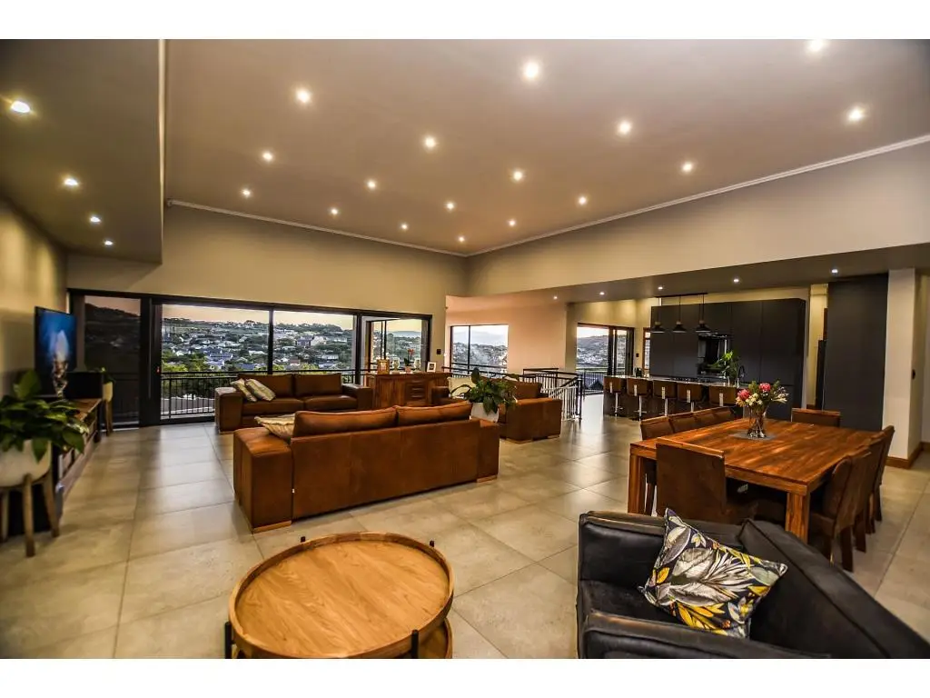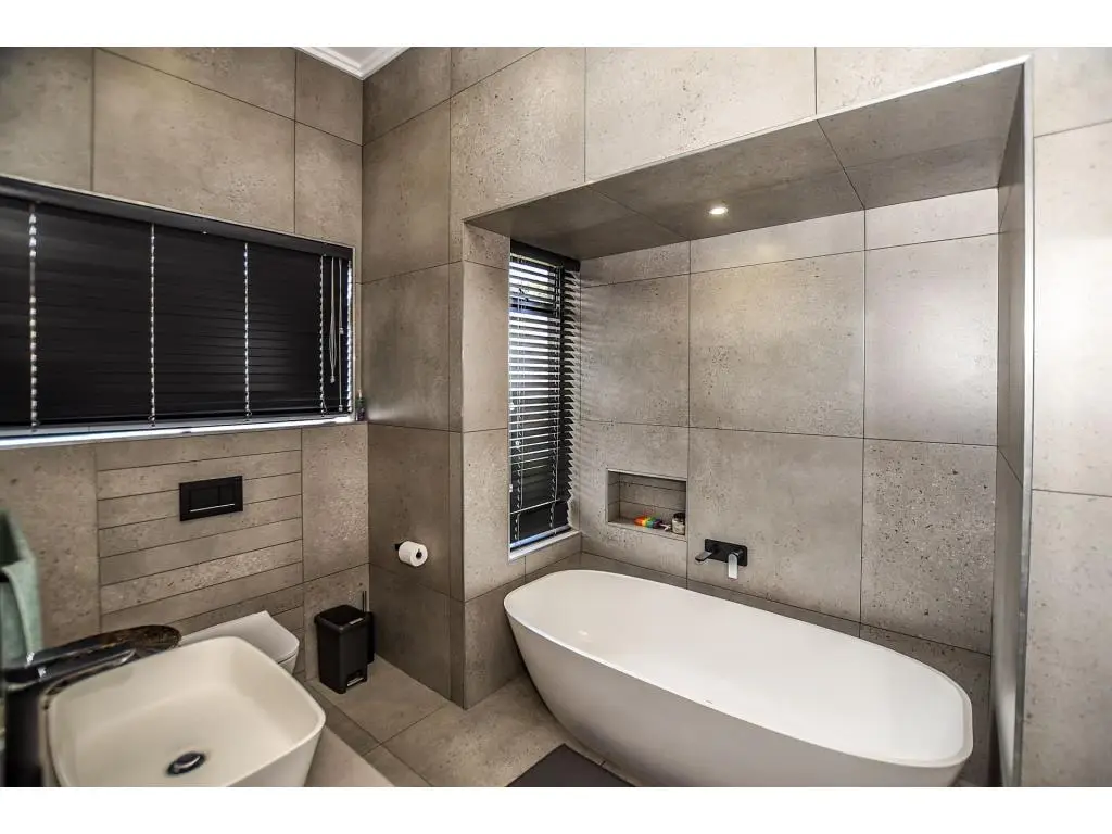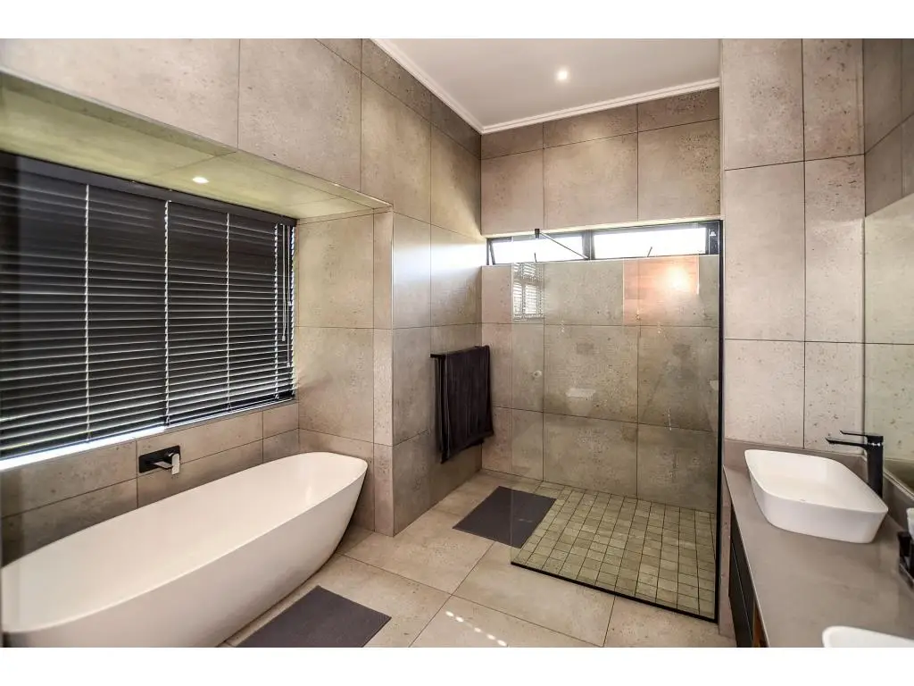 It won't be easy to click out of holiday mode in this stylishly contemporary residence for the modern pleasure-seeker. Cool, calm, and sophisticated with a youthful edge, this functional home is enveloped in light and comfort. Crisp grey walls, beautifully tiled floors, and Caesarstone countertops create a style as timeless as the great view. The calming bushveld, captured through the extensive use of glass, will help you forget your city stress. This house screams "designer" and will reflect the personality and taste of those accustomed to the best in quality design, finishes and lifestyle This newly built home consists of 5 bedrooms, each bedroom with its own ensuite bathroom, large entertainment spaces, flow-through living area and a home office. A spacious 4 car garage with some storage space. The charming backyard boasts a patio dining space overlooking the swimming pool and the lawn with a computerised irrigation system. A rare opportunity. Early viewing is recommended.