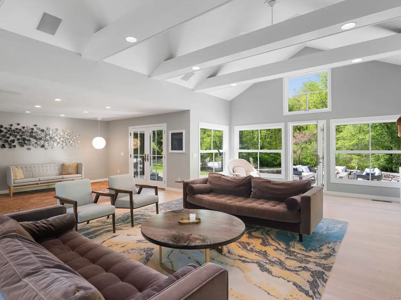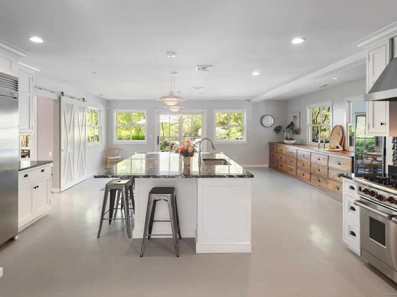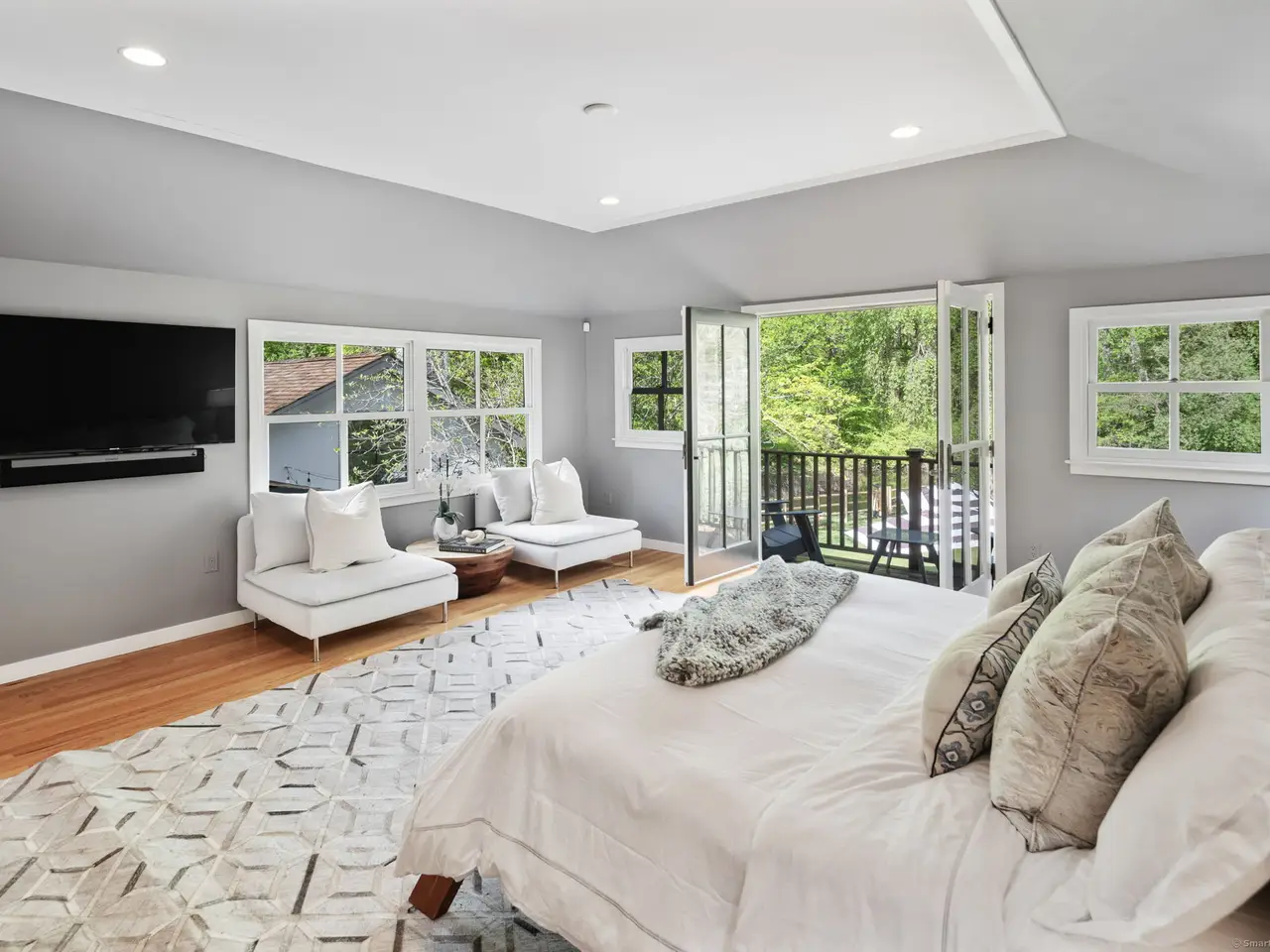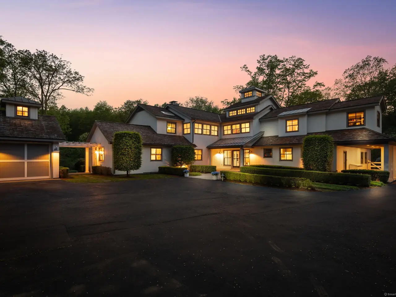 California meets New Canaan in this William Wurster inspired transitional-style masterpiece set on 2.54 private acres on New Canaan's desirable west side that's so convenient to town. This extensively renovated home has over 100 custom windows and 16 doors bringing the outside in from every room. Amazing sun-drenched living space with wonderful views from EVERYWHERE. French doors lead to expansive bluestone terraces, a beautiful gas fire pit for entertaining, meticulously manicured flower gardens, pool, spa and river. Five bedrooms, four-car garages, au pair suite and an exceptionally designed layout make this home a sensational haven with the warmth of a colonial but so fresh!