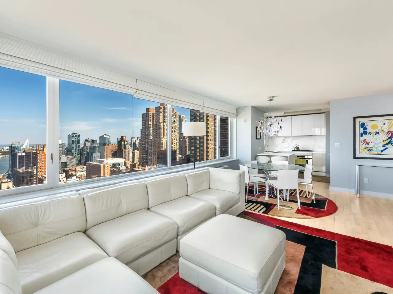 This contemporary high-end furnished two bedroom home has two baths with a fantastic primary bath that contains double sinks and a soaking tub along with a shower stall. The primary bedroom is huge along with a walk in closet. You'll see stunning panoramic views facing the Hudson River and the southern skyline. The nice open kitchen is perfect for entertaining. Enjoy the building with the most spectacular amenities in town! Situated on the 57th and 58th floors facing every direction, you get panoramic views from every angle. There are two resident lounges available for events and parties, a pool with decking, BBQ's with tables and chairs, saunas, steam rooms, a fully equipped gym and yoga room, 12 free classes a week, and massages and facials available at extra charge. In addition, you have a temperature controlled storage room, a garage, a bike room, and a pet spa. This neighborhood is incomparable, with eclectic restaurants and boutiques in the surrounding area, and The Columbus Circle Shopping Mall with Whole Foods, a block away. Available furnished , 6 months to 1 year