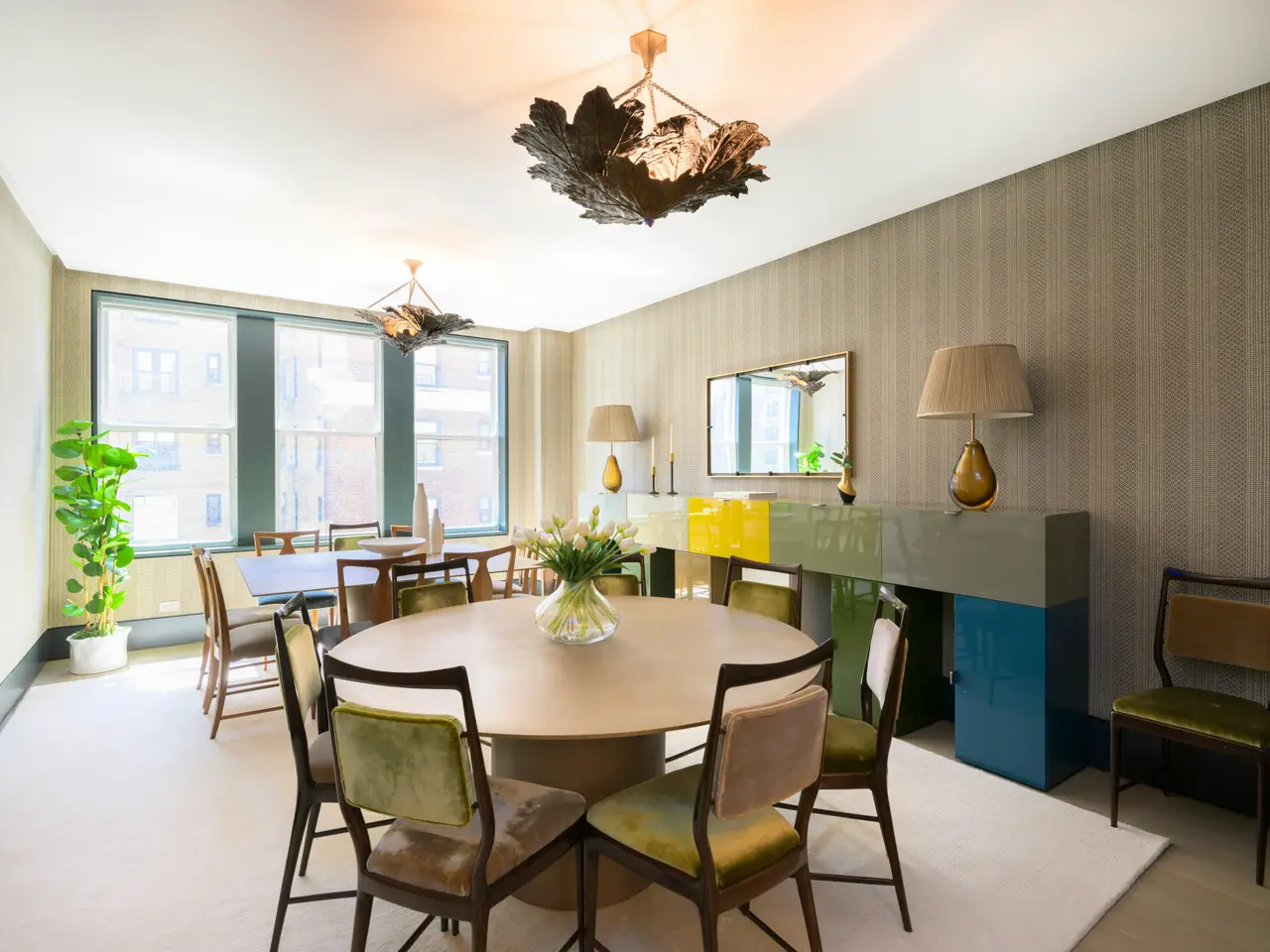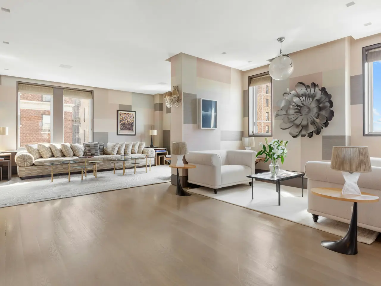 ICONIC WEST END AVE AD100 DESIGNER DUPLEX An extraordinary offering of an AD100 designer, high-floor duplex boasting approximately 4,300 SF of brilliantly designed interior space in a handsome, full-service prewar cooperative on beautiful West End Avenue. Realized through an extensive and meticulous renovation, Residence 9/10C is an exceptional representation of prewar scale and contemporary architecture perfected by renowned designer Muriel Brandolini. This residence consists of a 10th floor entertaining level with a massive entertaining living room, a grand formal dining room, a stylish library with wet bar, a sprawling double-windowed eat-in kitchen and a windowed powder room. Plus, a 9th floor bedroom level with a large south-facing den/media room, five bedrooms, three bathrooms and a dedicated laundry room. The entire home is powered by a Crestron system, and there is central air conditioning throughout as well as built-in sound. The living room stretches approximately 40 feet across with 7 windows in three directions overlooking neighborhood brownstones, the Hudson River and the foliage of Riverside Park. The room was thoughtfully designed, at present offering three distinct seating areas for cozy daily lounging and/or grand entertaining. Adjacent, the south-facing library is a divine medley of shape, texture and function with custom geometric built-in bookcases for both display and savvy storage, supplementing a large customized walk-in china closet. The library and living room are divided by a beautifully appointed wet bar with an integrated subcounter wine refrigerator. The south wing is completed by a large formal dining room, perfect for hosting even the most elaborate of dinner parties. Facing north on this floor is a double-windowed eat-in kitchen, a chef's paradise and the perfect setting for casual meals and intimate gatherings. The kitchen includes Bianca Dolomiti marble countertops and floor-to-ceiling cabinetry. There is a double sink with water filtration and a Wolf stainless steel 6-burner gas range with a grill, a double oven and a professional grade vented hood. The remaining appliances have all been integrated into the cabinetry, including two Subzero refrigerators with four freezer drawers and two full-size Miele dishwashers. There are three Subzero wine refrigerators in the kitchen, bringing total storage capacity to approximately 400 bottles. A stunning custom staircase leads to the 9th floor bedroom level, also directly accessible via the building's 9th floor landing. The massive corner primary suite showcases vistas of the Hudson River from its bedroom and its double-windowed bath. The five-fixture primary bathroom is clad in book-matched Bianco Calacatta marble slab to the ceiling with a large bronze-mounted floating Emerald Onyx double vanity. There is a glass-enclosed rain shower with vistas of the river as well as a deep Zuma Jacuzzi tub. The dressing room is outfitted for even the most extensive of wardrobes. There are four additional bedrooms, each with designer finishes and customized closets. The bathrooms servicing the ancillary bedrooms are finished in Bianco Calacatta marble and cleverly share a large central shower which can easily be divided into two fully separated full bathrooms if preferred. The lower level is rounded out by a large den with a Dolby sound system, a giant cedar walk-in closet and a large windowed laundry room with an industrial-size vented washer/dryer which can be converted to another bathroom if desired. Built in 1910, 465 West End Avenue is a distinguished full-service prewar cooperative designed in the Italian Renaissance style. There is a 24-hour doorman as well as a live-in resident manager. The building has a gym, private storage and bicycle storage. Located on a prime stretch of West End Avenue, Riverside Park is one block away as are the many fine entertainment and lifestyle amenities of the Upper West Side. Pets are welcome, and financing is up to 80%.