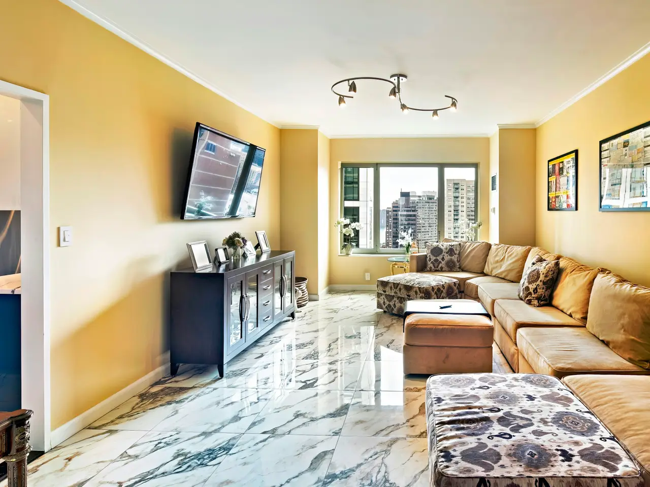 Enter this magnificent, light filled home through a marble gallery with a north facing living room and balcony and a south facing formal dining room with views of the city skyline including the Chrysler Building. The windowed kitchen has been totally renovated with blue and white custom cabinetry and porcelain floors and backsplash. There is an additional prep sink and a washer and dryer. The primary bedroom has a luxurious bath with a large walk in shower. There are abundant closets and spectacular south and west views. There are an additional two bedrooms and baths as well as a powder room. Nine foot ceilings throughout as well as NEW Tilt and Turn windows enhance this move in ready home on the 31st floor of The Sovereign. Emery Roth and Sons designed the Sovereign, one of the most renowned post war cooperatives. The building is surrounded by park like gardens and seating. The elegant and impressive International Style lobby has soaring ceilings accented by the sparkle of hand blown 1950's Venini chandeliers, designed by the Italian Architect Carlo Scarpa. Enhancing the mid-century lobby are its original Rosewood panels, travertine marble floors and collection of curated paintings. Enjoy the lobby level gym, 24 hr. valet garage and wonderful luxury service including on-site management. There is a bike room and private storage. There is also year round A/C with individual controls in each room. The Board permits pets (up to two dogs). Pied-a-terre and purchase in a Trust and LLC's are permitted with Board Approval.