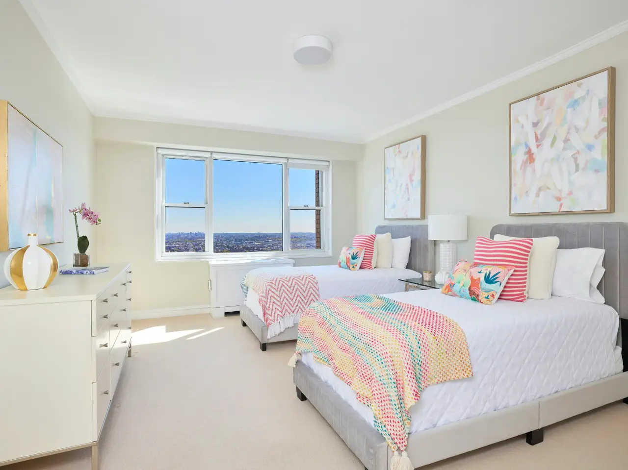 Prepared to be wowed! Perched on the forty first floor, this two bedroom two and a half bathroom home has sweeping River and City views. The oversized living room and den/dining room provide ample space for entertaining as well as quiet enjoyment. A separate spacious breakfast room facing south adjoins a renovated cook's kitchen with top of the line appliances. Both bedrooms enjoy river views. The primary bedroom has a an en-suite bath and several large closets. There is a generously sized second bedroom and bath. Additionally, there is a powder room and washer/dryer. Sixty East End is a full service building with a gym, storage and a garage with low rates for tenant/shareholders. There is a newly renovated lobby and gracious circular driveway for easy access and only three apartments per floor. The building is located across from the East River Promenade, near Carl Schurz Park and close to many modes of public transportation.