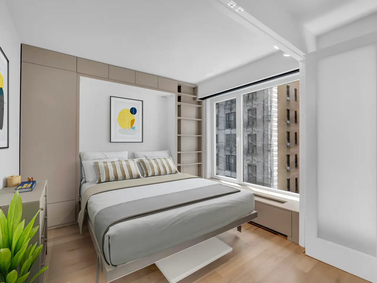 Sponsor Unit - No Board Approval Sleek & Spacious Renovation with Designer Finishes Welcome to a brand-new, gut-renovated 2-bedroom, 2-bathroom home with a flexible layout that includes a custom-built home office or convertible guest bedroom featuring a built-in Murphy bed. This sponsor unit requires no board approval and offers seamless luxury living, just a few steps from Central Park. Custom Design & High-End Details Thoughtfully reimagined with exquisite materials and craftsmanship, this sun-filled home showcases: - Honed Carrara marble baths with spa-level finishes - Wide-plank walnut flooring throughout - Louis Poulsen designer lighting fixtures - Large south-facing windows Luxury Chef's Kitchen The kitchen is a minimalist masterpiece, boasting: - Sleek custom cabinetry - High-end appliances - Waterfall marble countertops with matching full-height backsplash - Built-in microwave and full-size dishwasher Primary Suite Retreat The oversized primary bedroom features: - A custom walk-in closet with built-ins - Electric blackout shades - An en-suite spa bathroom with a large walk-in glass shower and elegant fixtures Flexible Second Bedroom / Office Behind glass-paneled French doors, the second bedroom features a built-in Murphy bed, making it an ideal space for a guest suite, home office, or both. Modern Comforts - Bosch in-unit washer/dryer - Multiple large closets and smart storage throughout - Central heating and cooling are controlled via a remote and programmable thermostat - Sleek remote-controlled electric shades White-Glove Amenities - 24/7 doorman and concierge - Live-in resident manager - Fitness center - On-site valet services (housekeeping, laundry, dry cleaning) - Bike room and on-site garage (additional cost) - Central laundry facility Prime Central Park South Location Just outside your door: Central Park, Columbus Circle, Time Warner Center, Whole Foods, Michelin-starred restaurants, Fifth Avenue shopping, and access to every major subway line. (Some photos are virtually staged)