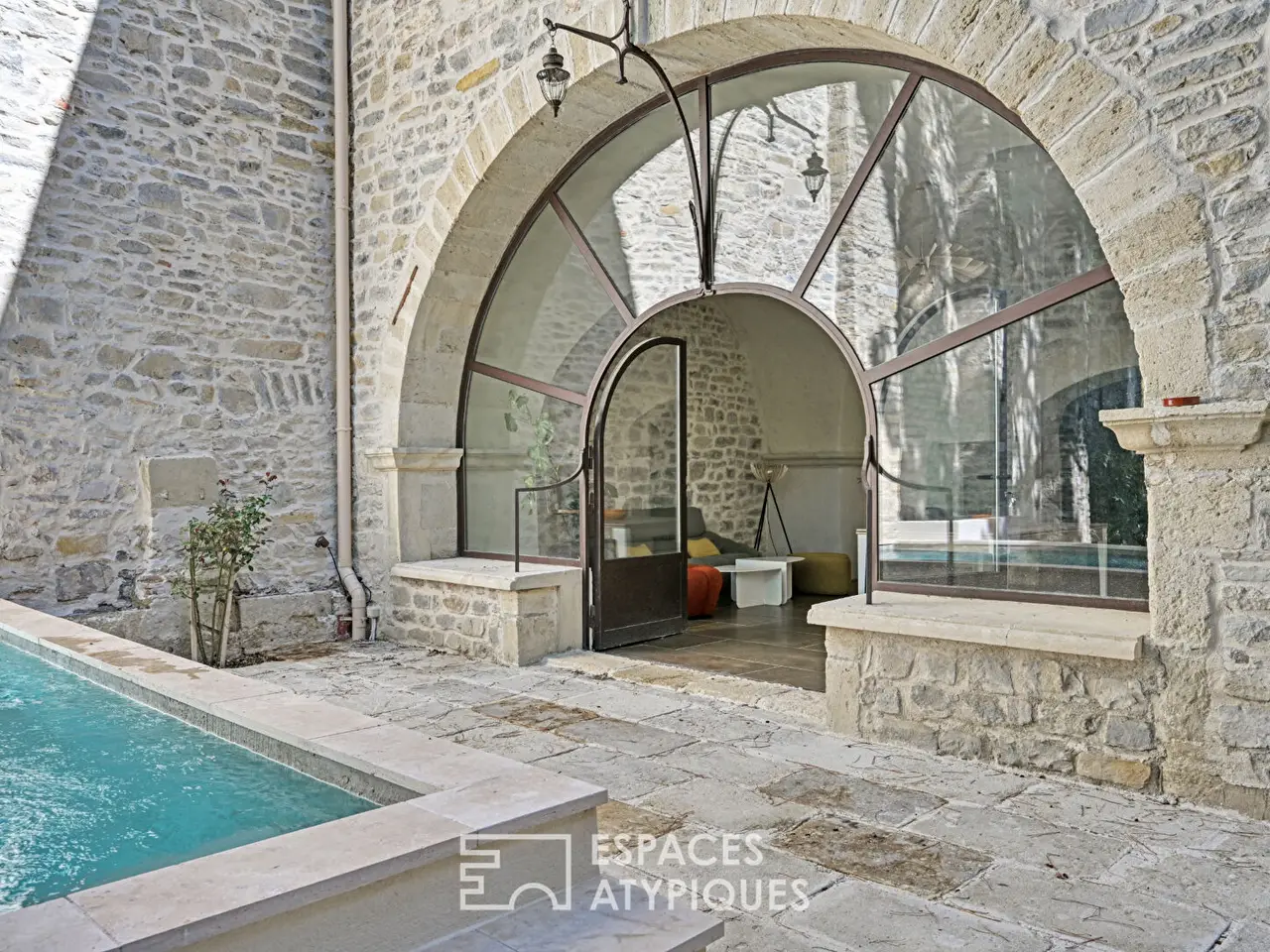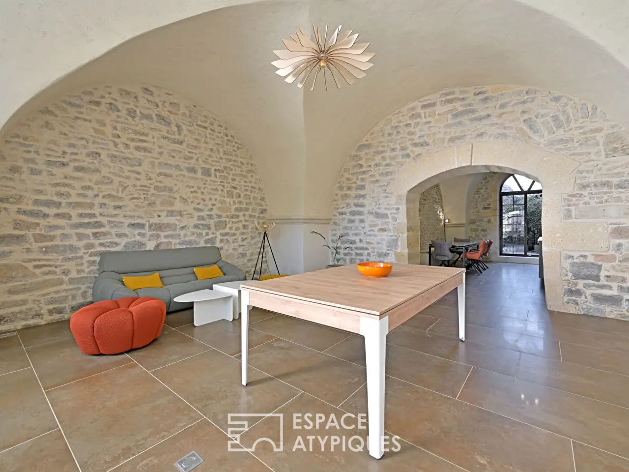 Rare and exclusive, this former 17th-century presbytery located in a sought-after village in the Vaunage region stands out as an exceptional residence where history and contemporary elegance interact in perfect harmony. From the entrance, enhanced by a wrought iron gate, the tone is set: the view opens onto a garden adorned with majestic listed pines, an elegant swimming pool, and the noble silhouette of the stone building. The charm works instantly, revealing a unique place in the heart of the village, both protected and open to the light. The property develops approximately 237 sqm on 2 levels on a plot of 490 sqm. Inside, the volumes surprise and seduce. A spectacular cathedral-style living room, culminating at more than 8 meters, deploys passageways and a footbridge in wood and metal made by a companion with remarkable expertise. The light invites itself generously, magnifying the materials and architectural details. In addition, a refined living room with a fireplace opens through an arched window onto the terrace and the swimming pool, and on the other hand onto the high-end kitchen. A true heart of life, it is organized around a central island covered with a ceramic worktop and extends towards an intimate patio, a beautiful source of light. The upper floor, dressed in a beautiful parquet floor with an aged appearance, accommodates a complete master suite, two other bedrooms, a separate bathroom and a mezzanine of more than 30 sqm offering an aerial perspective on the house. Outside, the vast courtyard and the garden create a setting of rare serenity. The listed pine trees cast their majestic shadows, the swimming pool nestles there, sheltered from view, and the atmosphere, both peaceful and refined, invites you to let go. A bicycle garage, a utility room and storage spaces complete the property. More than a house, this revisited presbytery is a true signature. An exceptional alliance between the prestige of a centuries-old heritage and the contemporary art of living. ENERGY CLASS: A / CLIMATE CLASS: A Estimated average amount of annual energy expenditure for standard use, established from energy prices for the year 2025: between EUR1,120 and EUR1,580 Information on the risks to which this property is exposed is available on the Georisques website: www.georisques.gouv.fr Contact: Claudine 06 22 17 01 66 REF. 12632 Additional information * 6 rooms * 3 bedrooms * 1 bathroom * 1 bathroom * Outdoor space : 490 SQM * Parking : 4 parking spaces * Property tax : 2 416 € Energy Performance Certificate Primary energy consumption a : 62 kWh/m2.year High performance housing