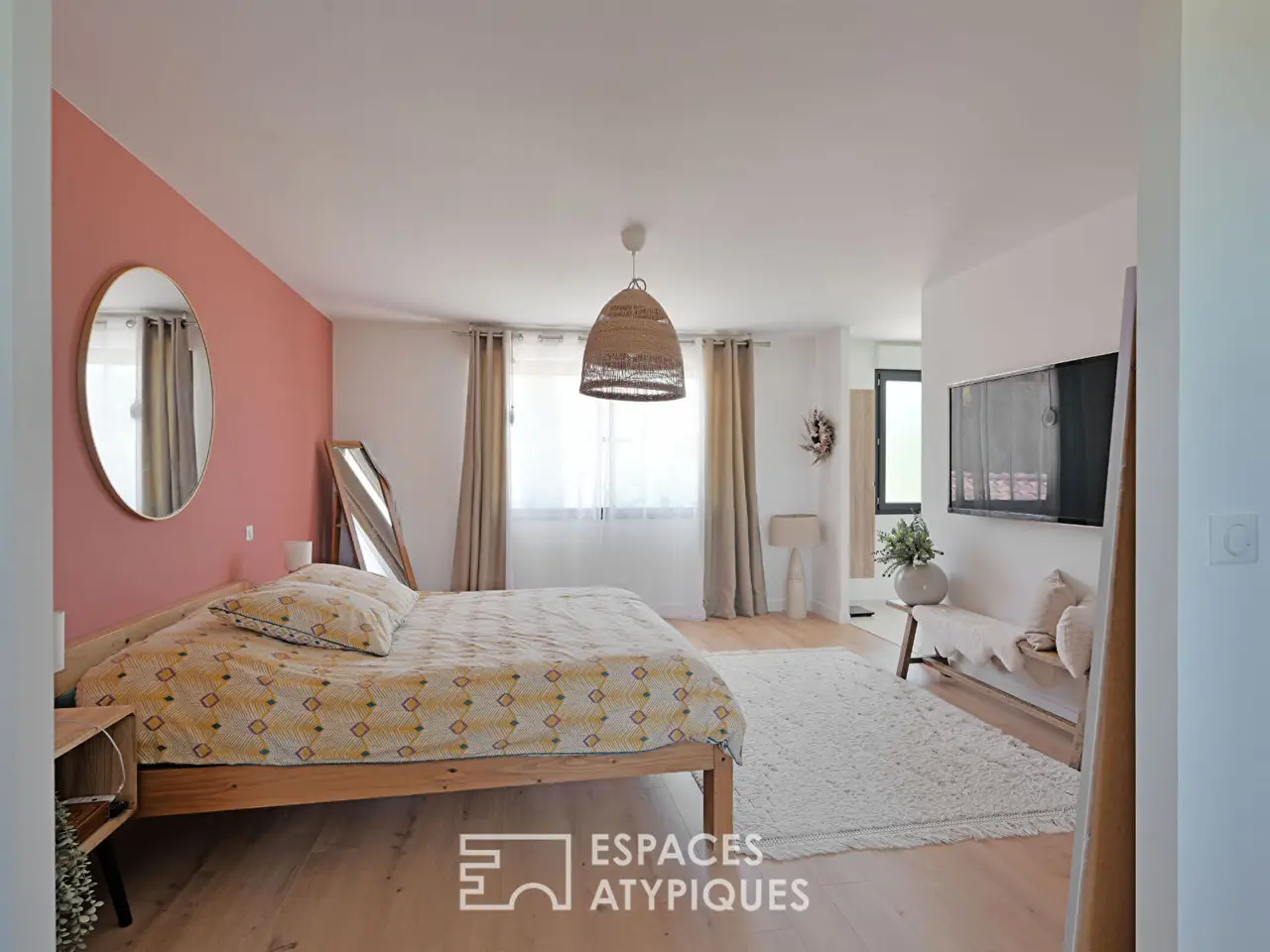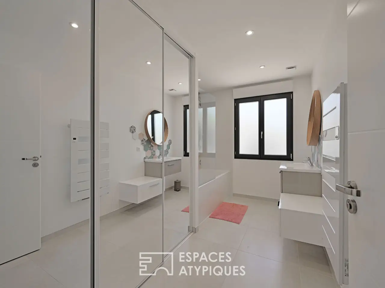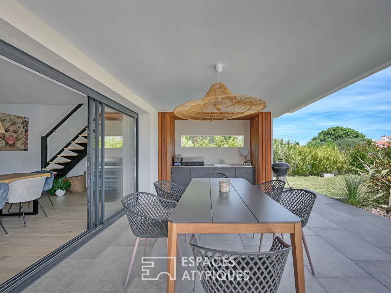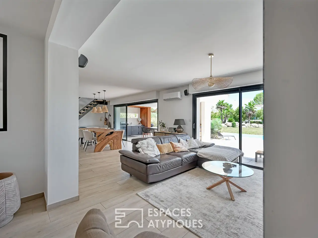 In the popular Pic St Loup area near Teyran, we offer you this elegant and refined villa nestled in a magnificent natural environment. Located very quietly, the villa offers 200 m2 of living space on a plot of 2,000 sqm including a buildable and separable annex garden of 470 sqm. As soon as you enter with a glass roof style, you discover through transparency generous and bright living spaces enhanced by a very modern and extremely warm decoration. An open kitchen with central island, combining aesthetics and quality, offers a practical and elegant culinary space. The large and bright living room opens very widely to the exterior spaces including a large and very friendly covered terrace, a real annex living room with a summer kitchen. Let's discover this splendid garden, a beautiful natural setting, adorned with sought-after plants, including a majestic olive tree approximately 600 years old, a symbol of serenity and longevity. A superb swimming pool with submerged beach, a spa and a wooden terrace with a solarium feel harmoniously completes the premises. On one level, the villa also offers an office as well as a large multifunctional room/laundry room. The first floor offers a very beautiful master suite of 35 m2, equipped with a dressing room and a private bathroom as well as two bright bedrooms and a bathroom. A tiled garage of more than 50 m2, a large courtyard, a bowling alley, a borehole and a recent photovoltaic installation further complete the premises. Nothing is missing and nothing is left to chance in this exceptional property combining luxury, comfort, nature and proximity (30 minutes from the airport or beaches, 20 minutes from Sommieres). ENERGY CLASS: B / CLIMATE CLASS: A Estimated average amount of annual energy expenditure for standard use, established based on energy prices for the year 2024: between EUR1,140 and EUR1,610. REF. 9817 Additional information * 6 rooms * 4 bedrooms * 1 bathroom * 1 bathroom * Outdoor space : 2000 SQM * Property tax : 2 038 € Energy Performance Certificate Primary energy consumption b : 80 kWh/m2.an High performance housing